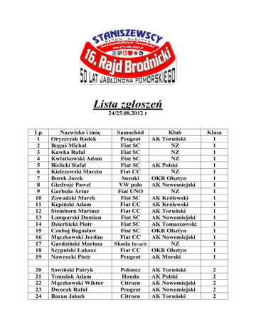 Lista zgłoszeń 24/25.08.2012 r Lp 1 2 3 4 5 6 7 8 9 10 11 12 13 14 15 16 17 18 19 Nazwisko i imię Oryszczak Radek Boguś Michał Kawka Rafał Kwiatkowski Adam Bielicki Rafał Kielczewski Marcin Borek Jacek Giedrojć Paweł Garbula Artur Zawadzki Marek Kępiński Adam Steinborn Mariusz Lamparski Damian Dzierbicki Piotr Czubaj Bogusław Mączkowski Jordan Gardziński Mariusz Szypulski Łukasz Nawrocki Piotr Samochód Peugeot Fiat SC Fiat SC Fiat SC Fiat SC Fiat CC Suzuki VW polo Fiat UNO Fiat SC Fiat CC Fiat CC Fiat SC Fiat SC Fiat SC Fiat CC Skoda favorit Fiat CC Peugeot Klub AK Toruński NZ NZ NZ AK Polski NZ OKR Olsztyn AK Nowomiejski NZ AK Królewski AK Królewski AK Toruński AK Nowomiejski AK Tomaszowski OKR Olsztyn AK Nowomiejski NZ OKR Olsztyn AK Morski Klasa 1 1 1 1 1 1 1 1 1 1 1 1 1 1 1 1 1 1 1 20 21 22 23 24 Sowiński Patryk Tomalak Adam Mączkowski Wiktor Dworak Rafał Baran Jakub Polonez Honda Citroen Peugeot Citroen AK Toruński AK Polski AK Nowomiejski AK Nowomiejski AK Toruński 2 2 2 2 2 25 26 27 28 29 30 31 32 33 34 Kozłowski Michał Sławiński Dawid Dwornik Sebastian Jankowski Wojciech Turulski Marcin Błaszkowski Tomasz Kowalewski Paweł Mikołajski Jacek Lewandowski Maciej Pietrzak Andrzej 35 36 37 38 39 40 41 42 43 Peugeot Mitshubishi Honda Peugeot Honda Peugeot BMW Peugeot Peugeot Honda CRX AK Nowomiejski AK Lubawski AK Ziemi Tyskiej AK Nowomiejski AK Nowomiejski AK Nowomiejski AK Włocławski AK Toruński AK Toruński AK Włocławski 2 2 2 2 2 2 2 2 2 2 Wyrzykowski Daniel Honda Nowicki Łukasz Renault Swedura Artur Ford Kornatowski Adam Opel astra Domżalski Marcin Opel Marchewicz Andrzej Opel Walczewski Radek Renault Clio Renault megane Erdmann Maciej Poczwardowski Hubert Renault CLIO AK Nowomiejski AK Warmiński AK Toruński AK Toruński AK Warmiński AK Morski NZ AK Bydgoski AK Toruński 3 3 3 3 3 3 3 3 3 44 45 46 47 48 49 Tworski Maciej Nowak Daniel Domżalski Łukasz Tarazewicz Jacek Tyc Arkadiusz Wojtanka Adam AK Toruński AK Tomaszowski MKMRP Rajdowy Gorzów AK Włocławski Team 50 4 4 4 4 4 4 50 51 52 Staniszewski Zbigniew Bilski Marcin Witkowski Mirosław Subaru Subaru Audi Subaru Subaru Subaru Mitshubishi AK Polski Subaru AK Kuj-Pom Mitshubishi AK Toruński na dzień 2012.08.21 Gość Gość Gość