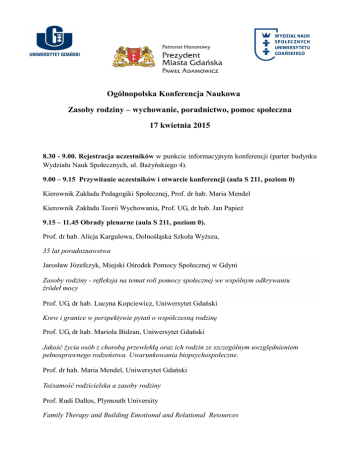 Ogólnopolska Konferencja Naukowa Zasoby rodziny – wychowanie, poradnictwo, pomoc społeczna 17 kwietnia 2015 8.30 - 9.00. Rejestracja uczestników w punkcie informacyjnym konferencji (parter budynku Wydziału Nauk Społecznych, ul. Bażyńskiego 4). 9.00 – 9.15 Przywitanie uczestników i otwarcie konferencji (aula S 211, poziom 0) Kierownik Zakładu Pedagogiki Społecznej, Prof. dr hab. Maria Mendel Kierownik Zakładu Teorii Wychowania, Prof. UG, dr hab. Jan Papież 9.15 – 11.45 Obrady plenarne (aula S 211, poziom 0). Prof. dr hab. Alicja Kargulowa, Dolnośląska Szkoła Wyższa, 35 lat poradoznawstwa Jarosław Józefczyk, Miejski Ośrodek Pomocy Społecznej w Gdyni Zasoby rodziny - refleksja na temat roli pomocy społecznej we wspólnym odkrywaniu źródeł mocy Prof. UG, dr hab. Lucyna Kopciewicz, Uniwersytet Gdański Krew i granice w perspektywie pytań o współczesną rodzinę Prof. UG, dr hab. Mariola Bidzan, Uniwersytet Gdański Jakość życia osób z chorobą przewlekłą oraz ich rodzin ze szczególnym uwzględnieniem pełnosprawnego rodzeństwa. Uwarunkowania biopsychospołeczne. Prof. dr hab. Maria Mendel, Uniwersytet Gdański Tożsamość rodzicielska a zasoby rodziny Prof. Rudi Dallos, Plymouth University Family Therapy and Building Emotional and Relational Resources 11.45-12.15 Przerwa kawowa (poziom -1) Obrady w sekcjach tematycznych (wystąpienia około 15 minutowe) 12.15-15.00 Sekcja pierwsza, aula S211 (poziom 0), Prowadzący: prof. UG, dr hab. Jolanta Wojciechowska (Uniwersytet Gdański), dr hab. Izabela Krasiejko (Akademia im. Jana Długosza w Kielcach) 1. Dr Małgorzata Ciczkowska-Giedziun, Mgr Magdalena Dymowska, Uniwersytet Warmińsko-Mazurski w Olsztynie, Zasoby rodziny wyzwaniem dla pracy socjalnej – komunikat z badań. 2. Dr Anna Kola, Uniwersytet Mikołaja Kopernika w Toruniu, Interdyscyplinarne badania rodziny w perspektywie antropologii pracy socjalnej 3. Dr Jolanta Sokołowska, Uniwersytet Gdański, Rodzina dysfunkcyjna - praca na zasobach. Możliwości i ograniczenia. 4. Mgr Katarzyna Łangowska, MOPS w Gdyni, Dobre pomaganie – gdyńskie doświadczenia pomocy społecznej w obszarze wsparcia rodzin. 5. Mgr Alina Cystewska, Miejski Ośrodek Pomocy Rodzinie w Sopocie, Jak skutecznie pomagać rodzinie dysfunkcyjnej – dobre praktyki pracy MOPS w Sopocie 6. Dr Joanna Rajewska de Mezer, Uniwersytet Adama Mickiewicza w Poznaniu, Rola specjalistycznego poradnictwa prawnego we wsparciu rodzin – beneficjentów pomocy społecznej. 7. Dr Majka Łojko, Uniwersytet Warmińsko-Mazurski w Olsztynie, Rodzina bezrobotna w pracy socjalnej – w stronę aktywnej polityki zatrudnienia i rynku pracy 8. Dr Sylwia Kita, Akademia im. Jana Długosza w Częstochowie, Praca socjalna w pracy z dzieckiem w rodzinie dotkniętej żałobą. 9. Dr Izabela Kaźmierczak-Kałużna, Uniwersytet Zielonogórski, Na krętych ścieżkach edukacji. Edukacyjne szanse i ograniczenia dzieci z rodzin wspieranych przez instytucjonalną pomoc społeczną 10. Dr Marcin Boryczko, Uniwersytet Gdański, O faktach i mitach rodziny w XXI wieku 12.15-15.00 Sekcja druga, sala A 201 (poziom 0), Prowadzący: dr Alicja Zbierzchowska, (Uniwersytet Gdański), dr Joanna Nowak (Państwowa Wyższa Szkoła Zawodowa w Elblągu) 1. Prof. dr hab. Andrzej Olubiński, Uniwersytet Warmińsko-Mazurski w Olsztynie, Konflikty rodzinne jako zasób czy zagrożenie? 2. Dr hab. prof. DSW Bożena Wojtasik, Dr Anetta Pereświet-Sołtan, Dolnośląska Szkoła Wyższa, Konstruktywne sposoby radzenia sobie z sytuacją kryzysową w rodzinie 3. Dr Ewa Dybowska, Akademia Ignatianum w Krakowie, Spokojniejsze, łatwiejsze, szczęśliwsze rodzicielstwo według Noël Janis-Norton 4. Mgr Kamila Olga Stępień, Uniwersytet Gdański, Praca i rodzina czyli współczesne wychowywanie w perspektywie kariery życiowej 5. Dr Monika Bokiniec, Dr Sylwester Zielka, Uniwersytet Gdański, Dlaczego w Polsce tylko matki mają dzieci? Zmiany modelu ojcostwa w dyskursie medialnym 6. Dr Łukasz M. Ratajczak, Uniwersytet Adama Mickiewicza w Poznaniu, Zasoby niepełnoletnich ojców w zmaganiu się przez nich z trudnościami przedwczesnego rodzicielstwa 7. Mgr Paweł Śpica, Uniwersytet Gdański, Doświadczenie chrześcijańskiej wspólnoty a współuczestnictwo ojca w wychowaniu dziecka w poglądach młodych ojców, członków wspólnoty Efraim z Gdańska 8. Dr Joanna Nowak, Państwowa Wyższa Szkoła Zawodowa w Elblągu, Konteksty życia rodzinnego w narracjach osób młodych 9. Dr Damian Labiak, Uniwersytet Warmińsko-Mazurski w Olsztynie, Wybrane dylematy transmisji systemu wartości w środowisku rodzinnym (w kontekście wartości współczesnej popkultury muzycznej) 10. Dr Anna Leszczyńska-Rejchert, Uniwersytet Warmińsko-Mazurski w Olsztynie, Seniorzy a zasoby rodziny 11. Dr Aneta Mac, Uniwersytet Adama Mickiewicza w Poznaniu, Rola babci i dziadka we współczesnej rodzinie w opiniach wnuków 12.15-15.00 Sekcja trzecia, sala A 205 (poziom 0), Prowadzący: dr Katarzyna KmitaZaniewska (Uniwersytet Gdański), dr Katarzyna Wajszczyk (Uniwersytet Gdański) 1. Dr Karolina Kuryś-Szyncel, Dr Barbara Jankowiak, Uniwersytet Adama Mickiewicza w Poznaniu, Rodzina jako system autopojetyczny – w poszukiwaniu kreatywnego wzorca 2. Dr Barbara Lulek, Uniwersytet Rzeszowski, Rodzice – nieujawniane czy niewykorzystane zasoby w procesie edukacji dziecka? 3. Dr Renata Wawrzyniak-Beszterda, Dr Sylwia Jaskulska, Uniwersytet Adama Mickiewicza w Poznaniu, Szkoła i uniwersytet jako beneficjenci (?) zasobów rodzinnych ucznia/studenta 4. Mgr Małgorzata Dyrdół, Mgr Patrycja Wesołowska, Uniwersytet Adama Mickiewicza w Poznaniu, Świadomość pedagogiczna i prawna – dotycząca praw dziecka i władzy rodzicielskiej – jako zasób rodziny 5. Mgr Sylwia Polcyn-Matuszewska, Uniwersytet Adama Mickiewicza w Poznaniu, Współczesna rodzina w obliczu nowych mediów – gry komputerowe i inne internetowe formy rozrywki dzieci i młodzieży 6. Suska-Kuźmicka Monika, Uni