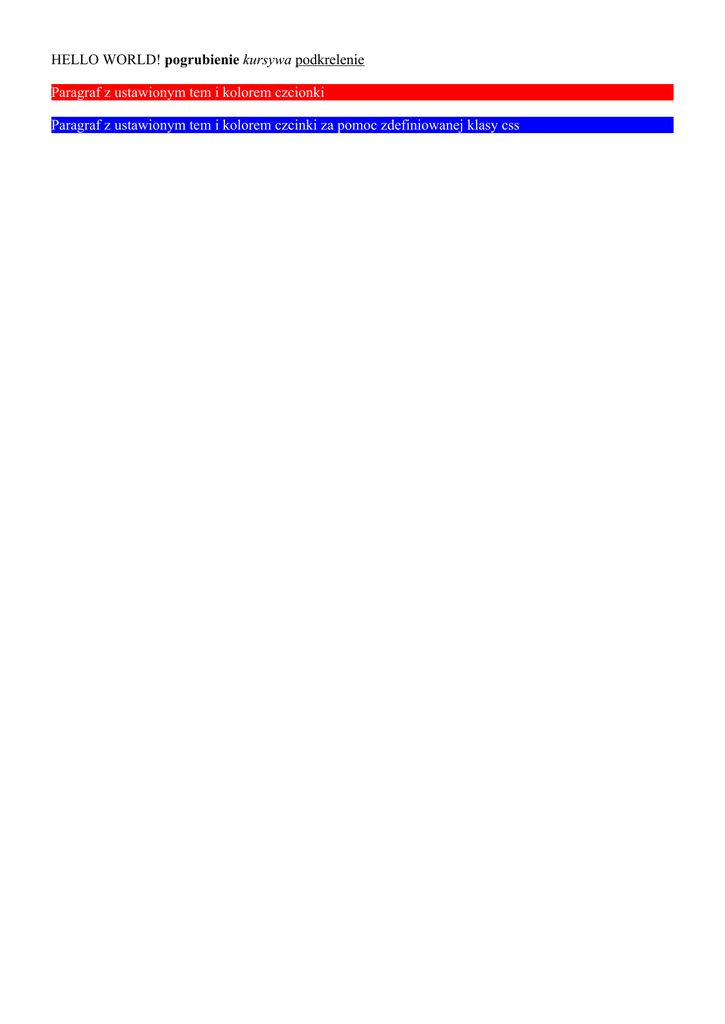 HELLO WORLD! pogrubienie kursywa podkrelenie Paragraf z ustawionym tem i kolorem czcionki Paragraf z ustawionym tem i kolorem czcinki za pomoc zdefiniowanej klasy css