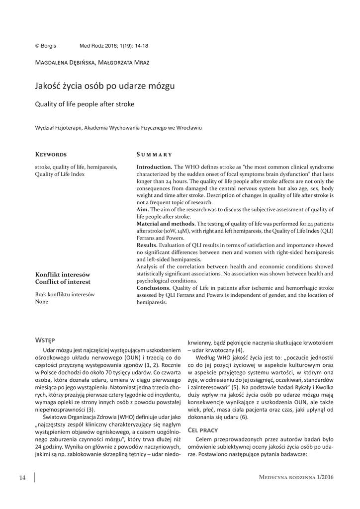 © Borgis Med Rodz 2016; 1(19): 14-18 Magdalena Dębińska, Małgorzata Mraz Jakość życia osób po udarze mózgu Quality of life people after stroke Wydział Fizjoterapii, Akademia Wychowania Fizycznego we Wrocławiu Keywords Summary stroke, quality of life, hemiparesis, Quality of Life Index Introduction. The WHO defines stroke as “the most common clinical syndrome characterized by the sudden onset of focal symptoms brain dysfunction” that lasts longer than 24 hours. The quality of life people after stroke affects are not only the consequences from damaged the central nervous system but also age, sex, body weight and time after stroke. Description of changes in quality of life after stroke is not a frequent topic of research. Aim. The aim of the research was to discuss the subjective assessment of quality of life people after stroke. Material and methods. The testing of quality of life was performed for 24 patients after stroke (10W, 14M), with right and left hemiparesis, the Quality of Life Index (QLI) Ferrans and Powers. Results. Evaluation of QLI results in terms of satisfaction and importance showed no significant differences between men and women with right-sided hemiparesis and left-sided hemiparesis. Analysis of the correlation between health and economic conditions showed statistically significant associations. No association was shown between health and psychological conditions. Conclusions. Quality of Life in patients after ischemic and hemorrhagic stroke assessed by QLI Ferrans and Powers is independent of gender, and the location of hemiparesis. Konflikt interesów Conflict of interest Brak konfliktu interesów None Wstęp Udar mózgu jest najczęściej występującym uszkodzeniem ośrodkowego układu nerwowego (OUN) i trzecią co do częstości przyczyną występowania zgonów (1, 2). Rocznie w Polsce dochodzi do około 70 tysięcy udarów. Co czwarta osoba, która doznała udaru, umiera w ciągu pierwszego miesiąca po jego wystąpieniu. Natomiast jedna trzecia chorych, którzy przeżyją pierwsze cztery tygodnie od incydentu, wymaga opieki ze strony innych osób z powodu powstałej niepełnosprawności (3). Światowa Organizacja Zdrowia (WHO) definiuje udar jako „najczęstszy zespół kliniczny charakteryzujący się nagłym wystąpieniem objawów ogniskowego, a czasem uogólnionego zaburzenia czynności mózgu”, który trwa dłużej niż 24 godziny. Wynika on głównie z powodów naczyniowych, jakimi są np. zablokowanie skrzepliną tętnicy – udar niedo14 krwienny, bądź pęknięcie naczynia skutkujące krwotokiem – udar krwotoczny (4). Według WHO jakość życia jest to: „poczucie jednostki co do jej pozycji życiowej w aspekcie kulturowym oraz w aspekcie przyjętego systemu wartości, w którym ona żyje, w odniesieniu do jej osiągnięć, oczekiwań, standardów i zainteresowań” (5). Na podstawie badań Rykały i Kwolka duży wpływ na jakość życia osób po udarze mózgu mają konsekwencje wynikające z uszkodzenia OUN, ale także wiek, płeć, masa ciała pacjenta oraz czas, jaki upłynął od dokonania się udaru (6). Cel pracy Celem przeprowadzonych przez autorów badań było omówienie subiektywnej oceny jakości życia osób po udarze. Postawiono następujące pytania badawcze: Medycyna rodzinna 1/2016 Jakość życia osób po udarze mózgu 1. Czy na jakość życia osób po udarze mózgu ma wpływ lokalizacja niedowładu połowiczego? 2. Czy wiek i miejsce zamieszkania to czynniki istotnie wpływające na poziom jakości życia osób po udarze mózgu? 3. Czy istnieją związki między ocenianymi podskalami IJŻ (Indeks Jakości Życia) w aspekcie zadowolenia i ważności u osób po udarze mózgu? Materiał i metody Do badań zakwalifikowano grupę 24 pacjentów przebywających w Zakładzie Profilaktyczno-Leczniczym „PROVITA” oraz we Wrocławskim Centrum Rehabilitacji i Medycyny Sportowej. Wszyscy zostali poinformowani, jaki jest cel przeprowadzanych badań, a także każda z osób wyraziła pisemną zgodę na badanie. Na podstawie wywiadu zebrano informacje na temat: wieku, płci, rozpoznania, lokalizacji niedowładu połowiczego, chorób współistniejących oraz miejsca zamieszkania. Badaną grupę stanowiło 10 kobiet oraz 14 mężczyzn. 18 osób mieszkało w mieście, natomiast 6 zamieszkiwało wieś. Niedowład połowiczy prawostronny (NPP) występował u 10 osób (4K, 6M), natomiast niedowład połowiczy lewostronny (NPL) – u 14 osób (6K, 8M). Wszyscy badani deklarowali praworęczność. Do oceny jakości życia badanych osób został wykorzystany wskaźnik jakości życia (Quality of Life Index – QLI) Ferrans i Powers w wersji III ogólnej dla udaru w adaptacji polskiej dokonanej przez Krystynę Jaracz (1). Wskaźnik jakości życia obejmuje dwa aspekty: zadowolenie i ważność; wylicza się go na podstawie odpowiedzi na 33 pytania w sześciostopniowej skali. Obie części ankiety pogrupowane zostały na 4 podskale: zdrowia i funkcjonowania, socjoekonomiczną, psychologiczną/duchową oraz rodziny. Chorzy zostali zbadani jednorazowo. Analizę statystyczną przeprowadzono w programie Statistica 10. Do opisu zmiennych wykorzystano następujące obliczenia: średnia arytmetyczna, odchylenie standardowe, testy t-studenta, U Manna-Whitneya oraz korelacja porządku rang Spearmana. Za poziom istotności przyjęto p < 0,05. Wyniki Wyniki wskaźnika jakości życia w zakresie zadowolenia (Iz) oraz ważności (Iw) przedstawiono w tabeli 1. W celu wykazania wpływu lokalizacji niedowładu połowiczego na wynik IJŻ wyniki poddano analizie porównawczej. Uzyskany wynik świadczy o braku wpływu strony niedowładu na jakość życia osób po udarze mózgu (tab. 2). Dalsza analiza porównawcza dotyczyła płci oraz miejsca zamieszkania. Na jej podstawie nie wykazano różnic istotnych statystycznie między jakością życia kobiet i mężczyzn po udarze mózgu oraz między osobami zamieszkującymi miasto i wieś (tab. 3 i 4). Otrzym