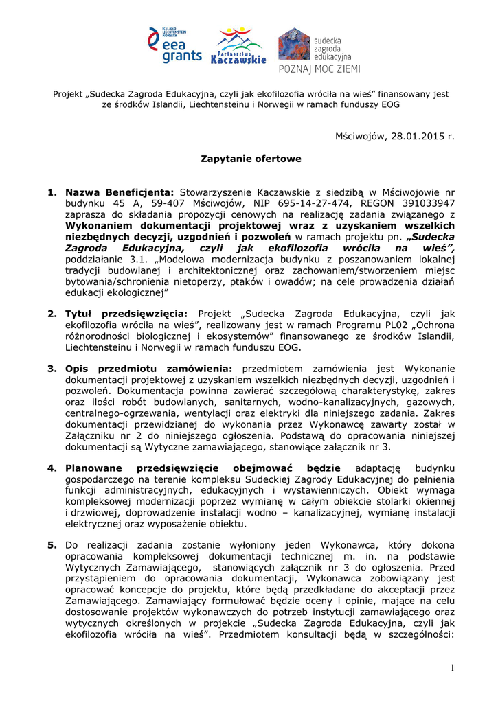 Projekt „Sudecka Zagroda Edukacyjna, czyli jak ekofilozofia wróciła na wieś” finansowany jest ze środków Islandii, Liechtensteinu i Norwegii w ramach funduszy EOG Mściwojów, 28.01.2015 r. Zapytanie ofertowe 1. Nazwa Beneficjenta: Stowarzyszenie Kaczawskie z siedzibą w Mściwojowie nr budynku 45 A, 59-407 Mściwojów, NIP 695-14-27-474, REGON 391033947 zaprasza do składania propozycji cenowych na realizację zadania związanego z Wykonaniem dokumentacji projektowej wraz z uzyskaniem wszelkich niezbędnych decyzji, uzgodnień i pozwoleń w ramach projektu pn. „Sudecka Zagroda Edukacyjna, czyli jak ekofilozofia wróciła na wieś”, poddziałanie 3.1. „Modelowa modernizacja budynku z poszanowaniem lokalnej tradycji budowlanej i architektonicznej oraz zachowaniem/stworzeniem miejsc bytowania/schronienia nietoperzy, ptaków i owadów; na cele prowadzenia działań edukacji ekologicznej” 2. Tytuł przedsięwzięcia: Projekt „Sudecka Zagroda Edukacyjna, czyli jak ekofilozofia wróciła na wieś”, realizowany jest w ramach Programu PL02 „Ochrona różnorodności biologicznej i ekosystemów” finansowanego ze środków Islandii, Liechtensteinu i Norwegii w ramach funduszu EOG. 3. Opis przedmiotu zamówienia: przedmiotem zamówienia jest Wykonanie dokumentacji projektowej z uzyskaniem wszelkich niezbędnych decyzji, uzgodnień i pozwoleń. Dokumentacja powinna zawierać szczegółową charakterystykę, zakres oraz ilości robót budowlanych, sanitarnych, wodno-kanalizacyjnych, gazowych, centralnego-ogrzewania, wentylacji oraz elektryki dla niniejszego zadania. Zakres dokumentacji przewidzianej do wykonania przez Wykonawcę zawarty został w Załączniku nr 2 do niniejszego ogłoszenia. Podstawą do opracowania niniejszej dokumentacji są Wytyczne zamawiającego, stanowiące załącznik nr 3. 4. Planowane przedsięwzięcie obejmować będzie adaptację gospodarczego na terenie kompleksu Sudeckiej Zagrody Edukacyjnej do funkcji administracyjnych, edukacyjnych i wystawienniczych. Obiekt kompleksowej modernizacji poprzez wymianę w całym obiekcie stolarki i drzwiowej, doprowadzenie instalacji wodno – kanalizacyjnej, wymianę elektrycznej oraz wyposażenie obiektu. budynku pełnienia wymaga okiennej instalacji 5. Do realizacji zadania zostanie wyłoniony jeden Wykonawca, który dokona opracowania kompleksowej dokumentacji technicznej m. in. na podstawie Wytycznych Zamawiającego, stanowiących załącznik nr 3 do ogłoszenia. Przed przystąpieniem do opracowania dokumentacji, Wykonawca zobowiązany jest opracować koncepcje do projektu, które będą przedkładane do akceptacji przez Zamawiającego. Zamawiający formułować będzie oceny i opinie, mające na celu dostosowanie projektów wykonawczych do potrzeb instytucji zamawiającego oraz wytycznych określonych w projekcie „Sudecka Zagroda Edukacyjna, czyli jak ekofilozofia wróciła na wieś”. Przedmiotem konsultacji będą w szczególności: 1 Projekt „Sudecka Zagroda Edukacyjna, czyli jak ekofilozofia wróciła na wieś” finansowany jest ze środków Islandii, Liechtensteinu i Norwegii w ramach funduszy EOG pomieszczenia ekspozycyjno–warsztatowe, biblioteka, magazyn, biura i komunikacja oraz inne elementy prac budowlanych i wyposażenia. Konsultacje odbywać się będą w trybie spotkań z architektami i projektantami instalacji, formułowania opinii, konsultacji z niezależnymi ekspertami. Projekt zostanie skonsultowany z ekspertami w dziedzinach ornitologii, entomologii i chiropterologii w zakresie spełniania wymagań dotyczących ochrony synantropijnych gatunków ptaków, owadów i nietoperzy (konsultacje te gwarantuje i finansuje Zamawiający w ramach osobnego zamówienia). 6. Szacunkowa wartość zamówienia – 25 000 zł brutto, tj. 20.325,20 zł netto, co stanowi 4.788,15 euro – zgodnie z rozporządzeniem Prezesa Rady Ministrów. 7. Opracowując dokumentację Wykonawca może używać i wskazywać nazwy własne jednak jednocześnie powinien ująć zapis mówiący, iż należy przyjąć, że są to nazwy przykładowe. Do wszystkich nazw własnych należy dodać zapis „lub równoważne”. 8. Opis sposobu obliczania ceny ryczałtowej oferty. Oferent przedstawi w ofercie cenę całkowitą brutto obejmującą całość przedmiotu zamówienia, podając ją w zapisie liczbowym i słownie, zgodnie z treścią formularza ofertowego (zał. nr 1). 8.1.Zakres prac projektowych, który jest podstawą do określenia ceny musi być zgodny z wymaganiami Zamawiającego. Zamawiający dopuszcza możliwość podwykonawstwa, jednak za jakość i terminowość wykonania prac odpowiada w pełni główny wykonawca. 8.2.Cena ryczałtowa oferty musi zawierać wszystkie koszty związane z realizacją prac projektowych wynikające z dokumentów zapytania o cenę jak również nie ujęte w tej dokumentacji, a niezbędne do wykonania zadania np.: podatek VAT. 8.3.Do zakresu obowiązków Wykonawcy przedmiotu zamówienia w ramach ceny ryczałtowej wchodzić będzie również: 8.3.1. Pozyskanie niezbędnych map i uzgodnień przy sporządzaniu projektu, 8.3.2. Uzgodnienie wykonanego projektu z Zamawiającym przed uzyskaniem pozwolenia na budowę. 8.3.3. Uzyskanie wszystkich niezbędnych pozwoleń, uzgodnień, odstępstw. 9. Termin i miejsce wykonania zamówienia: do dnia 10 kwietnia 2015 roku. Za termin wykonania zamówienia uznaje się termin protokołu zdawczo-odbiorczego z przekazanej ostatecznej i kompletnej dokumentacji, którą następnie Wykonawca przedstawi ubiegając się o Pozwolenie na Budowę. Miejsce: Powiat Złotoryjski, Gmina Świerzawa, Dobków, budynek gospodarczy przy Sudeckiej Zagrodzie Edukacyjnej. 10. Rodzaje i opis kryteriów, którymi Zleceniodawca będzie się kierował przy wyborze oferty: 2 Projekt „Sudecka Zagroda Edukacyjna, czyli jak ekofilozofia wróciła na wieś” finansowany jest ze środków Islandii, Liechtensteinu i Norwegii w ramach funduszy EOG 10.1. Oferty będą oceniane według kryte