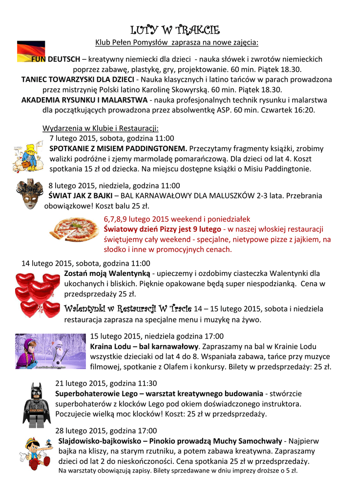 LUTY W TRAKCIE Klub Pełen Pomysłów zaprasza na nowe zajęcia: FUN DEUTSCH – kreatywny niemiecki dla dzieci - nauka słówek i zwrotów niemieckich poprzez zabawę, plastykę, gry, projektowanie. 60 min. Piątek 18.30. TANIEC TOWARZYSKI DLA DZIECI - Nauka klasycznych i latino tańców w parach prowadzona przez mistrzynię Polski latino Karolinę Skowyrską. 60 min. Piątek 18.30. AKADEMIA RYSUNKU I MALARSTWA - nauka profesjonalnych technik rysunku i malarstwa dla początkujących prowadzona przez absolwentkę ASP. 60 min. Czwartek 16:20. Wydarzenia w Klubie i Restauracji: 7 lutego 2015, sobota, godzina 11:00 SPOTKANIE Z MISIEM PADDINGTONEM. Przeczytamy fragmenty książki, zrobimy walizki podróżne i zjemy marmoladę pomarańczową. Dla dzieci od lat 4. Koszt spotkania 15 zł od dziecka. Na miejscu dostępne książki o Misiu Paddingtonie. 8 lutego 2015, niedziela, godzina 11:00 ŚWIAT JAK Z BAJKI – BAL KARNAWAŁOWY DLA MALUSZKÓW 2-3 lata. Przebrania obowiązkowe! Koszt balu 25 zł. 6,7,8,9 lutego 2015 weekend i poniedziałek Światowy dzień Pizzy jest 9 lutego - w naszej włoskiej restauracji świętujemy cały weekend - specjalne, nietypowe pizze z jajkiem, na słodko i inne w promocyjnych cenach. 14 lutego 2015, sobota, godzina 11:00 Zostań moją Walentynką - upieczemy i ozdobimy ciasteczka Walentynki dla ukochanych i bliskich. Pięknie opakowane będą super niespodzianką. Cena w przedsprzedaży 25 zł. Walentynki w Restauracji W Tracie 14 – 15 lutego 2015, sobota i niedziela restauracja zaprasza na specjalne menu i muzykę na żywo. 15 lutego 2015, niedziela godzina 17:00 Kraina Lodu – bal karnawałowy. Zapraszamy na bal w Krainie Lodu wszystkie dzieciaki od lat 4 do 8. Wspaniała zabawa, tańce przy muzyce filmowej, spotkanie z Olafem i konkursy. Bilety w przedsprzedaży: 25 zł. 21 lutego 2015, godzina 11:30 Superbohaterowie Lego – warsztat kreatywnego budowania - stwórzcie superbohaterów z klocków Lego pod okiem doświadczonego instruktora. Poczujecie wielką moc klocków! Koszt: 25 zł w przedsprzedaży. 28 lutego 2015, godzina 17:00 Slajdowisko-bajkowisko – Pinokio prowadzą Muchy Samochwały - Najpierw bajka na kliszy, na starym rzutniku, a potem zabawa kreatywna. Zapraszamy dzieci od lat 2 do nieskończoności. Cena spotkania 25 zł w przedsprzedaży. Na warsztaty obowiązują zapisy. Bilety sprzedawane w dniu imprezy droższe o 5 zł. WALENTYNKI w Trakcie ooo 14 i 15 lutego 2015 - sobota i niedziela W ostatni weekend karnawału zapraszamy na pyszne walentynkowe menu ze specjalnie przygotowanymi na te dni daniami: makaronem w kształcie serc, carpaccio z łososia, schabiki w żurawinach, gruszka z boczkiem, różowa panna cotta. Wybierz promocyjne, walentynkowe menu a my: zarezerwujemy Ci stolik, spróbujesz dobrego włoskiego wina, posłuchasz romantycznej muzyki na żywo od 1800. Zestawy dla par od 89 zł do 199 zł.