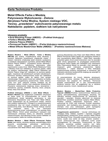 Karta Techniczna Produktu Metal Effects Farba z Miedzią Patynowane Wykończenie - Zielone Akrylowa Farba Wodna, System niskiego VOC, Tworzy „prawdziwe” wykończenie patynowanego metalu Nakładanie: pędzlem, wałkiem lub natryskowe Używane produkty Acid Blocking Primer (AM203) – (Podkład blokujący) Farba z Miedzią (ME149) Zielona Patyna (PA901) Permacoat Sealer (AM201) – (Farba blokująca nawierzchniowa) Metal Effects MasterClear Matte (AM202) – (Powłoka nawierzchniowa Matowa) Modern Masters – Metal Effects Farba z Miedzią (ME149) jest wodną, modyfikowaną farbą akrylową z wysokim stężeniem prawdziwych cząsteczek miedzi. Z czasem naturalnie zmatowieje jeżeli zostanie wystawiona na działanie odpowiednich czynników, jednak Metal Effects Zielona Patyna (PA901) przyspieszy proces utleniania i stworzy piękny , autentyczny patynowany efekt wykończenia w parę minut. Metal Effects Metaliczna Farba z Miedzią może być nakładana za pomocą pędzla, wałka lub systemu natryskowego. Metal Effects Niebieska lub Zielona Patyna mogą być nakładane za pomocą pędzla, gąbki, rozpylacza lub plastikowych pompek natryskowych. Ochronna warstwa nawierzchniowa może być nakładana za pomocą pędzla, wałka do lakieru oraz sprzętu natryskowego. Cały system może być nakładany na każdą, odpowiednio przygotowaną powierzchnię: metal, drewno, suchy mur, tynk, pokrycia ścienne nadające się do malowania, płótna, muśliny oraz plastikowe powierzchnie. Popularne zastosowania obejmują ściany wewnętrzne i zewnętrzne, gzymsy, ozdobniki, kolumny, drzwi, poręcze, lampy, wazy oraz donice. pomocą Aktywatorów oraz Patyn serii Metal Effects. Metal Effects Permacoat Patina Sealer jest niezbędną warstwą w celu uszczelnienia Metal Effects – Efekt Rdzy, wewnątrz budynków gdzie chroni przed ścieraniem oraz na zewnątrz gdzie chroni spływaniem na przylegające powierzchnie. Permacoat Patina Sealer jest niezbędna przy stosowaniu Efktu Patynowanej Miedzi na zewnątrz, oraz wewnątrz w miejscach gdzie malowana powierzchnia będzie przecierana i często dotykana. Z farby blokującej nawierzchniowej możemy zrezygnować w momencie, gdy malowane elementy/ powierzchnie znajdują się wewnątrz w miejscach „niedotykanych”. W przeciwieństwie do innych lakierów akrylowych, Permacoat stworzy warstwę filmu na powierzchniach kwasowych bez popękań lub żółknięcia. Permacoat posiada zrównoważone pH w celu zminimalizowania tendencji kolorów rdzy do pogłębiania się w odcieniu podczas używania, innych, niezalecanych warstw. Modern Masters – MasterClear Matte Protective Topcoat (AM202)-Powłoka nawierzchniowa Matowa jest wodną, jednoskładnikową, samowiążącą, akrylową, nie żółknącą warstwą nawierzchniową do stosowania na zewnątrz i wewnątrz. Wysoka odporność na ścieranie MasterClear przedłuża żywotność systemu Metal Effects. Powłoka podnosi właściwości techniczne farby i wytrzymuje do 3,000 cykli ścierania. Produkt stosowany opcjonalnie. Jest niezbędny przy stosowaniu systemu na zewnątrz oraz przy realizacjach, gdzie wymagamy podwyższonych parametrów ścieralności powerzchni. Podkład blokujący (AM203) z serii Metal Effects – Modern Masters jest wyjątkowym podkładem akrylowym na bazie wody. W przeciwieństwie do innych farb podkładowych został specjalnie opracowany w celu blokowania Aktywatorów oraz Patyn serii Metal Effects, przed dostawaniem się do powierzchni metalu, drewna oraz podłoży reaktywnych. Pomaga to w powstrzymywaniu powstawania rdzy lub innych produktów utleniania pod powierzchnią farby. Acid Blocking Primer blokuje również sole zasadowe, taniny lub inne niechciane zanieczyszczenia przed “przeciekaniem” na warstwę farby Metal Effects. Chroni przed szkodliwymi reakcjami oraz niechcianymi zmianami koloru na utlenianej warstwie nawierzchniowej. Acid Blocking Primer można nakładać za pomocą pędzla, wałka lub metodą natryskową. Przygotowanie powierzchni – Usunąć odchodzącą lub zwisającą farbę. Załatać, wypełnić i naprawić wszystkie niedoskonałości powierzchni przed użyciem Metal Effects Acid Blocking Primer. Wszystkie powierzchnie powinny być równe, czyste oraz wolne od oleju, smarów, wosków i innych zanieczyszczeń oraz całkowicie suche przed przystąpieniem do malowania. Powierzchnie na które nałożono wcześniej podkład powinny być lekko oszlifowane. Zeszlifować wszystkie gładkie (połyskujące) powierzchnie. Dobrze wymieszać przed użyciem i od czasu Modern Masters – Metal Effects Permacoat Patina Sealer jest wodną, akrylową warstwą uszczelniającą która wysycha pozostawiając półmatowe wykończenie. Permacoat został specjalnie opracowany w celu uszczelnienia farb Metal Effects które zostały utlenione za 1 do czasu podczas pracy. Nie rozcieńczać Acid Blocking Primer. W przypadku niepewności względem podłoża, wypróbować farbę na części powierzchni aby upewnić się, że uzyskamy pożądany efekt. Nałożyć przynajmniej dwie warstwy Acid Blocking Primer. Niektóre powierzchnie metalowe takie jak czyste aluminium, ocynkowany metal, zerdzewiały lub żużlowy metal, będą wymagały specjalnego podkładu z listy naszych zalecanych podkładów przed nałożeniem Metal Effects Acid Blocking Primer. W takim przypadku, należy przeczytać szczegółową informację dotyczącą zalecanych podkładów przed rozpoczęciem pracy nad projektem. Odpowiednio rozprowadzić podkład na czystą, suchą powierzchnię za pomocą zalecanego podkładu oraz odczekać aż powierzchnia całkowicie wyschnie – najlepiej przez noc. Następnie postępować zgodnie ze wskazówkami nakładania Acid Blocking Primer. Uwaga: Niskie temperatury i wyższa wilgotność wydłużą czas schnięcia i twardnienia podkładów. Effects i odczekać do wyschnięcia (około 1 godziny). Krok 3: Nałożyć drugą warstwę Farby z Miedzią Metal Effects w ten sam sposób. Roztwór Zi