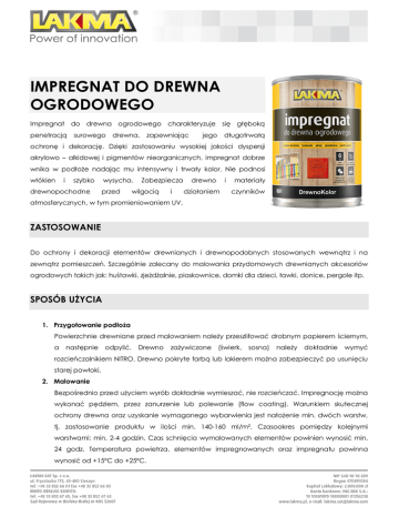 IMPREGNAT DO DREWNA OGRODOWEGO Impregnat do drewna ogrodowego charakteryzuje się głęboką penetracją surowego drewna, zapewniając jego długotrwałą ochronę i dekorację. Dzięki zastosowaniu wysokiej jakości dyspersji akrylowo – alkidowej i pigmentów nieorganicznych, impregnat dobrze wnika w podłoże nadając mu intensywny i trwały kolor. Nie podnosi włókien i szybko drewnopochodne wysycha. przed Zabezpiecza wilgocią i drewno działaniem i materiały czynników atmosferycznych, w tym promieniowaniem UV. ZASTOSOWANIE Do ochrony i dekoracji elementów drewnianych i drewnopodobnych stosowanych wewnątrz i na zewnątrz pomieszczeń. Szczególnie zalecany do malowania przydomowych drewnianych akcesoriów ogrodowych takich jak: huśtawki, zjeżdżalnie, piaskownice, domki dla dzieci, ławki, donice, pergole itp. SPOSÓB UŻYCIA 1. Przygotowanie podłoża Powierzchnie drewniane przed malowaniem należy przeszlifować drobnym papierem ściernym, a następnie odpylić. Drewno zażywiczone (świerk, sosna) należy dokładnie wymyć rozcieńczalnikiem NITRO. Drewno pokryte farbą lub lakierem można zabezpieczyć po usunięciu starej powłoki. 2. Malowanie Bezpośrednio przed użyciem wyrób dokładnie wymieszać, nie rozcieńczać. Impregnację można wykonać pędzlem, przez zanurzenie lub polewanie (flow coating). Warunkiem skutecznej ochrony drewna oraz uzyskanie wymaganego wybarwienia jest nałożenie min. dwóch warstw, tj. zastosowanie produktu w ilości min. 140-160 ml/m². Czasookres pomiędzy kolejnymi warstwami: min. 2-4 godzin. Czas schnięcia wymalowanych elementów powinien wynosić min. 24 godz. Temperatura powietrza, elementów impregnowanych oraz impregnatu powinna wynosić od +15ºC do +25ºC. DANE TECHNICZNE Sposób nanoszenia Ilość warstw: Gęstość: Czasokres pomiędzy kolejnymi warstwami Czas schnięcia Czas pełnego utwardzania Rozcieńczalnik: pędzel, tampon, przez zanurzenie 2-3 ok. 1,0 g/cm3 2 – 4 godz. Min. 24 godz. Do 72 godz. woda 10 - 12 m2 /litr przy jednokrotnym malowaniu czerwony, żółty, zielony, niebieski Wydajność: Kolorystyka: INFORMACJE LOGISTYCZNE Pojemność opakowania jednostkowego Ilość sztuk w opakowaniu zbiorczym Ilość opakowań na palecie Waga pełnej palety 0,8 ltr 6 480 ok. 450 kg SKŁADOWANIE 24 miesiące od daty produkcji w szczelnie zamkniętych, oryginalnych opakowaniach, w położeniu pionowym. Temperatura składowania: od +5 do +30°C. DOPUSZCZENIA, ATESTY, NORMY Certyfikat zgodności BL1 / 69/ 2016, z dnia 05.05.2016 Zgodność z normą PN – C – 81753;2002 BHP I OSTRZEŻENIA Zawiera 3-Jodo-2-propinylo- N-butylokarbaminian, 1,2-benzoizotiazol-3(2H)-on; mieszanina poreakcyjna5-chloro-2-metylo-2H-izotiazol-3-onu [nr WE 247-500-7] i 2-metylo-2H-izotiazol-3-onu [nr WE 220-239-6] (3:1).Może powodować wystąpienie reakcji alergicznej. Chronić przed dziećmi; Karta charakterystyki dostępna na żądanie. Limit zawartości LZO dla produktu Kat A/f/FW dopuszczalne 130g/l, zawartość w produkcie max 30g/l Aktualizacja 05.05.2016 Informacje zawarte w niniejszej Karcie Technicznej mają na celu zapewnienie optymalnego wykorzystania produktu, jednak nie są podstawą do odpowiedzialności prawnej Producenta, gdyż warunki wykonawstwa pozostają poza jego kontrolą. Zaproponowane sposoby postępowania uznane są za powszechne, jednak każdy z użytkowników tego materiału powinien upewnić się na wszelkie możliwe sposoby, włącznie ze sprawdzeniem produktu końcowego, o przydatności dostarczanych materiałów do osiągnięcia zamierzonych celów. W przypadku połączenia z wyrobami innych Producentów nie ponosimy żadnej odpowiedzialności. Powyższe dane, zalecenia i wskazówki opierają się na naszej najlepszej wiedzy, badaniach oraz doświadczeniach i zostały udzielone w dobrej wierze, zgodnie z zasadami obowiązującymi w naszej firmie i u naszych dostawców. Producent zastrzega sobie prawo do zmiany treści w kolejnych edycjach bez wcześniejszego informowania o tym fakcie odbiorców. Wraz z ukazaniem się tej Karty Technicznej, karty wcześniejsze tracą ważność.