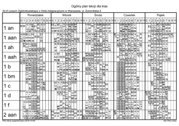 Ogólny plan lekcji dla klas XLVI Liceum Ogólnokształcące z Oddz.Integracyjnymi w Warszawie, ul. Żuromińska 4 Poniedziałek 1 an 1 aan Wtorek Środa 1 aah chłopcy WF chłopcy WF dziewczęta WF dziewczęta WF chłopcy WF dziewczęta WF dziewczęta WF dziewczęta WF chłopcy WF chłopcy WF dziewczęta WF chłopcy WF chłopcy WF chłopcy WF chłopcy WF dziewczęta dziewczęta 1 bm dziewczęta WF chłopcy WF rosyjski1 Jęz. ros. Jęz. ros. 12 rosyjski1 12 chłopcy WF rosyjski1 Jęz. ros. Jęz. ros. Jęz. ros. 12 rosyjski1 12 rosyjski1 12 dziewczęta niemiecki2 Jęz. niem. niemiecki2 Jęz. niem. dziewczęta niemiecki2 Jęz. niem. niemiecki2 Jęz. niem. niemiecki2 Jęz. niem. dziewczęta WF 15 57 4 4 hiszpański1 Jęz. hisz. Jęz. hisz. 35 hiszpański1 35 rosyjski2 Jęz. ros. Jęz. ros. 43 rosyjski2 43 grupa 1 Jęz. grupa 1 Jęz.13 fr. fr. 13 grupa 1 grupa 1 Jęz. 49 wł. Jęz. 49 wł. niemiecki1 Jęz. niem. Jęz. niem. 3 niemiecki1 3 rosyjski1 Jęz. ros. Jęz. ros. 12 rosyjski1 12 niemiecki2 Jęz. niem. Jęz. niem. 15 niemiecki2 57 hiszpański2 Jęz. hisz. Jęz. hisz. 4 hiszpański2 4 hiszpański1 Jęz. hisz. Jęz. hisz. 35 hiszpański1 35 rosyjski2 Jęz. ros. Jęz. ros. 43 rosyjski2 43 grupa 1 Jęz. grupa 1 Jęz.13 fr. fr. 13 grupa 1 grupa 1 Jęz. 49 wł. Jęz. 49 wł. niemiecki1 Jęz. niem. Jęz. niem. 3 niemiecki1 3 rosyjski1 Jęz. ros. Jęz. ros. 12 rosyjski1 12 niemiecki2 Jęz. niem. Jęz. niem. 15 niemiecki2 57 hiszpański2 Jęz. hisz. Jęz. hisz. 4 hiszpański2 4 hiszpański1 Jęz. hisz. Jęz. hisz. 35 hiszpański1 35 rosyjski2 Jęz. ros. Jęz. ros. 43 rosyjski2 43 grupa 1 Jęz. grupa 1 Jęz.13 fr. fr. 13 grupa 1 grupa 1 Jęz. 49 wł. Jęz. 49 wł. niemiecki1 Jęz. niem. Jęz. niem. 3 niemiecki1 3 WF hiszpański2 Jęz. hisz. hiszpański2 Jęz. hisz. WF dziewczęta WF dziewczęta Jęz. hisz. hiszpański2 Jęz. hisz. hiszpański2 Jęz. hisz. hiszpański1 Jęz. hisz. Jęz. hisz. Jęz. hisz. dziewczęta dziewczęta chłopcy WF chłopcy WF chłopcy WF WF WF dziewczęta WF dziewczęta WF chłopcy WF chłopcy WF dziewczęta WF WF chłopcy WF chłopcy WF chłopcy WF rosyjski1 Jęz. ros. Jęz. ros. 12 rosyjski1 12 niemiecki2 Jęz. niem. niemiecki2 Jęz. niem. 15 57 4 hiszpański24 hiszpański1 Jęz. hisz. Jęz. hisz. 35 hiszpański1 35 rosyjski2 rosyjski2 Jęz. ros. 43 Jęz. ros. 43 grupa 1 Jęz. grupa 1 Jęz.13 fr. fr. 13 grupa 1 grupa 1 Jęz. 49 wł. Jęz. 49 wł. niemieki1 Jęz. niem. Jęz. niem. 3 niemieki1 3 rosyjski1 Jęz. ros. Jęz. ros. Jęz. ros. 12 rosyjski1 12 rosyjski1 12 chłopcy WF chłopcy WF hiszpański2 WF Plan lekcji wygenerowany:2015-10-08 niemiecki2 Jęz. niem. niemiecki2 Jęz. niem. niemiecki2 Jęz. niem. 18 18 18 57 hiszpański2 57 hiszpański2 57 35 hiszpański1 35 hiszpański1 35 hiszpański2 Jęz. hisz. Jęz. hisz. dziewczęta 2 aan 18 18 18 57 57 57 35 hiszpański1 35 hiszpański1 35 rosyjski2 Jęz. ros. Jęz. ros. Jęz. ros. 43 rosyjski2 43 rosyjski2 43 grupa 1 grupa 1 grupa 1 Jęz. fr. Jęz.13 fr. Jęz.13 fr. 13 grupa 1 grupa 1 grupa 1 Jęz. 45 wł. Jęz. 45 wł. Jęz. 45 wł. niemiecki1 Jęz. niem. Jęz. niem. Jęz. niem. 36 niemiecki1 36 niemiecki1 51 rosyjski1 Jęz. ros. Jęz. ros. Jęz. ros. 12 rosyjski1 12 rosyjski1 12 niemiecki2 Jęz. niem. Jęz. niem. Jęz. niem. 18 niemiecki2 18 niemiecki2 18 hiszpański2 hiszpański2 Jęz. hisz. Jęz. hisz. 57 Jęz. hisz. 57 hiszpański2 57 hiszpański1 hiszpański1 Jęz. hisz. Jęz. hisz. 35 Jęz. hisz. 35 hiszpański1 35 rosyjski2 Jęz. ros. Jęz. ros. Jęz. ros. 43 rosyjski2 43 rosyjski2 43 grupa 1 grupa 1 grupa 1 Jęz. fr. Jęz.13 fr. Jęz.13 fr. 13 grupa 1 grupa 1 grupa 1 Jęz. 45 wł. Jęz. 45 wł. Jęz. 45 wł. niemiecki1 niemiecki1 niemiecki1 Jęz. niem. 36 Jęz. niem. 36 Jęz. niem. 51 rosyjski1 Jęz. ros. Jęz. ros. Jęz. ros. 12 rosyjski1 12 rosyjski1 12 niemiecki2 Jęz. niem. Jęz. niem. Jęz. niem. 18 niemiecki2 18 niemiecki2 18 hiszpański2 hiszpański2 Jęz. hisz. Jęz. hisz. 57 Jęz. hisz. 57 hiszpański2 57 hiszpański1 hiszpański1 Jęz. hisz. Jęz. hisz. Jęz. hisz. 35 35 hiszpański1 35 rosyjski2 Jęz. ros. Jęz. ros. Jęz. ros. 43 rosyjski2 43 rosyjski2 43 grupa 1 grupa 1 grupa 1 Jęz. fr. Jęz.13 fr. Jęz.13 fr. 13 grupa 1 grupa 1 grupa 1 Jęz. 45 wł. Jęz. 45 wł. Jęz. 45 wł. niemiecki1 Jęz. niem. Jęz. niem. Jęz. niem. 36 niemiecki1 36 niemiecki1 51 hiszpański2 dziewczęta WF chłopcy WF 1f WF chłopcy WF chłopcy WF chłopcy WF 1d dziewczęta częta WF dziew WF chłopcy WF chłopcy WF dziewczęta 1c WF dziewczęta WF 1b Piątek 0 1 2 3 4 5 6 7 8 9 10 0 1 2 3 4 5 6 7 8 9 10 0 1 2 3 4 5 6 7 8 9 10 0 1 2 3 4 5 6 7 8 9 10 0 1 2 3 4 5 6 7 8 9 10 Jęz. Inf Jęz. Jęz. gr1 gr1 Jęz. Jęz. Zaj Ję gr1 Ję Ję gr1 Jęz. Jęz. gr1 gr1 Ed Hi wo M gr1 Jęz. Ję gr1 Jęz. M M R Ję Ję Hi G W prz god W gr1 Po Po gr1 nie nie Bi W R nie nie D C nie ang. ang. 52 Fi 43 m.1 or. 34 Et m.1 m.1 43 m.1 z. z. ang. z. z. z. ang. u. s.n eds dst. dst. m.1 z. 43 el pol pol st eo O .nie z pol gr2 ol O el O gr2 Jęz. Jęz. gr2 gr2 Jęz. Jęz. gr2 S he Jęz. at at prz gr2 nie nie gr2 be st ie at gr2 Inf gr2 Jęz. Jęz. Jęz. Jęz. pol gr2 wy . prz nie z. nie nie nie nie m 1 36 ed. ed. ang. ang. ang. ang. m. 28 m.1 44 52 51 37 K1 53 52 51 3 46 46 35 3 8 5 0 44 51 39 14 36 m.2 m. . 36 . 36 . . gr. . zp. . m . . K . S D . . 39 . 53 or. 34 m.1 53 53 ch. m.1 53 m.1 m.1 39 Jęz. Jęz. Jęz. Jęz. Jęz. Jęz. Zaj gr1 gr1 gr1 gr1 gr1 gr1 gr1 gr1 gr1 gr1 Ję W Bi C Hi Jęz. Ję Jęz. Ed Po Jęz. Jęz. W M Ję Ję Hi nie nie M M nie gr1 D R ang. prz W Ję Inf wo R nie Po nie G nie god ang. ang. 2 z. ang.2 m.3 dst. or. 34 3 2 2 3 1 3 Fi Et m. m. m. m. m.3 z. z. s.n u. z. z. eds dst. z eo he O ol st S el O O at el st at at Jęz. pol gr2 gr2 prz gr2 Jęz. gr2 Jęz. Jęz. ie Jęz. gr2 Jęz. .nie prz nie pol be pol pol gr2 gr2 gr2 gr2 gr2 gr2 Inf Jęz. Jęz. Jęz. Jęz. wyc z. . nie nie nie gr. m 1 45 48 18 nie 49 52 ed. 18 37 h.3 nie 48 36 m.2 3 S8 46 . m. . D1 . nie . ang. K8 36 . m.1 3 m8 zp. . 36 . 44 15 . . 48 . ang. . 45 . or.