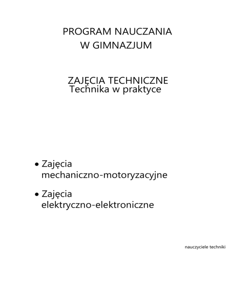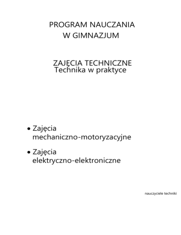 PROGRAM NAUCZANIA W GIMNAZJUM ZAJĘCIA TECHNICZNE Technika w praktyce Zajęcia mechaniczno-motoryzacyjne Zajęcia elektryczno-elektroniczne nauczyciele techniki I. Treści nauczania Zajęcia mechaniczno-motoryzacyjne 1. BHP, organizacja pracy Bezpieczeństwo i higiena pracy (BHP) podczas zajęć technicznych. Znaki BHP, przeciwpożarowe, ewakuacyjne. Pierwsza pomoc (apteczka pierwszej pomocy). Instrukcja ewakuacyjna, instrukcja przeciwpożarowa. Sposoby organizacji pracy. Planowanie i wykonanie zadania technicznego (indywidualnie, zespołowo). Ład i porządek w czasie pracy. 2. Informacja techniczna Źródła informacji o zagadnieniach technicznych. Rysunek poglądowy, techniczny (pismo techniczne – litery duże i małe, rzuty aksonometryczne i prostokątne, wymiarowanie rysunków, rysowanie i wymiarowanie przekroju, rysunek złożeniowy i wykonawczy, schematy mechaniczne). Dokumentacja techniczna przedmiotu użytkowego (projektowanie konstrukcji). Ochrona praw autorskich (prawo autorskie, wynalazek, ochrona patentowa). 3. Technologia, materiałoznawstwo, metrologia Narzędzia, przyrządy pomiarowe, urządzenia (nazwy, zastosowanie, posługiwanie się). Proces technologiczny (opracowanie). Części maszyn (wały, osie, łożyska). Połączenia części maszyn (rozłączne, nierozłączne). Materiały konstrukcyjne – wymagania użytkowe, konstrukcyjne, ekonomiczne, estetyczne, bezpieczeństwa. 4. Urządzenia techniczne Wiertarka elektryczna ręczna – budowa, działanie, dane techniczne. Wiercenie. 5. Maszyny, środki transportu, silniki Podział maszyn, środków transportu, silników. Silniki spalinowe – budowa, zasada działania silnika czterosuwowego i silnika dwusuwowego. Motorower – budowa, warunki eksploatacji, dane techniczne. Samochód (pojazd alternatywny) – budowa, dane techniczne, recykling. 6. Historia techniki Wielcy wynalazcy w dziedzinie mechaniki i transportu (zagraniczni, polscy). Rola techniki w procesie przemian historyczno-społecznych i kulturowych. 7. Orientacja zawodowa Zawody związane z mechaniką, transportem. Warunki, predyspozycje, kwalifikacje zawodowe (stan zdrowia, zainteresowania, uzdolnienia, cechy charakteru, wykształcenie). 8. Bezpieczeństwo ruchu drogowego Podstawowe pojęcia dotyczące ruchu drogowego. Bezpieczeństwo na drogach. Zasady poruszania się po drodze. Manewry wykonywane przez kierującego. Zasady przejazdu skrzyżowań. Zajęcia elektryczno-elektroniczne 1. BHP, organizacja pracy Bezpieczeństwo i higiena pracy (BHP) podczas zajęć technicznych. Działanie prądu elektrycznego na organizm człowieka. Ochrona przed porażeniem elektrycznym. Pierwsza pomoc (porażenie prądem elektrycznym). Planowanie i wykonanie zadania technicznego elektronicznego (indywidualnie, zespołowo). Ład i porządek w czasie pracy. 2. Informacja techniczna Źródła informacji o zagadnieniach technicznych. Ochrona praw autorskich (plagiat, piractwo). Schematy obwodów elektrycznych, elektronicznych. Rysunek złożeniowy, wykonawczy, np. elektromagnes. Dokumentacja techniczna układu sygnalizacyjnego, np. próbnik napięcia elektrycznego. 3. Technologia, materiałoznawstwo, metrologia Materiały konstrukcyjne – izolacyjne, przewodniki, półprzewodniki (wymagania użytkowe, konstrukcyjne, ekonomiczne, estetyczne, dotyczące bezpieczeństwa). Proces technologiczny np. elektryczna choinka. Przyrząd pomiarowy – miernik uniwersalny. 4. Urządzenie techniczne Lutownica transformatorowa – budowa, zasada działania, dane techniczne. Lutowanie. 5. Elektrotechnika i elektronika Obwody elektryczne, elektroniczne. Pomiar podstawowych wielkości elektrycznych. Źródła energii elektrycznej – bateria, akumulator, prądnica (zalety, wady). Alternatywne źródła energii elektrycznej. Elementy elektroniczne (rezystory, kondensatory, diody półprzewodnikowe, tranzystory, zwojnice) – opisywanie, katalogowanie, przechowywanie oraz utylizacja. Domowa instalacja elektryczna, elektryczne źródła światła. Bezpieczniki. Układy sygnalizacyjne, np. temperatura, wilgotność, próbnik napięcia elektrycznego. 6. Wybrany sprzęt domowy Radioodbiornik, telewizor, odtwarzacz CD i DVD, wieża muzyczna, kino domowe – budowa, działanie, użytkowanie. Telefon komórkowy – budowa, działanie, użytkowanie. Cyfrowy aparat fotograficzny – budowa, działanie, użytkowanie. Domowy sprzęt elektromechaniczny – budowa, dane techniczne, użytkowanie. Utylizacja urządzeń elektrycznych. 7. Historia techniki Wielcy wynalazcy w dziedzinie elektryczności (zagraniczni, polscy). Rola techniki w procesie przemian historyczno-społecznych i kulturowych. 8. Orientacja zawodowa Zawody związane z przemysłem elektrotechnicznym, elektronicznym. Warunki, kwalifikacje zawodowe (stan zdrowia, zainteresowania, uzdolnienia, cechy charakteru, wykształcenie). II. Osiągnięcia uczniów, plan wynikowy Zajęcia mechaniczno-motoryzacyjne Lp. Temat lekcji 1 Zapoznanie z programem, systemem oceniania. Bezpieczeństwo i higiena pracy (BHP) na lekcji, podczas posługiwania się narzędziami ręcznymi EZ 2 Przypomnienie znaczenia znaków BHP, ppoż., ewakuacyjnych EZ Liczba godzin (propozycja) 1 Uczeń: Osiągnięcia uczniów Wymagania podstawowe Wymagania ponadpodstawowe Uczeń: wymienia zasady bezpieczeństwa obowiązujące podczas zajęć wskazuje miejsce w klasie (szkole), w którym znajduje się apteczka szkolna określa czynniki, które wpływają na wypadki podczas posługiwania się narzędziami ręcznymi wymienia zawartość apteczki pierwszej pomocy demonstruje sposób udzielania pierwszej pomocy Uwaga: osiągnięcia uczniów, które nie podlegają ocenie: 1 wymienia zagadnienia programowe dotyczące profilu mechanicznego określa wymagania, sposób oceniania na lekcji opisuje kształt, barwy znaku w zależności określa treść znaku od rodzaju projektuje znak BHP 3 4 Materiały konstrukcyjne – otrzymywanie, właściwości, zastosowanie EEK 1 Narzędzia – rozpoznawanie 