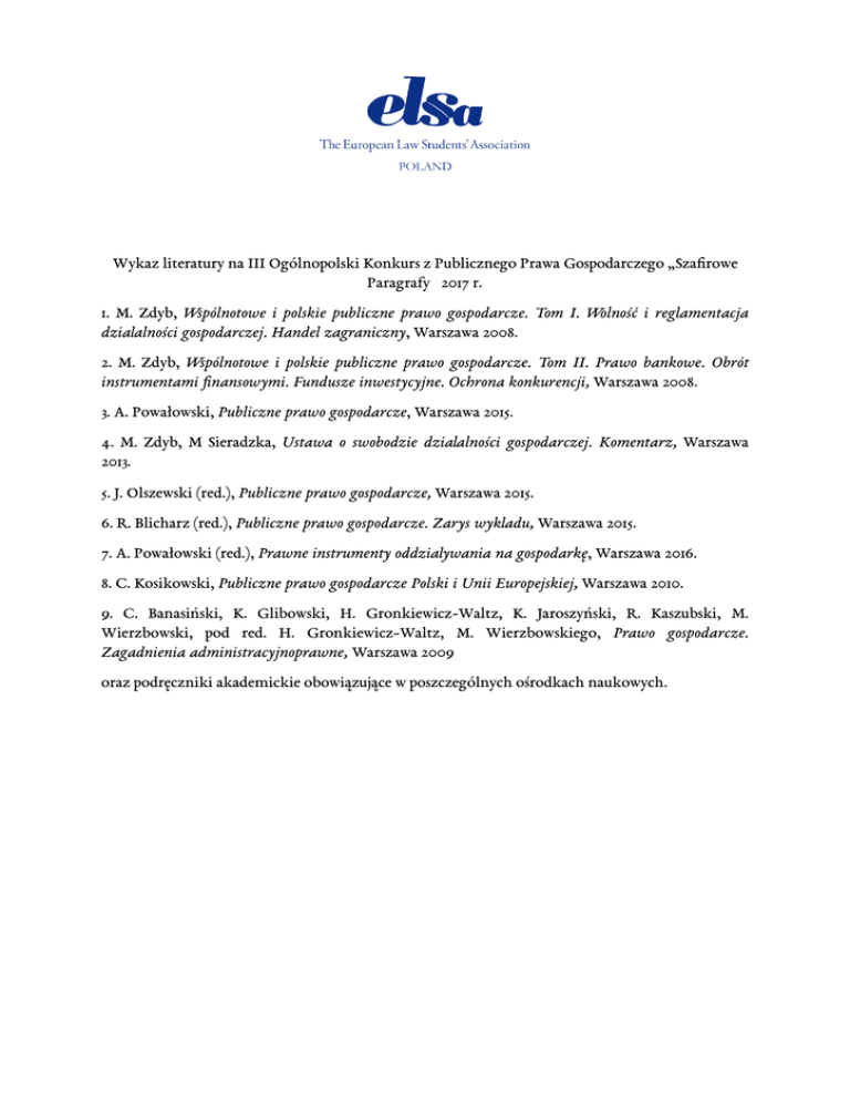Wykaz literatury na III Ogólnopolski Konkurs z Publicznego Prawa Gospodarczego „Szafirowe Paragrafy” 2017 r. 1. M. Zdyb, Wspólnotowe i polskie publiczne prawo gospodarcze. Tom I. Wolność i reglamentacja działalności gospodarczej. Handel zagraniczny, Warszawa 2008. 2. M. Zdyb, Wspólnotowe i polskie publiczne prawo gospodarcze. Tom II. Prawo bankowe. Obrót instrumentami finansowymi. Fundusze inwestycyjne. Ochrona konkurencji, Warszawa 2008. 3. A. Powałowski, Publiczne prawo gospodarcze, Warszawa 2015. 4. M. Zdyb, M Sieradzka, Ustawa o swobodzie działalności gospodarczej. Komentarz, Warszawa 2013. 5. J. Olszewski (red.), Publiczne prawo gospodarcze, Warszawa 2015. 6. R. Blicharz (red.), Publiczne prawo gospodarcze. Zarys wykładu, Warszawa 2015. 7. A. Powałowski (red.), Prawne instrumenty oddziaływania na gospodarkę, Warszawa 2016. 8. C. Kosikowski, Publiczne prawo gospodarcze Polski i Unii Europejskiej, Warszawa 2010. 9. C. Banasiński, K. Glibowski, H. Gronkiewicz-Waltz, K. Jaroszyński, R. Kaszubski, M. Wierzbowski, pod red. H. Gronkiewicz-Waltz, M. Wierzbowskiego, Prawo gospodarcze. Zagadnienia administracyjnoprawne, Warszawa 2009 oraz podręczniki akademickie obowiązujące w poszczególnych ośrodkach naukowych.