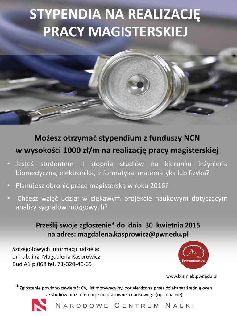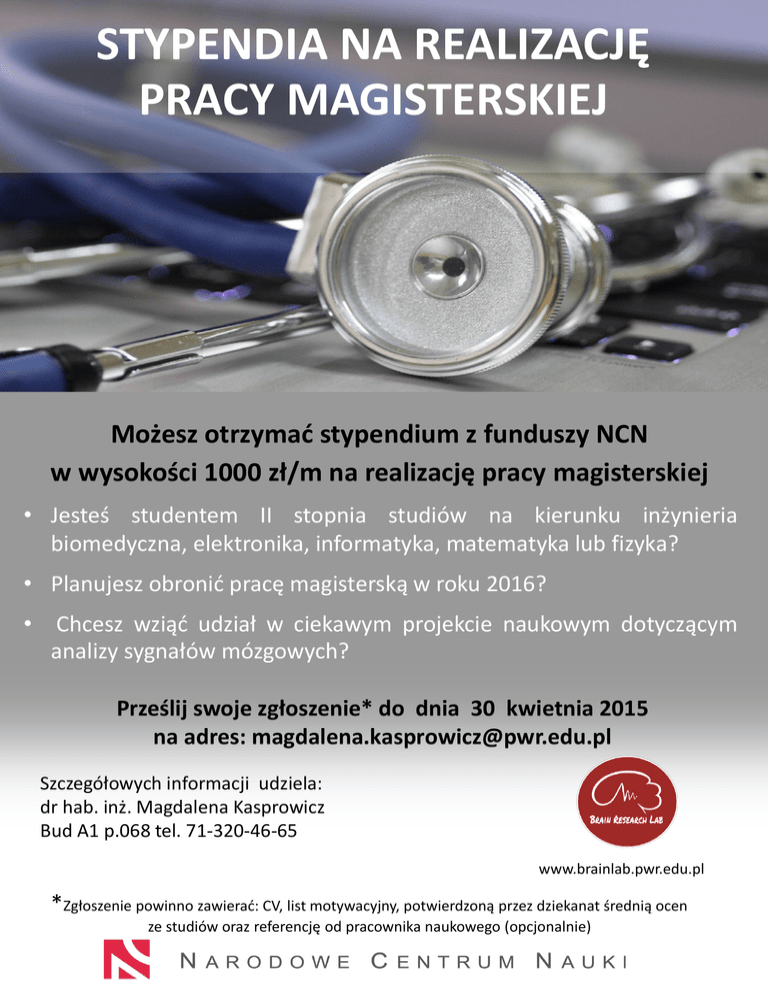 STYPENDIA NA REALIZACJĘ PRACY MAGISTERSKIEJ Możesz otrzymać stypendium z funduszy NCN w wysokości 1000 zł/m na realizację pracy magisterskiej • Jesteś studentem II stopnia studiów na kierunku inżynieria biomedyczna, elektronika, informatyka, matematyka lub fizyka? • Planujesz obronić pracę magisterską w roku 2016? • Chcesz wziąć udział w ciekawym projekcie naukowym dotyczącym analizy sygnałów mózgowych? Prześlij swoje zgłoszenie* do dnia 30 kwietnia 2015 na adres: [email protected] Szczegółowych informacji udziela: dr hab. inż. Magdalena Kasprowicz Bud A1 p.068 tel. 71-320-46-65 www.brainlab.pwr.edu.pl *Zgłoszenie powinno zawierać: CV, list motywacyjny, potwierdzoną przez dziekanat średnią ocen ze studiów oraz referencję od pracownika naukowego (opcjonalnie)