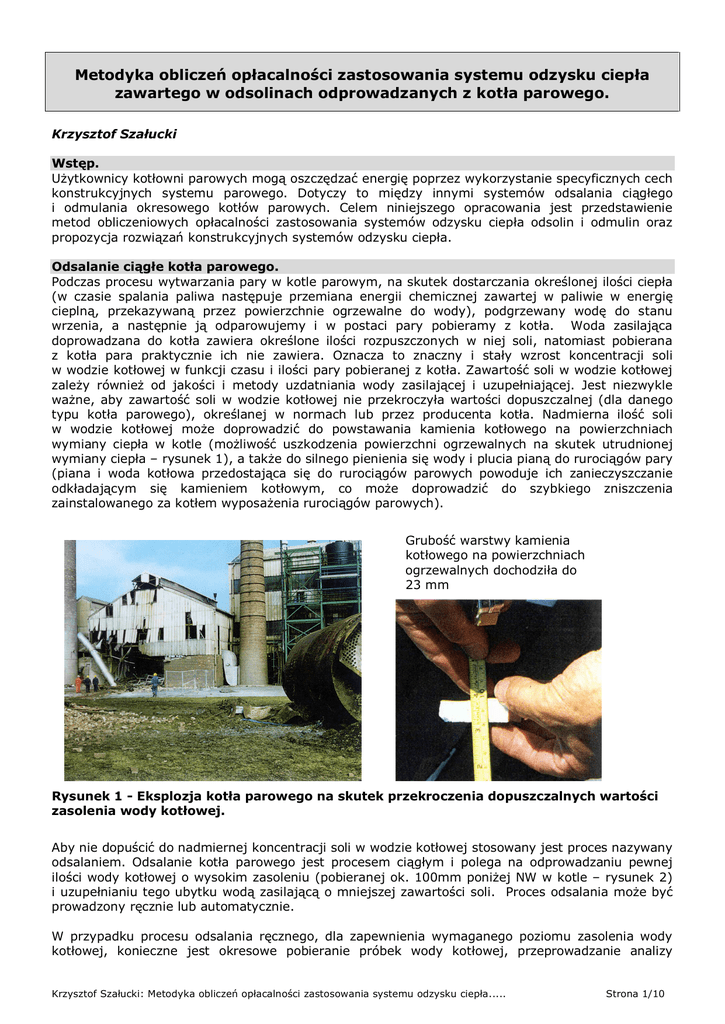 Metodyka oblicze op acalno ci zastosowania systemu odzysku ciep a zawartego w odsolinach odprowadzanych z kot a parowego. Krzysztof Sza ucki Wst p. ytkownicy kot owni parowych mog oszcz dza energi poprzez wykorzystanie specyficznych cech konstrukcyjnych systemu parowego. Dotyczy to mi dzy innymi systemów odsalania ci ego i odmulania okresowego kot ów parowych. Celem niniejszego opracowania jest przedstawienie metod obliczeniowych op acalno ci zastosowania systemów odzysku ciep a odsolin i odmulin oraz propozycja rozwi za konstrukcyjnych systemów odzysku ciep a. Odsalanie ci e kot a parowego. Podczas procesu wytwarzania pary w kotle parowym, na skutek dostarczania okre lonej ilo ci ciep a (w czasie spalania paliwa nast puje przemiana energii chemicznej zawartej w paliwie w energi ciepln , przekazywan przez powierzchnie ogrzewalne do wody), podgrzewany wod do stanu wrzenia, a nast pnie j odparowujemy i w postaci pary pobieramy z kot a. Woda zasilaj ca doprowadzana do kot a zawiera okre lone ilo ci rozpuszczonych w niej soli, natomiast pobierana z kot a para praktycznie ich nie zawiera. Oznacza to znaczny i sta y wzrost koncentracji soli w wodzie kot owej w funkcji czasu i ilo ci pary pobieranej z kot a. Zawarto soli w wodzie kot owej zale y równie od jako ci i metody uzdatniania wody zasilaj cej i uzupe niaj cej. Jest niezwykle wa ne, aby zawarto soli w wodzie kot owej nie przekroczy a warto ci dopuszczalnej (dla danego typu kot a parowego), okre lanej w normach lub przez producenta kot a. Nadmierna ilo soli w wodzie kot owej mo e doprowadzi do powstawania kamienia kot owego na powierzchniach wymiany ciep a w kotle (mo liwo uszkodzenia powierzchni ogrzewalnych na skutek utrudnionej wymiany ciep a –rysunek 1), a tak e do silnego pienienia si wody i plucia pian do ruroci gów pary (piana i woda kot owa przedostaj ca si do ruroci gów parowych powoduje ich zanieczyszczanie odk adaj cym si kamieniem kot owym, co mo e doprowadzi do szybkiego zniszczenia zainstalowanego za kot em wyposa enia ruroci gów parowych). Grubo warstwy kamienia kot owego na powierzchniach ogrzewalnych dochodzi a do 23 mm Rysunek 1 - Eksplozja kot a parowego na skutek przekroczenia dopuszczalnych warto ci zasolenia wody kot owej. Aby nie dopu ci do nadmiernej koncentracji soli w wodzie kot owej stosowany jest proces nazywany odsalaniem. Odsalanie kot a parowego jest procesem ci ym i polega na odprowadzaniu pewnej ilo ci wody kot owej o wysokim zasoleniu (pobieranej ok. 100mm poni ej NW w kotle – rysunek 2) i uzupe nianiu tego ubytku wod zasilaj o mniejszej zawarto ci soli. Proces odsalania mo e by prowadzony r cznie lub automatycznie. W przypadku procesu odsalania r cznego, dla zapewnienia wymaganego poziomu zasolenia wody kot owej, konieczne jest okresowe pobieranie próbek wody kot owej, przeprowadzanie analizy Krzysztof Sza ucki: Metodyka oblicze op acalno ci zastosowania systemu odzysku ciep a..... Strona 1/10 w laboratorium, a nast pnie, zale nie od wyników pomiarów, realizowanie korekty w ustawieniu zaworu regulacji ilo ci odprowadzanych odsolin. Nastawa stopnia otwarcia zaworu w przypadku odsalania r cznego jest wi ksza od rzeczywistych potrzeb, w zwi zku z konieczno ci zapewnienia wymaganego poziomu zasolenia przy pracy kot a z maksymaln wydajno ci . Automatyzacja procesu odsalania jest oparta na wykorzystaniu pomiaru przewodno ci wody kot owej, poniewa mo na z wystarczaj cym przybli eniem stwierdzi , e przewodno wody kot owej zale y od ilo ci rozpuszczonych w niej soli. Regulator odsalania ci ego realizuje takie ustawienie stopnia otwarcia zaworu odsalaj cego, aby warto mierzona przewodno ci by a mo liwie bliska warto ci zadanej. Rysunek 2 – Kocio parowy z systemem automatycznego odsalania i odmulania [GESTRA]. Odsoliny odprowadzane z kot a poprzez zawór odsalania ci ego charakteryzuj si znaczn zawarto ci ciep a. Ciep o to mo e by wykorzystane w procesie termicznego odgazowania wody zasilaj cej lub dla podgrzewu wst pnego dowolnego czynnika. Z ekonomicznego i ekologicznego punktu widzenia zrzucanie do kanalizacji odsolin o du ej zawarto ci niewykorzystanego ciep a nie mo e by tolerowane. Odmulanie okresowe kot a parowego. Podczas pracy kot a parowego, szczególnie na skutek dawkowania fosforanów i innych rodków dodawanych dla likwidacji twardo ci resztkowej, powstaj znaczne ilo ci osadów, które stopniowo opadaj i gromadz si w dolnej cz ci kot a. Osady te, ze wzgl du na ich w asno ci termoizolacyjne, gromadz c si na powierzchniach ogrzewalnych, mog by przyczyn uszkodze tych powierzchni na skutek przegrzania. Dla odprowadzenia mu ów (osadów) zgromadzonych na dnie kot a, w najni szym punkcie cz ci wodnej kot a (rysunek 2) przeprowadzamy proces nazywany odmulaniem. Odmulanie to proces okresowy, polegaj cy na odprowadzeniu mo liwie niewielkiej ilo ci wody kot owej o najwi kszej zawarto ci osadów. Dla zapewnienia w ciwej jako ci procesu odmulania (zerwanie osadów z dna kot a) zalecane jest, aby czas otwarcia zaworu odmulaj cego nie przekracza 3-4 sekund. W przypadku odmulania okresowego równie mo liwe jest odzyskanie ciep a traconego z odmulinami odprowadzanymi z kot a parowego. Nie jest to jednak zalecane ze wzgl du na bardzo krótki 3-4 sekundowy czas otwarcia zaworu, realizowany kilka-kilkana cie razy w ci gu doby. Mo e to doprowadzi do powstania chwilowych, gwa townych wzrostów (pików) ci nienia w systemie. Krzysztof Sza ucki: Metodyka oblicze op acalno ci zastosowania systemu odzysku ciep a..... Strona 2/10 Okre lenie ilo ci odprowadzanych odsolin z kot a parowego. Dla zaprojektowania systemu odzysku ciep a zawartego w odsolinach w pierwszym kroku nale y okre li w przybli eniu ilo ci odprowadzanego czynnika. W tym celu mo na wykorzysta jeden z poni szych wzorów okre laj cych procentowy udzia odsolin w wydajno ci kot a parowego: A= 1 S − S wu 1 + wk (1 − ϕ ) ⋅ S wu ⋅ 100[%] [wzór 1] gdzie: ϕ wspó czynnik okre laj cy ilo kondensatu powracaj cego w stosunku do ilo ci produkowane