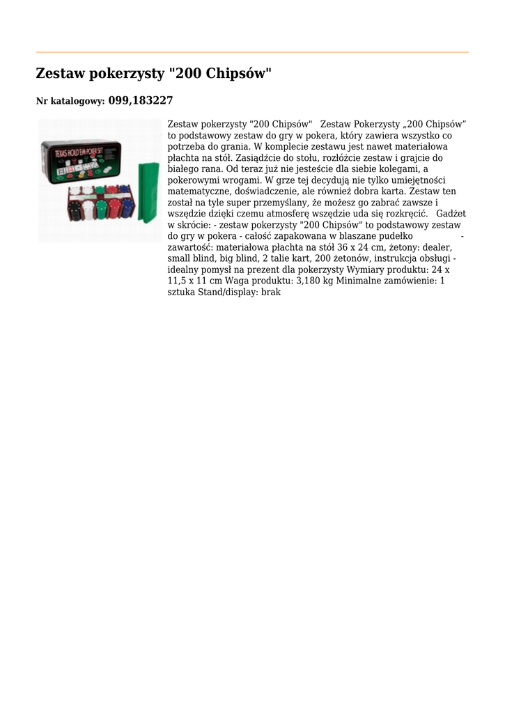 Zestaw pokerzysty "200 Chipsów" Nr katalogowy: 099,183227 Zestaw pokerzysty "200 Chipsów" Zestaw Pokerzysty „200 Chipsów” to podstawowy zestaw do gry w pokera, który zawiera wszystko co potrzeba do grania. W komplecie zestawu jest nawet materiałowa płachta na stół. Zasiądźcie do stołu, rozłóżcie zestaw i grajcie do białego rana. Od teraz już nie jesteście dla siebie kolegami, a pokerowymi wrogami. W grze tej decydują nie tylko umiejętności matematyczne, doświadczenie, ale również dobra karta. Zestaw ten został na tyle super przemyślany, że możesz go zabrać zawsze i wszędzie dzięki czemu atmosferę wszędzie uda się rozkręcić. Gadżet w skrócie: - zestaw pokerzysty "200 Chipsów" to podstawowy zestaw do gry w pokera - całość zapakowana w blaszane pudełko zawartość: materiałowa płachta na stół 36 x 24 cm, żetony: dealer, small blind, big blind, 2 talie kart, 200 żetonów, instrukcja obsługi idealny pomysł na prezent dla pokerzysty Wymiary produktu: 24 x 11,5 x 11 cm Waga produktu: 3,180 kg Minimalne zamówienie: 1 sztuka Stand/display: brak