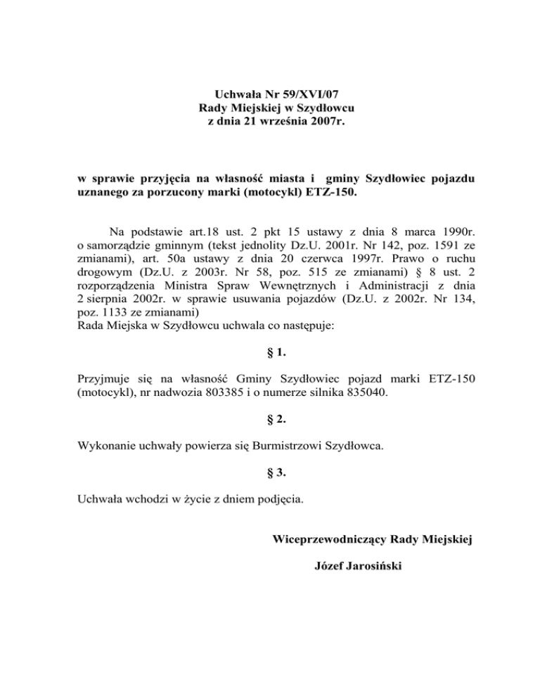 Uchwała Nr 59/XVI/07 Rady Miejskiej w Szydłowcu z dnia 21 września 2007r. w sprawie przyjęcia na własność miasta i gminy Szydłowiec pojazdu uznanego za porzucony marki (motocykl) ETZ-150. Na podstawie art.18 ust. 2 pkt 15 ustawy z dnia 8 marca 1990r. o samorządzie gminnym (tekst jednolity Dz.U. 2001r. Nr 142, poz. 1591 ze zmianami), art. 50a ustawy z dnia 20 czerwca 1997r. Prawo o ruchu drogowym (Dz.U. z 2003r. Nr 58, poz. 515 ze zmianami) § 8 ust. 2 rozporządzenia Ministra Spraw Wewnętrznych i Administracji z dnia 2 sierpnia 2002r. w sprawie usuwania pojazdów (Dz.U. z 2002r. Nr 134, poz. 1133 ze zmianami) Rada Miejska w Szydłowcu uchwala co następuje: § 1. Przyjmuje się na własność Gminy Szydłowiec pojazd marki ETZ-150 (motocykl), nr nadwozia 803385 i o numerze silnika 835040. § 2. Wykonanie uchwały powierza się Burmistrzowi Szydłowca. § 3. Uchwała wchodzi w życie z dniem podjęcia. Wiceprzewodniczący Rady Miejskiej Józef Jarosiński