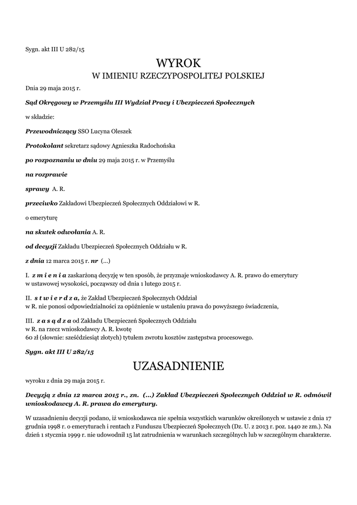 Sygn. akt III U 282/15 WYROK W IMIENIU RZECZYPOSPOLITEJ POLSKIEJ Dnia 29 maja 2015 r. Sąd Okręgowy w Przemyślu III Wydział Pracy i Ubezpieczeń Społecznych w składzie: Przewodniczący SSO Lucyna Oleszek Protokolant sekretarz sądowy Agnieszka Radochońska po rozpoznaniu w dniu 29 maja 2015 r. w Przemyślu na rozprawie sprawy A. R. przeciwko Zakładowi Ubezpieczeń Społecznych Oddziałowi w R. o emeryturę na skutek odwołania A. R. od decyzji Zakładu Ubezpieczeń Społecznych Oddziału w R. z dnia 12 marca 2015 r. nr (...) I. z m i e n i a zaskarżoną decyzję w ten sposób, że przyznaje wnioskodawcy A. R. prawo do emerytury w ustawowej wysokości, począwszy od dnia 1 lutego 2015 r. II. s t w i e r d z a, że Zakład Ubezpieczeń Społecznych Oddział w R. nie ponosi odpowiedzialności za opóźnienie w ustaleniu prawa do powyższego świadczenia, III. z a s ą d z a od Zakładu Ubezpieczeń Społecznych Oddziału w R. na rzecz wnioskodawcy A. R. kwotę 60 zł (słownie: sześćdziesiąt złotych) tytułem zwrotu kosztów zastępstwa procesowego. Sygn. akt III U 282/15 UZASADNIENIE wyroku z dnia 29 maja 2015 r. Decyzją z dnia 12 marca 2015 r., zn. (...) Zakład Ubezpieczeń Społecznych Oddział w R. odmówił wnioskodawcy A. R. prawa do emerytury. W uzasadnieniu decyzji podano, iż wnioskodawca nie spełnia wszystkich warunków określonych w ustawie z dnia 17 grudnia 1998 r. o emeryturach i rentach z Funduszu Ubezpieczeń Społecznych (Dz. U. z 2013 r. poz. 1440 ze zm.). Na dzień 1 stycznia 1999 r. nie udowodnił 15 lat zatrudnienia w warunkach szczególnych lub w szczególnym charakterze. Wnioskodawca A. R. w dniu 2 kwietnia 2015 r. złożył odwołanie od tej decyzji, domagając się jej zmiany . Na uzasadnienie podał, że decyzja jest dla niego krzywdząca i niezgodna ze stanem faktycznym. Wskazał, że w latach 1971-1989 w czasie zatrudnienia w Przedsiębiorstwa Budownictwa Rolnego w S. pracował w warunkach szczególnych na betoniarni przy węźle betoniarskim. Na potwierdzenie charakteru wykonywanych prac zbrojarsko-betoniarskich powołał się na zeznania świadków, wnosząc o uwzględnienie okresu zatrudnienia w szczególnych warunkach. W odpowiedzi na odwołanie organ rentowy wniósł o jego oddalenie z przyczyn, które stanowiły o wydaniu zaskarżonej decyzji. Ponownie stwierdzono, że wnioskodawca nie spełnia warunków do nabycia emerytury określonych w art. 184 ust. 1 w zw. z art. 27 i art. 32 ustawy z dnia 17 grudnia 1998 r. o emeryturach i rentach z Funduszu Ubezpieczeń Społecznych (Dz. U. z 2013 r., poz. 1440 ze zm.) oraz w zw. z § 2 rozporządzenia Rady Ministrów z dnia 7 lutego 1983 r. w sprawie wieku emerytalnego dla pracowników zatrudnianych w szczególnych warunkach lub w szczególnym charakterze. Podniesiono, że spośród ustawowych warunków wnioskodawca wykazał 25-letni staż ubezpieczeniowy, nie przystąpił do OFE, ale nie udowodnił 15 lat pracy w warunkach szczególnych. Wskazano, że charakter takiego zatrudnienia może potwierdzić jedynie zakład pracy, ewentualnie jego następca, na podstawie posiadanej dokumentacji i w ściśle określonej formie, zgodnie z § 2 ust. 2 powołanego rozporządzenia. Wnioskodawca nie przedstawił świadectwa pracy wykonywanej w warunkach szczególnych. Sąd Okręgowy w Przemyślu III Wydział Pracy i Ubezpieczeń Społecznych ustalił następujący stan faktyczny: Wnioskodawca A. R. urodzony (...) złożył w dniu 23 lutego 2015 r. wniosek o emeryturę, oświadczając że nie jest członkiem Otwartego Funduszu Emerytalnego oraz że nie pozostaje w stosunku pracy. Na potwierdzenie okresów ubezpieczenia oraz charakteru zatrudnienia dołączył świadectwa pracy. Rozpoznając ten wniosek organ rentowy decyzją z dnia 12 marca 2015 r. odmówił mu prawa do emerytury. Ustalony przez organ rentowy wymiar okresów składkowych i nieskładkowych wykazanych przez wnioskodawcę na dzień 1 stycznia 1999 r. wyniósł 27 lat, 4 miesiące i 2 dni. Natomiast w ocenie ZUS wnioskodawca na dzień 1 stycznia 1999 r. nie udowodnił wymaganego 15-letniego okresu pracy w szczególnych warunkach wykonywanego stale i w pełnym wymiarze czasu pracy. Organ rentowy do stażu pracy w warunkach szczególnych nie zaliczył wnioskodawcy okresu jego zatrudnienia w Przedsiębiorstwie Budownictwa (...) Sp. z o.o. w S.. Dowód: 1. Akta organu rentowego: - wniosek o emeryturę z dn. 23.02.2015 r. - decyzja odmowna z dn. 12.03.2015 r. Ponadto Sąd ustalił, że wnioskodawca A. R. bez zawodu w dniu 3 maja 1971 r. został przyjęty do pracy w ówczesnym Przedsiębiorstwie Budownictwa Rolniczego w S. w charakterze robotnika budowlanego. Został zatrudniony najpierw na okres próbny jako pomocnik murarza, a następnie od 11 sierpnia 1971 r. jako robotnik budowlany. Od tej pory faktycznie pracował w Zakładzie Produkcji (...) przy prefabrykacji elementów betonowych, ewentualnie przy pracach zbrojarskich w zbrojarni. W czasie tego zatrudnienia wnioskodawca został powołany do zasadniczej służby wojskowej, którą odbywał w okresie od 24 października 1973 r. do 16 października 1975 r. następnie od 3 listopada 1975 r. wrócił do pracy na stanowisko robotnika budowlanego przy prefabrykacji elementów betonowych. Sąd ustalił też, że Zakład Produkcji (...), którym kierował świadek S. L. (1) obejmował zakład prefabrykacji, zbrojarnię, stolarnię i ślusarnię. W każdym z tych działów produkowano elementy niezbędne do prac budowalnych, prowadzonych przez Przedsiębiorstwo, jak też na sprzedaż. W zakładzie prefabrykacji produkowano tzw. mieszkaniówkę tj. betonowego płyty stropowe i ścienne oraz nadproża i belki stropowe, krawężniki, płyty chodnikowe, trylinkę. Proces produkcyjny tych elementów polegał na produkcji betonu na węźle betoniarskim, gdzie urządzono dwa stanowiska. Pracowały tam betoniarki, w tym 150 i 400 litrowa. Część prac związanych z załadunkiem betoniarek odbywała się mechanicznie p