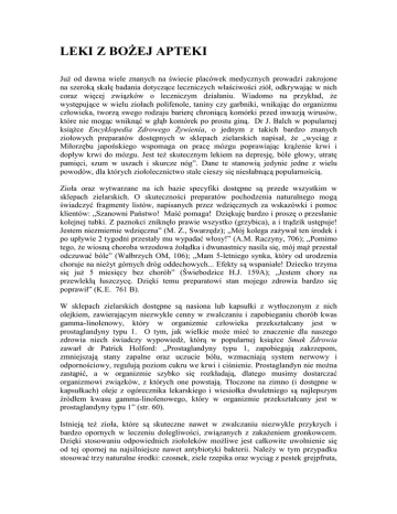 LEKI Z BOśEJ APTEKI JuŜ od dawna wiele znanych na świecie placówek medycznych prowadzi zakrojone na szeroką skalę badania dotyczące leczniczych właściwości ziół, odkrywając w nich coraz więcej związków o leczniczym działaniu. Wiadomo na przykład, Ŝe występujące w wielu ziołach polifenole, taniny czy garbniki, wnikając do organizmu człowieka, tworzą swego rodzaju barierę chroniącą komórki przed inwazją wirusów, które nie mogąc wniknąć w głąb komórek po prostu giną. Dr J. Balch w popularnej ksiąŜce Encyklopedia Zdrowego śywienia, o jednym z takich bardzo znanych ziołowych preparatów dostępnych w sklepach zielarskich napisał, Ŝe „wyciąg z Miłorzębu japońskiego wspomaga on pracę mózgu poprawiając krąŜenie krwi i dopływ krwi do mózgu. Jest teŜ skutecznym lekiem na depresję, bóle głowy, utratę pamięci, szum w uszach i skurcze nóg”. Dane te stanowią jedynie jedne z wielu powodów, dla których ziołolecznictwo stale cieszy się niesłabnącą popularnością. Zioła oraz wytwarzane na ich bazie specyfiki dostępne są przede wszystkim w sklepach zielarskich. O skuteczności preparatów pochodzenia naturalnego mogą świadczyć fragmenty listów, napisanych przez wdzięcznych za wskazówki i pomoc klientów: „Szanowni Państwo! Maść pomaga! Dziękuję bardzo i proszę o przesłanie kolejnej tubki. Z paznokci zniknęło prawie wszystko (grzybica), a i trądzik ustępuje! Jestem niezmiernie wdzięczna” (M. Z., Swarzędz); „Mój kolega zaŜywał ten środek i po upływie 2 tygodni przestały mu wypadać włosy!” (A.M. Raczyny, 706); „Pomimo tego, Ŝe wiosną choroba wrzodowa Ŝołądka i dwunastnicy nasila się, mój mąŜ przestał odczuwać bóle” (Wałbrzych OM, 106); „Mam 5-letniego synka, który od urodzenia choruje na nieŜyt górnych dróg oddechowych... Efekty są wspaniałe! Dziecko trzyma się juŜ 5 miesięcy bez chorób” (Świebodzice H.J. 159A); „Jestem chory na przewlekłą łuszczycę. Dzięki temu preparatowi stan mojego zdrowia bardzo się poprawił” (K.E. 761 B). W sklepach zielarskich dostępne są nasiona lub kapsułki z wytłoczonym z nich olejkiem, zawierającym niezwykle cenny w zwalczaniu i zapobieganiu chorób kwas gamma-linolenowy, który w organizmie człowieka przekształcany jest w prostaglandyny typu 1. O tym, jak wielkie moŜe mieć to znaczenie dla naszego zdrowia niech świadczy wypowiedź, którą w popularnej ksiąŜce Smak Zdrowia zawarł dr Patrick Holford: „Prostaglandyny typu 1, zapobiegają zakrzepom, zmniejszają stany zapalne oraz uczucie bólu, wzmacniają system nerwowy i odpornościowy, regulują poziom cukru we krwi i ciśnienie. Prostaglandyn nie moŜna zastąpić, a w organizmie szybko się rozkładają, dlatego musimy dostarczać organizmowi związków, z których one powstają. Tłoczone na zimno (i dostępne w kapsułkach) oleje z ogórecznika lekarskiego i wiesiołka dwuletniego są najlepszym źródłem kwasu gamma-linolenowego, który w organizmie przekształcany jest w prostaglandyny typu 1” (str. 60). Istnieją teŜ zioła, które są skuteczne nawet w zwalczaniu niezwykle przykrych i bardzo opornych w leczeniu dolegliwości, związanych z zakaŜeniem gronkowcem. Dzięki stosowaniu odpowiednich ziołoleków moŜliwe jest całkowite uwolnienie się od tej opornej na najsilniejsze nawet antybiotyki bakterii. NaleŜy w tym przypadku stosować trzy naturalne środki: czosnek, ziele rzepika oraz wyciąg z pestek grejpfruta, a cierpliwemu i regularnie stosującemu je pacjentowi z pewnością pomogą one w odzyskaniu zdrowia. Okazuje się, iŜ wśród naturalnych, ziołowych i zupełnie nieszkodliwych środków jest nawet taki, który moŜe okazać się bardzo pomocny w zwalczaniu nałogów. Na jego temat, jeden z naukowców, pracujących na Uniwersytecie Harwardzkim napisał: „Badaliśmy wiele róŜnych metod, uŜywanych przeciw alkoholizmowi. Okazało się, Ŝe większość z nich mogła mieć, co najwyŜej psychologiczny wpływ na powodowanie awersji do alkoholu i palenia papierosów. Jedynym środkiem, który przetrwał próbę czasu i którego skuteczność została potwierdzona, jest roślina o nazwie Kudzu. Badania przeprowadzone na Harwardzie wykazały, Ŝe moŜe ona zmniejszać pociąg do alkoholu aŜ o 80, a nawet 90%! Potwierdziły to doświadczenia prowadzone zarówno na ludziach, jak i biochemicznie uzaleŜnionych od alkoholu zwierzętach. Wykazano, Ŝe występującym w tej roślinie związkiem, który skutecznie zniechęca do picia alkoholu jest izoflawon - daidzeina”. Ta skuteczna w zwalczaniu nałogów roślina dostępna jest pod postacią mączki, którą stosuje się jako dodatek do spoŜywanych posiłków lub w formie kapsułek i moŜna nabyć ją w niektórych sklepach zielarskich. Dieta większości mieszkańców naszego kraju jest niestety uboga w tak waŜne składniki odŜywcze, jakimi są witaminy i minerały. Niewątpliwie, w organizmie kaŜdego kto często spoŜywa takie produkty jak: białe pieczywo, słodycze, ciasta, napoje słodzone, kawa itp. znajdują się niedostateczne ilości witamin i minerałów. Ich zaś niedobór stanowi jeden z głównych powodów najczęściej spotykanych chorób. W sklepach zielarskich moŜna nabyć kilka naturalnych preparatów witaminowych, które w przeciwieństwie do syntetycznych, są znacznie lepiej przyswajalne i skuteczniejsze w likwidowaniu objawów związanych z niedoborem niezbędnych dla organizmu składników odŜywczych. Wprawdzie w róŜnych czasopismach ukazały się informacje podwaŜające sens stosowania takich witaminowych suplementów, to okazuje się, Ŝe dane te nie są wiarygodne, a nawet pozbawione szczerych intencji. śeby się o tym przekonać, wystarczy przeczytać treść artykułu, jaki na łamach kwartalnika Zdrowa śywność zamieścił prof. Aleksander OŜarowski. Oto fragment jego bardzo interesującej wypowiedzi na ten temat: „Przyczyną ataków na witaminy 