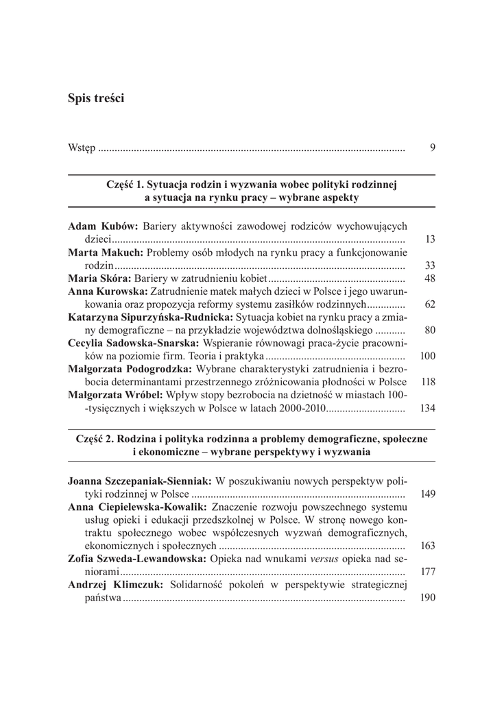 Spis treści Wstęp................................................................................................................. 9 Część 1. Sytuacja rodzin i wyzwania wobec polityki rodzinnej a sytuacja na rynku pracy – wybrane aspekty Adam Kubów: Bariery aktywności zawodowej rodziców wychowujących dzieci............................................................................................................ 13 Marta Makuch:Problemy osób młodych na rynku pracy a funkcjonowanie rodzin........................................................................................................... 33 Maria Skóra:Bariery w zatrudnieniu kobiet................................................... 48 Anna Kurowska:Zatrudnienie matek małych dzieci w Polsce i jego uwarunkowania oraz propozycja reformy systemu zasiłków rodzinnych............... 62 Katarzyna Sipurzyńska-Rudnicka:Sytuacja kobiet na rynku pracy a zmiany demograficzne – na przykładzie województwa dolnośląskiego............ 80 Cecylia Sadowska-Snarska: Wspieranie równowagi praca-życie pracowników na poziomie firm. Teoria i praktyka.................................................... 100 Małgorzata Podogrodzka: Wybrane charakterystyki zatrudnienia i bezrobocia determinantami przestrzennego zróżnicowania płodności w Polsce. 118 Małgorzata Wróbel:Wpływ stopy bezrobocia na dzietność w miastach 100-tysięcznych i większych w Polsce w latach 2000-2010.............................. 134 Część 2. Rodzina i polityka rodzinna a problemy demograficzne, społeczne i ekonomiczne – wybrane perspektywy i wyzwania Joanna Szczepaniak-Sienniak: W poszukiwaniu nowych perspektyw polityki rodzinnej w Polsce............................................................................... Anna Ciepielewska-Kowalik: Znaczenie rozwoju powszechnego systemu usług opieki i edukacji przedszkolnej w Polsce. W stronę nowego kontraktu społecznego wobec współczesnych wyzwań demograficznych, ekonomicznych i społecznych..................................................................... Zofia Szweda-Lewandowska: Opieka nad wnukami versus opieka nad seniorami......................................................................................................... Andrzej Klimczuk: Solidarność pokoleń w perspektywie strategicznej państwa........................................................................................................ 149 163 177 190 6 Spis treści Aleksandra Sienkiewicz-Gola: Realizacja polityki prorodzinnej w świetle ustawy o Zakładowym Funduszu Świadczeń Socjalnych na przykładzie jednego z zakładów wydobywczych województwa dolnośląskiego........... Aleksandra Gromelska:Analiza porównawcza rozwiązań w zakresie funkcjonowania ochrony zdrowia w Polsce i w Czechach w odniesieniu do kondycji zdrowotnej rodziny....................................................................... Sławomir Kalinowski: Wybrane aspekty aktywności ekonomicznej ludności wiejskiej o niepewnych dochodach a warunki funkcjonowania gospodarstw domowych na wsi............................................................................ Ireneusz Jaźwiński, Jerzy Bielec:Regionalna polityka ludnościowa w świetle wyników badania „Diagnoza społeczna województwa zachodniopomorskiego”................................................................................................... Katarzyna Maruszewska:Emigracja z Polski i jej skutki dla rodzin............ 206 226 243 261 274 Summaries Part 1. Family situation and challenges to family policy and the situation on the labour market – selected aspects Adam Kubów: Barriers to labor force participation of parents raising children........................................................................................................ 32 Marta Makuch: Young people’s problems on labour market vs. functioning of families.................................................................................................... 47 Maria Skóra:Barriers to the employment of women...................................... 61 Anna Kurowska: Employment of mothers of young children in Poland and its conditioning and a proposal to reform the system of family benefits.... 79 Katarzyna Sipurzyńska-Rudnicka:Position of women on the labour market in the context of demographic changes – on the example of Lower Silesia Voivodeship................................................................................................. 98 Cecylia Sadowska-Snarska: Supporting work-family life balance of employees at the company level. Theory and practice................................ 117 Małgorzata Podogrodzka: Selected characteristics of employment and unemployment as determinants of spatial variation of fertility in Poland.. 133 Małgorzata Wróbel:Influence of the unemployment rate on fertility rate in cities of 100 thousand and more inhabitants in Poland in the years 2000-2010............................................................................................................. 145 Spis treści 7 Part 2. Family and family policy and demographic, social and economic problems – selected perspectives and challenges Joanna Szczepaniak-Sienniak: In search of new perspectives of family policy in Poland........................................................................................... Anna Ciepielewska-Kowalik: Meaning of the universal preschool services system development in Poland. New social contract towards demographic, economic and social challenges................................................................... Zofia Szweda-Lewandowska:Child care vs. elderly care.............................. Andrzej Klimczuk: Solidarity between generations in strategic perspective of state.......................................................................................................... Aleksandra Sienkiewicz-Gola:Implementation of family policy in the light of Company Social Benefits