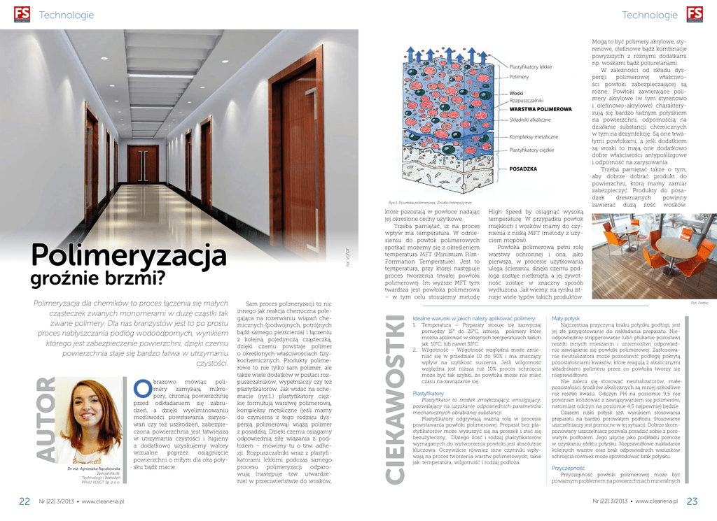 Technologie Technologie Plastyfikatory lekkie Polimery Woski Rozpuszczalniki WARSTWA POLIMEROWA Składniki alkaliczne Kompleksy metaliczne Plastyfikatory ciężkie POSADZKA Rys.1. Powłoka polimerowa, Źródło Interpolymer. groźnie brzmi? Polimeryzacja dla chemików to proces łączenia się małych cząsteczek zwanych monomerami w duże cząstki tak zwane polimery. Dla nas branżystów jest to po prostu proces nabłyszczania podłóg wodoodpornych, wynikiem którego jest zabezpieczenie powierzchni, dzięki czemu powierzchnia staje się bardzo łatwa w utrzymaniu czystości. AUTOR O Dr inż. Agnieszka Rączkowska Specjalista ds. Technologii i Wdrożeń PPHU VOIGT Sp. z o.o. 22 Nr [22] 3/2013 • www.cleaneria.pl brazowo mówiąc polimery zamykają mikropory, chronią powierzchnię przed odkładaniem się zabrudzeń, a dzięki wyeliminowaniu możliwości powstawania zarysowań czy też uszkodzeń, zabezpieczona powierzchnia jest łatwiejsza w utrzymania czystości i higieny a dodatkowo uzyskujemy walory wizualne poprzez osiągnięcie powierzchni o miłym dla oka połysku bądź macie. Sam proces polimeryzacji to nic innego jak reakcja chemiczna polegająca na rozerwaniu wiązań chemicznych (podwójnych, potrójnych bądź samego pierścienia) i łączeniu z kolejną pojedynczą cząsteczką, dzięki czemu powstaje polimer o określonych właściwościach fizykochemicznych. Produkty polimerowe to nie tylko sam polimer, ale także wiele dodatków w postaci rozpuszczalników, wypełniaczy czy też plastyfikatorów. Jak widać na schemacie (rys.1.) plastyfikatory ciężkie formułują warstwę polimerową, kompleksy metaliczne (jeśli mamy do czynienia z tego rodzaju dyspersją polimerową) wiążą polimer z posadzką. Dzięki czemu osiągamy odpowiednią siłę wiązania z podłożem – mówimy tu o tzw. adhezji. Rozpuszczalniki wraz z plastyfikatorami lekkimi podczas samego procesu polimeryzacji odparowują (następuje tzw. utwardzenie) w przeciwieństwie do wosków, High Speed by osiągnąć wysoką temperaturę. W przypadku powłok miękkich i wosków mamy do czynienia z niską MFT (metody z użyciem mopów). Powłoka polimerowa pełni rolę warstwy ochronnej i ona, jako pierwsza, w procesie użytkowania ulega ścieraniu, dzięki czemu podłoga zostaje nietknięta, a jej żywotność zostaje w znaczny sposób wydłużona. Jak wiemy, na rynku istnieje wiele typów takich produktów. Fot. Forbo CIEKAWOSTKI Fot. VOIGT Polimeryzacja które pozostają w powłoce nadając jej określone cechy użytkowe. Trzeba pamiętać, iż na proces wpływ ma temperatura. W odniesieniu do powłok polimerowych spotkać możemy się z określeniem temperatura MFT (Minimum FilmForrmation Temperature). Jest to temperatura, przy której następuje proces tworzenia trwałej powłoki polimerowej. Im wyższe MFT tym twardsza jest powłoka polimerowa – w tym celu stosujemy metodę Mogą to być polimery akrylowe, styrenowe, olefinowe bądź kombinacje powyższych z różnymi dodatkami np. woskami bądź poliuretanami. W zależności od składu dyspersji polimerowej właściwości powłoki zabezpieczającej są różne. Powłoki zawierające polimery akrylowe (w tym styrenowo i olefinowo-akrylowe) charakteryzują się bardzo ładnym połyskiem na powierzchni, odpornością na działanie substancji chemicznych w tym na dezynfekcję. Są one trwałymi powłokami, a jeśli dodatkiem są woski to mają one dodatkowo dobre właściwości antypoślizgowe i odporność na zarysowania. Trzeba pamiętać także o tym, aby dobrze dobrać produkt do powierzchni, którą mamy zamiar zabezpieczyć. Produkty do posadzek drewnianych powinny zawierać dużą ilość wosków. Idealne warunki w jakich należy aplikować polimery: Mały połysk 1. Temperatura – Preparaty stosuje się zazwyczaj pomiędzy 15° do 25°C, istnieją polimery które można aplikować w skrajnych temperaturach takich jak: 10°C, lub nawet 32°C. 2. Wilgotność – Wilgotność względna może zmieniać się w przedziale 10 do 90% i ma znaczący wpływ na szybkość suszenia. Jeśli wilgotność względna jest niższa niż 10% proces schnięcia może być tak szybki, że powłoka może nie mieć czasu na zawiązanie się. Najczęstszą przyczyną braku połysku podłogi, jest jej złe przygotowanie do nakładania preparatu. Nieodpowiednie stripperowanie lub/i płukanie pozostawi resztki innych mieszanin i uniemożliwi odpowiednie zawiązanie się powłoki polimerowej. Zastosowanie neutralizatora może pozostawić podłogę pokrytą pozostałościami kwasów, które reagują z alkalicznymi składnikami polimeru przez co powłoka tworzy się nieprawidłowo. Nie zaleca się stosować neutralizatorów, małe pozostałości środków alkalicznych są mniej szkodliwe niż resztki kwasu. Odczyn PH na poziomie 9,5 nie powinien kolidować z zawiązywaniem się polimerów, natomiast odczyn na poziomie 4,5 najpewniej będzie. Czasem niski połysk jest wynikiem stosowania preparatu na bardzo porowatym podłożu. Stosowanie uszczelniaczy jest pomocne w tej sytuacji. Dobrze skomponowany uszczelniacz pozwala poradzić sobie z porowatym podłożem. Jego użycie jako podkładu pomoże w uzyskaniu efektu połysku. Nieprawidłowe nakładanie kolejnych warstw oraz brak odpowiednich warunków schnięcia również może spowodować brak połysku. Plastyfikatory Plastyfikator to środek zmiękczający, emulgujący, pozwalający na uzyskanie odpowiednich parametrów mechanicznych obrabianej substancji. Plastyfikatory odgrywają ważną rolę w procesie powstawania powłoki polimerowej. Preparat bez plastyfikatorów może wysuszyć się na proszek i stać się bezużyteczny. Dlatego ilość i rodzaj plastyfikatorów wymaganych do wytworzenia powłoki jest absolutnie kluczowa. Oczywiście również inne czynniki wpływają na proces tworzenia warstw polimerowych, takie jak: temperatura, wilgotność i rodzaj podłoża. Przyczepność Przyczepność powłoki polimerowej może b