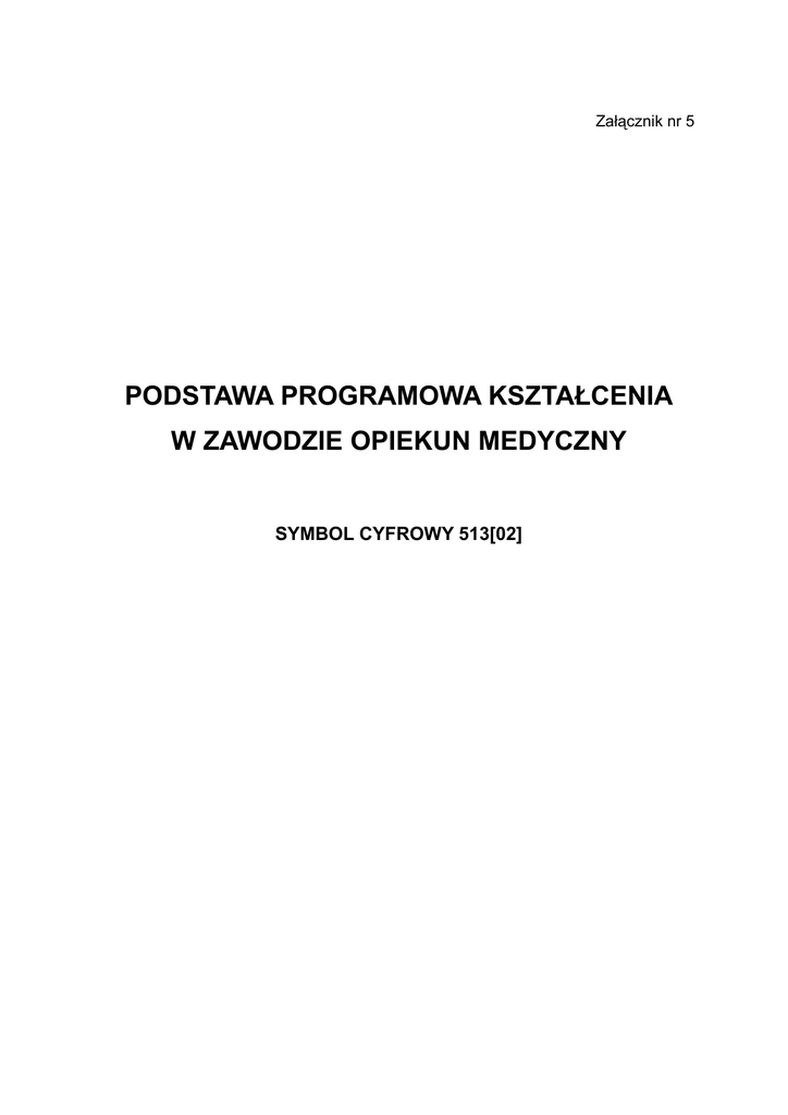Załącznik nr 5 PODSTAWA PROGRAMOWA KSZTAŁCENIA W ZAWODZIE OPIEKUN MEDYCZNY SYMBOL CYFROWY 513[02] I. OPIS ZAWODU 1. W wyniku kształcenia w zawodzie absolwent powinien umieć: 1) rozpoznawać problemy opiekuńcze osoby chorej i niesamodzielnej; 2) współpracować z pielęgniarką w zakresie planowania i realizowania planu opieki nad osobą chorą i niesamodzielną; 3) pomagać podczas wykonywania zabiegów pielęgniarskich; 4) wykonywać polecenia pielęgniarki i lekarza dotyczące opieki nad osobą chorą i niesamodzielną; 5) pomagać osobie chorej i niesamodzielnej w zaspokajaniu potrzeb związanych z utrzymaniem ciała w czystości; 6) wykonywać zabiegi higieniczne u osoby chorej i niesamodzielnej; 7) wykonywać czynności związane z utrzymaniem czystości i estetyki łóżka oraz najbliższego otoczenia osoby chorej i niesamodzielnej; 8) pomagać osobie chorej i niesamodzielnej w zaspokajaniu potrzeb i niesamodzielnej w zaspokajaniu potrzeb związanych z odżywianiem; 9) pomagać osobie chorej związanych z wydalaniem; 10) pomagać osobie chorej i niesamodzielnej w utrzymaniu aktywności ruchowej; 11) pomagać osobie chorej i niesamodzielnej w użytkowaniu przedmiotów ortopedycznych i sprzętu rehabilitacyjnego; 12) stosować urządzenia, przybory i narzędzia niezbędne podczas wykonywania czynności higienicznych; 13) dezynfekować i konserwować przybory i narzędzia stosowane podczas wykonywania zabiegów pielęgniarskich; 14) zapewniać osobie chorej i niesamodzielnej bezpieczeństwo podczas wykonywania zabiegów higienicznych; 15) dokumentować wykonane zabiegi higieniczne; 16) nawiązywać i utrzymywać kontakty międzyludzkie; 17) pomagać osobie chorej i niesamodzielnej w adaptacji do warunków życia w szpitalu oraz zmian związanych z przewlekłą chorobą lub starością; 18) pomagać osobie chorej i niesamodzielnej w komunikowaniu się z rodziną, 2 zespołem opiekuńczym i terapeutycznym oraz z innymi pacjentami; 19) udzielać wsparcia emocjonalnego osobie chorej i niesamodzielnej oraz jej rodzinie; 20) przestrzegać przepisów sanitarnych podczas wykonywania zadań zawodowych; 21) stosować przepisy prawa dotyczące wykonywanych zadań zawodowych; 22) przestrzegać przepisów i zasad bezpieczeństwa i higieny pracy, przepisów ochrony przeciwpożarowej oraz ochrony środowiska; 23) organizować stanowisko pracy zgodnie z wymaganiami ergonomii; 24) komunikować się z uczestnikami procesu pracy; 25) stosować przepisy Kodeksu pracy dotyczące praw i obowiązków pracownika i pracodawcy; 26) udzielać pierwszej pomocy w stanach zagrożenia życia i zdrowia; 27) korzystać z różnych źródeł informacji; 28) prowadzić działalność gospodarczą. Kształtowanie postaw przedsiębiorczych oraz przygotowanie do wejścia na rynek pracy powinno przebiegać zarówno w trakcie kształcenia zawodowego, jak i podczas realizacji zajęć edukacyjnych „Podstawy przedsiębiorczości”. 2. Absolwent szkoły kształcącej w zawodzie opiekun medyczny powinien być przygotowany do wykonywania następujących zadań zawodowych: 1) rozpoznawania i rozwiązywania problemów opiekuńczych osoby chorej i niesamodzielnej o różnym stopniu zaawansowania choroby i w różnym wieku; 2) pomagania osobie chorej i niesamodzielnej w zaspokajaniu podstawowych potrzeb biologicznych; 3) pomagania osobie chorej i niesamodzielnej w podtrzymywaniu aktywności społecznej; 4) aktywizowania osoby chorej i niesamodzielnej do zwiększania samodzielności życiowej; 5) zapewniania osobie chorej i niesamodzielnej bezpieczeństwa fizycznego i psychicznego; 3 6) zapewniania osobie chorej i niesamodzielnej higienicznych warunków otoczenia; 7) wykonywania zabiegów higienicznych; 8) współdziałania z zespołem opiekuńczym i terapeutycznym; 9) asystowania pielęgniarce podczas wykonywania zabiegów pielęgniarskich; 10) użytkowania urządzeń, przyborów oraz narzędzi do wykonywania zabiegów higienicznych; 11) konserwacji przyborów i narzędzi stosowanych podczas wykonywania zabiegów pielęgniarskich; 12) popularyzowania zachowań prozdrowotnych. II. BLOKI PROGRAMOWE Zakres umiejętności i treści kształcenia, wynikający z opisu zawodu, zawierają następujące bloki programowe: 1) medyczne podstawy zawodu; 2) opieka nad osobą chorą i niesamodzielną; 3) podstawy działalności zawodowej. BLOK: MEDYCZNE PODSTAWY ZAWODU 1. Cele kształcenia Uczeń (słuchacz) w wyniku kształcenia powinien umieć: 1) posługiwać się podstawową terminologią z zakresu anatomii, fizjologii, patologii, higieny i promocji zdrowia; 2) wyjaśniać budowę i czynności układów oraz narządów człowieka; 3) wyjaśniać pojęcia zdrowia i choroby; 4) charakteryzować czynniki chorobotwórcze; 5) charakteryzować źródła i drogi szerzenia się chorób; 6) określać wpływ czynników środowiskowych na zdrowie człowieka; 7) wyjaśniać podstawowe procesy patologiczne; 8) opisywać objawy charakterystyczne dla schorzeń poszczególnych układów; 4 9) wyjaśniać znaczenie przestrzegania higieny dla zdrowia człowieka; 10) przestrzegać zasad aseptyki i antyseptyki; 11) zapobiegać występowaniu zakażeń szpitalnych; 12) stosować procedury dotyczące postępowania z odpadami medycznymi; 13) charakteryzować zachowania sprzyjające i zagrażające zdrowiu; 14) uczestniczyć w tworzeniu zdrowego i przyjaznego dla osoby chorej środowiska; 15) planować działania prozdrowotne; 16) prowadzić edukację w zakresie higieny osobistej i otoczenia; 17) stosować zasady profilaktyki chorób; 18) charakteryzować system organizacji ochrony zdrowia i pomocy społecznej w Polsce. 2. Treści kształcenia (działy programowe) Treści kształcenia są ujęte w następujących działach programowych: 1) podstawowe pojęcia z zakresu anatomii, fizjologii, patologii i higieny; 2) budowa i funkcjonowanie organizmu człowieka; 3) czynniki chorobotwórcze; 4) źródła i drogi szerzenia się chorób; 5) środowisko a zdrowie cz