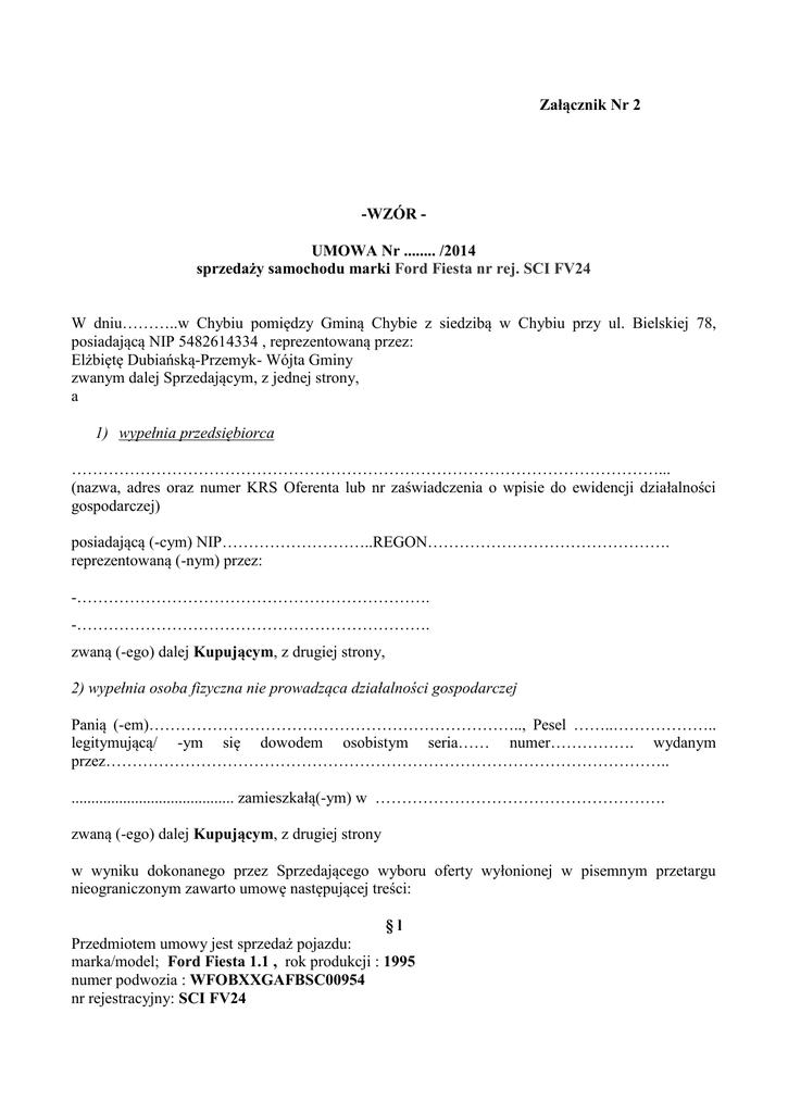 Załącznik Nr 2 -WZÓR UMOWA Nr ........ /2014 sprzedaży samochodu marki Ford Fiesta nr rej. SCI FV24 W dniu………..w Chybiu pomiędzy Gminą Chybie z siedzibą w Chybiu przy ul. Bielskiej 78, posiadającą NIP 5482614334 , reprezentowaną przez: Elżbiętę Dubiańską-Przemyk- Wójta Gminy zwanym dalej Sprzedającym, z jednej strony, a 1) wypełnia przedsiębiorca …………………………………………………………………………………………………... (nazwa, adres oraz numer KRS Oferenta lub nr zaświadczenia o wpisie do ewidencji działalności gospodarczej) posiadającą (-cym) NIP………………………..REGON………………………………………. reprezentowaną (-nym) przez: -…………………………………………………………. -…………………………………………………………. zwaną (-ego) dalej Kupującym, z drugiej strony, 2) wypełnia osoba fizyczna nie prowadząca działalności gospodarczej Panią (-em)…………………………………………………………….., Pesel ……..……………….. legitymującą/ -ym się dowodem osobistym seria…… numer……………. wydanym przez…………………………………………………………………………………………….. ......................................... zamieszkałą(-ym) w ………………………………………………. zwaną (-ego) dalej Kupującym, z drugiej strony w wyniku dokonanego przez Sprzedającego wyboru oferty wyłonionej w pisemnym przetargu nieograniczonym zawarto umowę następującej treści: §l Przedmiotem umowy jest sprzedaż pojazdu: marka/model; Ford Fiesta 1.1 , rok produkcji : 1995 numer podwozia : WFOBXXGAFBSC00954 nr rejestracyjny: SCI FV24 §2 Sprzedający oświadcza, że pojazd będący przedmiotem umowy stanowi jego wyłączną własność, jest wolny od wad prawnych oraz praw osób trzecich, iż nie toczy się żadne postępowanie, którego przedmiotem jest ten pojazd, oraz że nie stanowi on również przedmiotu zabezpieczenia. §3 Kupujący tytułem ceny za przedmiotowy pojazd zapłaci Sprzedającemu kwotę brutto: ………………………….złotych ……………….groszy. (słownie:……………………………………………………………………………. ). przelewem na rachunek bankowy Sprzedającego nr ……………………………………………………………… na podstawie faktury VAT w terminie 7 dni. §4 1. Wydanie przedmiotu sprzedaży nastąpi w siedzibie Sprzedającego, niezwłocznie po zapłacie należnej kwoty, o której mowa w §3. 2. Datą zapłaty należnej ceny jest data uznania wskazanego rachunku bankowego. 3. Sprzedający wyda Kupującemu wszystkie posiadane dokumenty dotyczące pojazdu, niezbędne do prawidłowego korzystania z niego. §5 1. Kupujący stwierdza że znany jest mu stan techniczny pojazdu określonego w § l niniejszej umowy i oświadcza, że z tego tytułu nie będzie rościł żadnych pretensji do Sprzedającego. 2. Kupujący sprawdził oznaczenia numerowe pojazdu i dowodu rejestracyjnego i nie wnosi do nich żadnych zastrzeżeń. 3.Strony ustaliły, że wszelkie koszty transakcji wynikające z ustaleń niniejszej umowy obciążają Kupującego. §6 1. W sprawach nie uregulowanych niniejszą umową mają zastosowanie przepisy Kodeksu cywilnego. 2. Umowę sporządzono w dwóch jednobrzmiących egzemplarzach, po jednym dla każdej ze stron. SPRZEDAJĄCY: KUPUJĄCY: