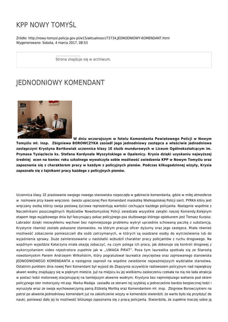 KPP NOWY TOMYŚL Źródło: http://nowy-tomysl.policja.gov.pl/w15/aktualnosci/73734,JEDNODNIOWY-KOMENDANT.html Wygenerowano: Sobota, 4 marca 2017, 08:53 Strona znajduje się w archiwum. JEDNODNIOWY KOMENDANT W dniu wczorajszym w fotelu Komendanta Powiatowego Policji w Nowym Tomyślu mł. insp. Zbigniewa BOROWCZYKA zasiadł jego jednodniowy zastępca a właściwie jednodniowa zastępczyni Krystyna Bartkowiak uczennica klasy 1E służb mundurowych w Liceum Ogólnokształcącym im. Prymasa Tysiąclecia ks. Stefana Kardynała Wyszyńskiego w Opalenicy. Krysia dzięki uzyskaniu najwyższej średniej ocen na koniec roku szkolnego wywalczyła sobie możliwość zwiedzenia KPP w Nowym Tomyślu oraz zapoznania się z charakterem pracy w każdym z policyjnych pionów. Podczas kilkugodzinnej wizyty, Krysia zapoznała się z tajnikami pracy każdego z policyjnych pionów. Uczennica klasy 1E piastowanie swojego nowego stanowiska rozpoczęła w gabinecie komendanta, gdzie w miłej atmosferze w rozmowie przy kawie wręczono świeżo upieczonej Pani Komendant maskotkę Wielkopolskiej Policji sierż. PYRKA który jest wręczany osobą którzy swoja postawą życiowa reprezentują wartości cechujące każdego policjanta. Następnie wspólnie z Naczelnikami poszczególnych Wydziałów Nowotomyskiej Policji zwiedzała wszystkie zakątki naszej Komendy.Kolejnym etapem tego wyjątkowego dnia był fascynujący pokaz policyjnego psa służbowego którego opiekunem jest Tomasz Kurpisz. Labrador dzięki niezwykłemu węchowi bez najmniejszego problemu wykrył uprzednio schowaną paczkę z substancją. Krystynie również zostało pokazane stanowisko, na którym pracuje oficer dyżurny oraz jego zastępca. Miała również możliwość zobaczenie pomieszczeń dla osób zatrzymanych, w których są osadzane osoby do wytrzeźwienia lub do wyjaśnienia sprawy. Duże zainteresowanie u nastolatki wzbudził charakter pracy policjantów z ruchu drogowego. Na wspólnym wyjeździe Katarzyna miała okazję zobaczyć, na czym polega ich praca, jak dokonuje się kontroli drogowej z wykorzystaniem video rejestratora zupełnie jak w ,,UWAGA PIRAT”. Poza tym laureatka spotkała się ze Starostą nowotomyskim Panem Andrzejem Wilkońskim, który pogratulował laureatce zwycięstwa oraz zajmowanego stanowiska JEDNODNIOWEGO KOMENDANTA a następnie zaprosił na wspólne zwiedzenie najważniejszych wydziałów starostwa. Ostatnim punktem dnia nowej Pani Komendant był wyjazd do Zbąszynia oczywiście radiowozem policyjnym nad największy akwen wodny znajdujący się w pięknym mieście. Już na miejscu ku jej wielkiemu zaskoczeniu czekała na nią nie lada atrakcja w postaci łodzi motorowej stacjonującej na tamtejszym akwenie wodnym. Krystyna bez najmniejszego wahania pod okiem policyjnego ster motorzysty mł.asp. Marka Madaja zasiadła za sterami tej szybkiej a jednocześnie bardzo bezpiecznej łodzi i wyruszyła wraz ze swoja wychowawczynią panią Elżbietą Mortką oraz Komendantem mł. insp. Zbigniew Borowczykiem na patrol po akwenie.Jednodniowy komendant już na zakończenie wizyty w komendzie stwierdził, że warto było się przyłożyć do nauki, ponieważ dało jej to możliwość bliższego zapoznania się z pracą policjanta. Stwierdziła, że zupełnie inaczej sobie ją wyobrażała i będzie inaczej patrzeć na wiele aspektów związanych z funkcjonowaniem Policji jak i zadaniami wykonywanymi przez policjantów oraz zapewniła Komendanta że i w przyszłym roku zrobi wszystko by osiągnąć najlepszy wyniki w nauce, co pozwoli by kolejny raz zasiać w komendanta fotelu a w przyszłości podjąć prace w Policji. Zapytana czego spodziewała się po wizycie, z uśmiechem powiedziała ze myślała ze będzie odrobinę nudno, sztywno i oficjalnie, a to co przygotował dla niej Komendant przerosło jej najśmielsze oczekiwania. ,,Jedno jest pewne mają czego mi zazdrości koledzy z klasy i nie tylko z klasy.’’ Powiedziała na zakończenie Krystyna Bartkowiak /jednodniowy komendant autor Mateusz Grzeszkowiak Ocena: 0/5 (0) Tweetnij