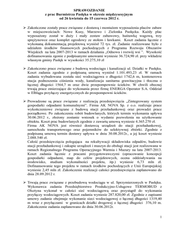 SPRAWOZDANIE z prac Burmistrza Pasłęka w okresie międzysesyjnym od 26 kwietnia do 15 czerwca 2012 r. ➢ Zakończone zostały prace związane z dostawą i montażem wyposażenia placów zabaw w miejscowościach: Nowe Kusy, Marzewo i Zielonka Pasłęcka. Każdy plac wyposażony został w duży i mały zestaw zabawowy, huśtawkę wagową, trzy sprężynowce oraz komplet ogrodowy ze stołem i ławkami. Koszt zadania łącznie z wykonaną dokumentacją projektową wyniósł 72 tys. zł. Zadanie realizowane było z udziałem środków finansowych pochodzących z Programu Rozwoju Obszarów Wiejskich na lata 2007-2013 w ramach działania „Odnowa i rozwój wsi ”. Wysokość dofinansowania zgonie z podpisanymi umowami wyniesie 36.724,90 zł. przy wkładzie własnym gminy Pasłęk w wysokości 35.275,10 zł ➢ Zakończono prace związane z budową wodociągu i kanalizacji ul. Działki w Pasłęku. Koszt zadania zgodnie z podpisaną umową wyniósł 1.101.493,23 zł. W ramach zadania wybudowana została sieć wodociągowa o długości 1742,6 m, kontenerowa stacja podnoszenia ciśnienia wody, kanalizacja sanitarna grawitacyjna i tłoczna o łącznej długości 1564,7 m oraz dwie przepompownie ścieków. W chwili obecnej trwają prace zmierzające do wykonania przez firmę ENERGA Operator S.A. Oddział w Elblągu przyłączy energetycznych do przepompowni ścieków. ➢ Prowadzone są prace związane z realizacją przedsięwzięcia „Zintegrowany system gospodarki odpadami komunalnymi”. Firma AK NOVA Sp. z o.o. realizuje prace wykończeniowe związane z budową stacji przeładunkowej oraz prowadzi prace porządkowe. Po zakończeniu robót budowlanych, których termin wykonania upływa 30.06.2012 r., złożony zostanie wniosek o wydanie pozwolenia na użytkowanie obiektu. Koszt prac budowlanych zgodnie z zawartą umową wyniesie 4.365.270 zł. Firma AK NOVA jest również dostawcą urządzeń do stacji przeładunkowej, samochodu transportowego oraz pojemników do selektywnej zbiórki. Zgodnie z podpisaną umową termin dostawy upływa w dniu 30.08.2012r., a jej koszt wyniesie 2.088.540 zł. Całość przedsięwzięcia polegająca na rekultywacji składowiska odpadów, budowie stacji przeładunkowej i zakupie urządzeń i maszyn do obsługi stacji jest realizowana w ramach Regionalnego Programu Operacyjnego Warmia i Mazury na lata 2007-2013. Koszt zadania łącznie z pracami przygotowawczymi (opracowanie koncepcji gospodarki odpadami, map do celów projektowych, ocena oddziaływania na środowisko, studium wykonalności projektu, itp.) wyniesie 6,73 mln zł. Dofinansowanie tego projektu w ramach środków pochodzących z Unii Europejskiej wyniesie 2,45 mln zł. Zakończenie realizacji całości przedsięwzięcia zaplanowano do dnia 28.09.2012 r. ➢ Trwają prace związane z przebudową wodociągu w ul. Sprzymierzonych w Pasłęku. Wykonawca zadania Przedsiębiorstwo Produkcyjno-Usługowe TERMOBUD z Olsztyna wykonał w całości sieć wodociągową oraz przystąpił do wykonania przyłączy wodociągowych. Koszt zadania wyniesie 287.820,00 zł. Zgodnie z zapisami umowy zadanie obejmuje wykonanie sieci wodociągowej o łącznej długości 1319,40 m wraz z przyłączami w granicach działki drogowej o łącznej długości 376,10 m. Zakończenie zadania zaplanowano do dnia 30.06.2012r. 1 ➢ Trwają prace w ramach zadania „Modernizacja – przebudowa i rozbudowa oczyszczalni ścieków w Pasłęku”. Wyremontowano pierwszy z reaktorów biologicznych i zamontowano ruszta do napowietrzania drobno-pęcherzykowego ścieków. Zaszczepione zostały nowe bakterie i reaktor rozpoczął pracę z wyremontowanym osadnikiem wtórnym. Wykonawca zadania opróżnił i obecnie oczyszcza kolejną komorę reaktora biologicznego oraz wykonuje naprawę izolacji. Istniejący osadnik wstępny na terenie oczyszczalni został zaadaptowany na komorę stabilizacji osadu. Dwie stacje dmuchaw zostały wyposażone w dmuchawy i nowe zasilanie energetyczne. Magazyn odpadów stałych został pokryty blachą i dokonano wypełnienia ścian elementami betonowymi. Na terenie oczyszczalni układane są nowe kable zasilające, sterowania i pomiarowe pomiędzy rozdzielniami a aparaturą i urządzeniami zamontowywanymi w oczyszczalni. Koszt prac w ramach zadania wyniesie zgodnie z podpisaną umową 5.226.717,46 zł. Termin zakończenia prac zaplanowano do 30.09.2012r. Realizacja zadania służy dostosowaniu oczyszczalni ścieków w Pasłęku do obowiązujących przepisów w zakresie oczyszczania ścieków. Realizowane zadanie będzie współfinansowane ze środków Europejskiego Funduszu Rozwoju Regionalnego z zakresu osi priorytetowej – Środowisko przyrodnicze. Wartość projektu wynosi 6.881.266,75 zł, natomiast dofinansowanie UE 5.463.725,79 zł, co stanowi 79,40% wydatków kwalifikowanych. ➢ Zakończone zostały prace projektowe związane z zaplanowanym remontem w Szkole Podstawowej z Oddziałami Integracyjnymi w Zielonce Pasłęckiej. W ramach realizowanej inwestycji złożony został do Starostwa Powiatowego w Elblągu wniosek o wydanie pozwolenia na budowę. Przypominam, iż zakres przewidzianych do wykonania prac obejmuje wykonanie nowego pokrycia dachowego budynku szkoły z jego ociepleniem, remont kominów i wymianę obróbek blacharskich, wymianę konstrukcji dachu na sali sportowej oraz wykonanie nowej elewacji i ocieplenia budynku. W ramach prac wewnętrznych zaplanowano remont pomieszczeń socjalnych przy sali sportowej z wykonaniem sanitariatów i szatni, w tym również wykonanie sanitariatu dla osób niepełnosprawnych. W części dotyczącej zaplecza i sali sportowej zaplanowano również wymianę instalacji elektrycznej, wykonanie wentylacji, wymianę podłogi oraz prace malarskie. ➢ Prowadzone są prace zmierzające do wykonania dokumentacji projektowej w ramach zadania polegającego na budowie remizy strażackiej w miejscowości Stegny. Wykonawcą dokumentacji projektowej jest firma Usługi Budowlane CO