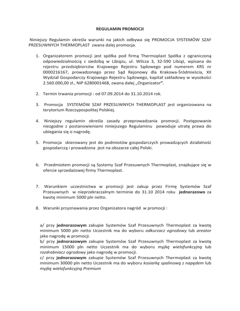 Z'h>D/EWZKDK:/ EŝŶŝĞũƐnjLJ ZĞŐƵůĂŵŝŶ ŽŬƌĞƑůĂ ǁĂƌƵŶŬŝ ŶĂ ũĂŬŝĐŚ ŽĚďLJǁĂ Ɛŝħ WZKDK: ^z^dDMt ^& WZ^htEz,d,ZDKW>^dnjǁĂŶĂĚĂůĞũƉƌŽŵŽĐũĂ͘ ϭ͘ KƌŐĂŶŝnjĂƚŽƌĞŵ ƉƌŽŵŽĐũŝ ũĞƐƚ ƐƉſųŬĂ ƉŽĚ ĨŝƌŵČ dŚĞƌŵŽƉůĂƐƚ ^ƉſųŬĂ nj ŽŐƌĂŶŝĐnjŽŶČ ŽĚƉŽǁŝĞĚnjŝĂůŶŽƑĐŝČ nj ƐŝĞĚnjŝďČ ǁ >ŝďŝČǏƵ͕ Ƶů͘ tŝůĐnjĂ ϯ͕ ϯϮͲϱϵϬ >ŝďŝČǏ͕ ǁƉŝƐĂŶĂ ĚŽ ƌĞũĞƐƚƌƵ ƉƌnjĞĚƐŝħďŝŽƌĐſǁ <ƌĂũŽǁĞŐŽ ZĞũĞƐƚƌƵ ^ČĚŽǁĞŐŽ ƉŽĚ ŶƵŵĞƌĞŵ <Z^ Ŷƌ ϬϬϬϬϮϭϲϭϲϳ͕ ƉƌŽǁĂĚnjŽŶĞŐŽ ƉƌnjĞnj ^ČĚ ZĞũŽŶŽǁLJ ĚůĂ <ƌĂŬŽǁĂͲ_ƌſĚŵŝĞƑĐŝĂ͕ y// tLJĚnjŝĂų'ŽƐƉŽĚĂƌĐnjLJ<ƌĂũŽǁĞŐŽZĞũĞƐƚƌƵ^ČĚŽǁĞŐŽ͕ŬĂƉŝƚĂųnjĂŬųĂĚŽǁLJǁǁLJƐŽŬŽƑĐŝ Ϯ͘ϱϲϬ͘ϬϬϬ͕ϬϬnjų͕͘E/WϲϮϴϬϬϬϭϰϲϴ͕njǁĂŶĂĚĂůĞũͣKƌŐĂŶŝnjĂƚŽƌ͘͟ Ϯ͘ dĞƌŵŝŶƚƌǁĂŶŝĂƉƌŽŵŽĐũŝ͗ŽĚϬϳ͘Ϭϵ͘ϮϬϭϰĚŽϯϭ͘ϭϬ͘ϮϬϭϰƌŽŬ͘ ϯ͘ WƌŽŵŽĐũĂ ^z^dDMt ^& WZ^htEz, d,ZDKW>^d ũĞƐƚ ŽƌŐĂŶŝnjŽǁĂŶĂ ŶĂ ƚĞƌLJƚŽƌŝƵŵZnjĞĐnjLJƉŽƐƉŽůŝƚĞũWŽůƐŬŝĞũ͘ ϰ͘ EŝŶŝĞũƐnjLJ ƌĞŐƵůĂŵŝŶ ŽŬƌĞƑůĂ njĂƐĂĚLJ ƉƌnjĞƉƌŽǁĂĚnjĂŶŝĂ ƉƌŽŵŽĐũŝ͘ WŽƐƚħƉŽǁĂŶŝĞ ŶŝĞnjŐŽĚŶĞ nj ƉŽƐƚĂŶŽǁŝĞŶŝĂŵŝ ŶŝŶŝĞũƐnjĞŐŽ ZĞŐƵůĂŵŝŶƵ ƉŽǁŽĚƵũĞ ƵƚƌĂƚħ ƉƌĂǁĂ ĚŽ ƵďŝĞŐĂŶŝĂƐŝħŽŶĂŐƌŽĚħ͘ ϱ͘ WƌŽŵŽĐũĂ ƐŬŝĞƌŽǁĂŶLJ ũĞƐƚ ĚŽ ƉŽĚŵŝŽƚſǁ ŐŽƐƉŽĚĂƌĐnjLJĐŚ ƉƌŽǁĂĚnjČĐLJĐŚ ĚnjŝĂųĂůŶŽƑđ ŐŽƐƉŽĚĂƌĐnjČŝƉƌŽǁĂĚnjŽŶĂũĞƐƚŶĂŽďƐnjĂƌnjĞĐĂųĞũWŽůƐŬŝ͘ ϲ͘ WƌnjĞĚŵŝŽƚĞŵƉƌŽŵŽĐũŝƐČ^LJƐƚĞŵLJ^njĂĨWƌnjĞƐƵǁŶLJĐŚdŚĞƌŵŽƉůĂƐƚ͕njŶĂũĚƵũČĐĞƐŝħǁ ŽĨĞƌĐŝĞƐƉƌnjĞĚĂǏŽǁĞũĨŝƌŵLJdŚĞƌŵŽƉůĂƐƚ͘ ϳ͘ tĂƌƵŶŬŝĞŵ ƵĐnjĞƐƚŶŝĐƚǁĂ ǁ ƉƌŽŵŽĐũŝ ũĞƐƚ njĂŬƵƉ ƉƌnjĞnj &ŝƌŵħ ^LJƐƚĞŵſǁ ^njĂĨ WƌnjĞƐƵǁŶLJĐŚ ǁ ŶŝĞƉƌnjĞŬƌĂĐnjĂůŶLJŵ ƚĞƌŵŝŶŝĞ ĚŽ ϯϭ͘ϭϬ ϮϬϭϰ ƌŽŬƵ ũĞĚŶŽƌĂnjŽǁŽ njĂ ŬǁŽƚħŵŝŶŝŵƵŵϱϬϬϬƉůŶŶĞƚƚŽ͘ ϴ͘ tĂƌƵŶŬŝƉƌnjLJnjŶĂǁĂŶŝĂƉƌnjĞnjKƌŐĂŶŝnjĂƚŽƌĂŶĂŐƌſĚǁƉƌŽŵŽĐũŝ͗ Ăͬ ƉƌnjLJ ũĞĚŶŽƌĂnjŽǁLJŵ njĂŬƵƉŝĞ ^LJƐƚĞŵſǁ ^njĂĨ WƌnjĞƐƵǁŶLJĐŚ dŚĞƌŵŽƉůĂƐƚ njĂ ŬǁŽƚħ ŵŝŶŝŵƵŵ ϱϬϬϬ ƉůŶ ŶĞƚƚŽ hĐnjĞƐƚŶŝŬ ŵĂ ĚŽ ǁLJďŽƌƵ ŽĚŬƵƌnjĂĐnj ŽŐƌŽĚŽǁLJ ůƵď ĂƌĞĂƚŽƌ ũĂŬŽŶĂŐƌŽĚħǁƉƌŽŵŽĐũŝ͘ ďͬ ƉƌnjLJ ũĞĚŶŽƌĂnjŽǁLJŵ njĂŬƵƉŝĞ ^LJƐƚĞŵſǁ ^njĂĨ WƌnjĞƐƵǁŶLJĐŚ dŚĞƌŵŽƉůĂƐƚ njĂ ŬǁŽƚħ ŵŝŶŝŵƵŵ ϭϱϬϬϬ ƉůŶ ŶĞƚƚŽ hĐnjĞƐƚŶŝŬ ŵĂ ĚŽ ǁLJďŽƌƵ ŵLJũŬħ ǁŝĞůŽĨƵŶŬĐLJũŶČ ůƵď ƌŽnjĚƌĂďŶŝĂĐnjŽŐƌŽĚŽǁLJũĂŬŽŶĂŐƌŽĚħǁƉƌŽŵŽĐũŝ͘ Đͬ ƉƌnjLJ ũĞĚŶŽƌĂnjŽǁLJŵ njĂŬƵƉŝĞ ^LJƐƚĞŵſǁ ^njĂĨ WƌnjĞƐƵǁŶLJĐŚ dŚĞƌŵŽƉůĂƐƚ njĂ ŬǁŽƚħ ŵŝŶŝŵƵŵϯϬϬϬϬƉůŶŶĞƚƚŽhĐnjĞƐƚŶŝŬŵĂĚŽǁLJďŽƌƵŬŽƐŝĂƌŬħƐƉĂůŝŶŽǁČnjŶĂƉħĚĞŵůƵď ŵLJũŬħǁŝĞůŽĨƵŶŬĐLJũŶČWƌĞŵŝƵŵ ϵ͘ KƌŐĂŶŝnjĂƚŽƌ njŽďŽǁŝČnjƵũĞ Ɛŝħ ĚŽ ĚŽƐƚĂƌĐnjĞŶŝĂ ŶĂŐƌŽĚLJ ĚŽ ƐŝĞĚnjŝďLJ hĐnjĞƐƚŶŝŬĂ ůƵď ŝŶŶĞŐŽ ǁƐŬĂnjĂŶĞŐŽ ƉƌnjĞnj hĐnjĞƐƚŶŝŬĂ ŵŝĞũƐĐĂ ŶŝĞ ƉſǍŶŝĞũ ŶŝǏ ϭϰ ĚŶŝ ŽĚ ĚĂƚLJ njĂŬƵƉƵ ƉƌnjĞnjhĐnjĞƐƚŶŝŬĂ^LJƐƚĞŵſǁ^njĂĨWƌnjĞƐƵǁŶLJĐŚdŚĞƌŵŽƉůĂƐƚ͘ ϭϬ͘ ŽƐƚĂƌĐnjĞŶŝĞŶĂŐƌŽĚLJŶĂƐƚČƉŝnjĂƉŽƑƌĞĚŶŝĐƚǁĞŵWƌnjĞĚƐƚĂǁŝĐŝĞůĂKƌŐĂŶŝnjĂƚŽƌĂŝ ƉƌnjLJũħĐŝĞŶĂŐƌŽĚLJnjŽƐƚĂŶŝĞƉŽƚǁŝĞƌĚnjŽŶĞƉƌnjĞnjhĐnjĞƐƚŶŝŬĂ͘ ϭϭ͘ tƐnjĞůŬŝĞƐƉŽƌLJǁLJŶŝŬųĞnjƚLJƚƵųƵǁLJŬŽŶĂŶŝĂnjŽďŽǁŝČnjĂŷnjǁŝČnjĂŶLJĐŚnjƉƌŽŵŽĐũČďħĚČ ƌŽnjƐƚƌnjLJŐĂŶĞƉƌnjĞnjƐČĚǁųĂƑĐŝǁLJĚůĂƐŝĞĚnjŝďLJKƌŐĂŶŝnjĂƚŽƌĂ͘ ϭϮ͘ ZĞŐƵůĂŵŝŶǁĐŚŽĚnjŝǁǏLJĐŝĞnjĚŶŝĞŵϬϳ͘Ϭϵ͘ϮϬϭϰƌ͘ KƌŐĂŶŝnjĂƚŽƌ