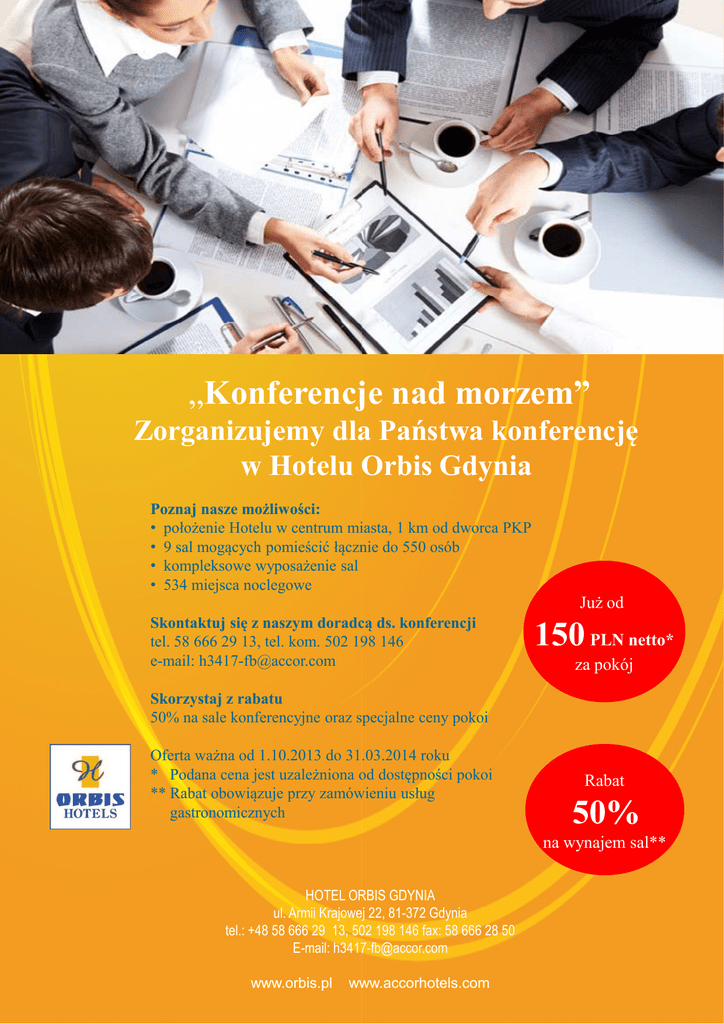 „Konferencje Konferencje nad morzem” Zorganizujemy dla Państwa Pa konferencję w Hotelu Orbis Gdynia Poznaj nasze możliwości: • położenie enie Hotelu w centrum miasta, 1 km od dworca PKP • 9 sal mogących pomieścić ś ć łącznie ącznie do 550 osób • kompleksowe wyposażenie sal • 534 miejsca noclegowe Już od Skontaktuj się z naszym doradcą ds. konferencji tel. 58 666 29 13, tel. kom. 502 198 146 e-mail: [email protected] 150 PLN netto* za pokój Skorzystaj z rabatu 50% na sale konferencyjne oraz specjalne ceny pokoi Oferta ważna na od 1.10.2013 do 31.03.2014 roku * Podana cena jest uzależniona żniona od dostępności dost pokoi ** Rabat obowiązuje zuje przy zamówieniu usług gastronomicznych Rabat 50% na wynajem sal** HOTEL ORBIS GDYNIA ul. Armii Krajowej 22, 81-372 81 Gdynia tel.: +48 58 666 29 13, 502 198 146 fax: 58 666 28 50 E-mail: mail: [email protected] h3417 www.orbis.pl www.accorhotels.com