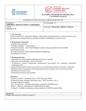 KATEDRA TECHNIK WYTWARZANIA I AUTOMATYZACJI INSTRUKCJA DO ĆWICZEŃ LABORATORYJNYCH Przedmiot : OBRÓBKA SKRAWANIEM I NARZĘDZIA Temat: Nr ćwiczenia : 3 Kierunek: Mechanika i Budowa Maszyn Toczenie cz. II 1. Cel ćwiczenia Celem ćwiczenia jest zapoznanie studenta z parametrami technologicznymi w procesie toczenia oraz ich wpływem na chropowatość powierzchni przedmiotu obrabianego oraz postać wióra. 2. Wyposażenie stanowiska - Tokarka konwencjonalna - Przedmiot obrabiany – wałek stalowy - Narzędzie tokarskie – nóż tokarski składany z płytka skrawającą dedykowana do obróbki wykończeniowej stali - przyrząd do pomiaru chropowatości przedmiotu obrabianego - Instrukcja do ćwiczenia 3. Przebieg ćwiczenia - Zapoznanie się z parametrami technologicznymi procesu toczenia - Zapoznanie się z przekrojem warstwy skrawanej - Wyznaczenie wartości teoretycznej chropowatości powierzchni dla wybranych parametrów technologicznych - Przeprowadzenie prób toczenia i porównanie rzeczywistej chropowatości powierzchni z obliczoną, - Określenie wpływu parametrów technologicznych procesu na postać wióra w procesie toczenia, - Określenie roli łamacza wióra - Omówienie procesu toczenia gwintów Literatura: - Dudik K., Gorski E. „Poradnik tokarza” WNT Warszawa 2000 r. - Poradnik inżyniera „Obróbka skrawaniem tom I” WNT Warszawa 1991 r. - Poradnik Sandvik Coromant - Dul – Korzyńska B. „ Obróbka skrawaniem i narzędzia” OWPR Rzeszów - Burek J. „Maszyny technologiczne” OWPR Rzeszów 2000 r. - Cichosz P. „Techniki wytwarzania obróbka ubytkowa” OWPW Wrocław 2002 r. Opracował: Uwagi: Załącznikiem jest instrukcja szczegółowa 1. Parametry technologiczne toczenia W procesie toczenia przedmiot obrabiany realizuje ruch obrotowy natomiast narzędzie dosunięte do przedmiotu na określona odległość realizuje ruch posuwowy. Parametry technologiczne, to parametry opisujące proces obróbki, występujące w nim ruchy oraz wielkości charakteryzujące ustawienie narzędzia bądź przedmiotu obrabianego. Niektóre parametry technologiczne są jednocześnie wielkościami nastawczymi obrabiarki. Na rys. 1. Przedstawiono schemat procesu toczenia z zaznaczonymi parametrami technologicznymi. Rys. 1. Schemat procesu toczenia Parametry technologiczne toczenia: n [obr/min] prędkość obrotowa wrzeciona ap [mm] głębokość skrawania d [mm] średnica przedmiotu obrabianego ft [mm/min] posuw minutowy narzędzia fo [mm/obr] posuw na obrót narzędzia vc [m/min] prędkość skrawania Zależności pomiędzy parametrami technologicznymi są następujące: vc d n m 1000 min , mm f t f o n min 2. Przekrój warstwy skrawanej Proces skrawania charakteryzowany jest również poprzez parametry geometryczne takie jak grubość warstwy skrawanej h oraz szerokość warstwy skrawanej b. Parametry te opisują wymiary i kształt warstwy skrawanej. Elementy geometryczne warstwy skrawanej określane są w przekroju charakterystycznym warstwy skrawanej, tzn. w przekroju prostopadłym do wektora prędkości skrawania (rys. 2). Rys. 2. Przekrój warstwy skrawanej Pole przekroju warstwy skrawanej równe jest iloczynowi głębokości skrawania ap oraz posuwu f lub iloczynowi grubości h i szerokości b warstwy skrawanej. Pole przekroju warstwy skrawanej w procesie toczenia jest stałe. Kształt pola przekroju zależy od wartości kąta przystawienia κr. 3. Chropowatość powierzchni w procesie toczenia. Chropowatość powierzchni obrobionej po toczeniu można wyznaczyć teoretycznie, rozpatrując profil powierzchni kształtowanej przez ostrze o określonym promieniu zaokrąglenia naroża przemieszczającego się o wartość posuwu f przypadającego na jeden obrót przedmiotu obrabianego. Na rys. 3 przedstawiono sposób wyznaczenia maksymalnej wysokości profilu chropowatości oraz wpływ posuwu oraz promienia zaokrąglenia naroża na chropowatość powierzchni w procesie toczenia oraz Parametr Rt chropowatości wyraża się wzorem: Rt r r2 f2 mm 4 Lub po uproszczeniu zależność ta przedstawia się następująco: f2 Rt 1000 m 8 r Rys. 3. Chropowatość powierzchni w procesie toczenia Rzeczywista wartość chropowatości powierzchni obrobionej po toczeniu jest jednak uzależniona od wielu czynników, głównie od właściwości plastycznych materiału obrabianego, drgań układu OUPN, zużycia narzędzia itp. Ich wpływ na chropowatość powierzchni określa się doświadczalnie. 4. Zastosowanie łamacza wióra w procesie toczenia. Proces toczenia najczęściej realizowany jest w sposób ciągły, tzn. ostrze zagłębia się w materiał obrabiany i skrawa bez przerw. W związku z tym bardzo często powstają podczas obróbki wióra, które mają niekorzystny kształt i stwarzają zagrożenie dla operatora i obrabiarki, nawijają się na narzędzie i przedmiot obrabiany oraz są trudne do usuwania ze strefy skrawania i kłopotliwe w transporcie. Do najbardziej niekorzystnych należą wióry wstęgowe i śrubowe, ciągłe lub splątane. W związku z tym, dąży się do tego, aby w procesie toczenia występowało zjawisko łamania lub zwijania wiórów, co znacznie ułatwi ich transport i składowanie oraz zapewni bezpieczeństwo pracy. Na rys. 4 przedstawiono konstrukcje nakładanych łamaczy wiórów. Rys. 4. Nakładane łamacze wiórów: a) stałe, b) nastawne. W przypadku płytek skrawających, łamacze wiórów są wykonywane na powierzchni natarcia płytki. Łamacze te, widoczne na rys. 5, kształtowane są w procesie prasowania płytki i są z nią zintegrowane. Rys. 5. Ukształtowanie powierzchni natarcia mające na celu zwijanie lub łamanie wióra. Łamacze wiórów projektowane są dla obróbki określonego rodzaju materiału (np. inne będą łamacze wiórów do obróbki stali węglowych a inne do obróbki stali nierdzewnych) oraz do pracy w określonym zakresie parametrów obróbki. Im zakres ten jest większy tym ostrze jest bardziej uniwersalne. Na rys. 6. Przedstawiono prz