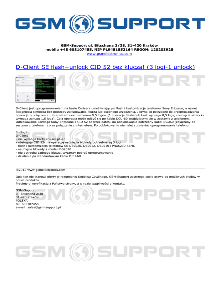 GSM-Support ul. Bitschana 2/38, 31-420 Kraków mobile +48 608107455, NIP PL9451852164 REGON: 120203925 www.gsmelectronics.com D-Client SE flash+unlock CID 52 bez klucza! (3 logi-1 unlock) D-Client jest oprogramowaniem na bazie Cruisera umożliwiającym flash i kustomizacje telefonów Sony Ericsson, a nawet ściągniecia simlocka bez potrzeby zakupowania klucza lub osobnego urządzenia. Jedyna co potrzebne do przeprowadzenia operacji to połączenie z internetem oraz minimum 0,5 logów (1 operacja flasha lub kust.wymaga 0,5 loga, usunięcie simlocka wymaga zakupu 1,5 loga). Cała operacja może odbyć się po kablu DCU-60 znajdującym sie w zestawie z telefonem. Odblokowanie każdego Sony Ericssona z CID 52 poprzez patch. Do odblokowania potrzebny kabel DCU60 (załączony do zestawu z telefonem) oraz połączenie z internetem. Po odblokowaniu nie należy zmieniać oprogramowania telefonu! Funkcje: D-Client - nie wymaga karty cruiser plus ! - obsługuje CID 52- na operację usunięcia blokady potrzebne są 3 logi - flash i kustomizacja telefonów SE DB2020, DB2012, DB2010 i PNX5230 SEMC - usunięcie blokady z modeli DB2020 - nie potrzeba żadnego klucza, wytarczy pobrać oprogramowanie - działanie po standardowym kablu DCU-60 ©2012 www.gsmelectronics.com Opis ten nie stanowi oferty w rozumieniu Kodeksu Cywilnego. GSM-Support zastrzega sobie prawo do możliwych błędów w opisie produktu. Prosimy o weryfikację z Państwa strony, a w razie wątpliwości o kontakt. GSM-Support ul. Bitschana 2/38 31-420 Kraków POLSKA tel. 608107455 e-mail: [email protected] Powered by TCPDF (www.tcpdf.org)