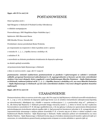 Sygn. akt II Ca 1227/16 POSTANOWIENIE Dnia 6 grudnia 2016 r. Sąd Okręgowy w Kielcach II Wydział Cywilny Odwoławczy w składzie następującym: Przewodniczący: SSO Magdalena Bajor-Nadolska (spr.) Sędziowie: SSO Sławomir Buras SSR Monika Wrona- Zawada del. Protokolant: starszy protokolant Beata Wodecka po rozpoznaniu na rozprawie w dniu 6 grudnia 2016 r. sprawy z wniosku H. (...), (...) Spółka Jawna z siedzibą w K. z udziałem P. B. o zezwolenie na złożenie przedmiotu świadczenia do depozytu sądowego na skutek apelacji uczestnika od postanowienia Sądu Rejonowego w Kielcach z dnia 10 czerwca 2016 r. sygn. akt I C 1249/16 postanawia: zmienić zaskarżone postanowienie w punkcie I (pierwszym) w całości i wniosek oddalić, przyznać kuratorowi adwokatowi A. B. wynagrodzenie w kwocie 147,60 (sto czterdzieści siedem i 60/100) złotych, które wypłacić z sum budżetowym Skarbu Państwa – Sądu Rejonowego w Kielcach, nakazać pobrać od H. (...), (...) Spółka Jawna z siedzibą w K. na rzecz Skarbu Państwa – Sądu Rejonowego w Kielcach 147,60 (sto czterdzieści siedem i 60/100) złotych tytułem kosztów sądowych. Sygn. akt II Ca 1227/16 UZASADNIENIE Postanowieniem z dnia 10 czerwca 2016 roku, sygn. akt I Ns 1249/16, Sąd Rejonowy w Kielcach zezwolił wnioskodawcy H. (...) sp. j. w K. na złożenie do depozytu sądowego kwoty 0,01 zł, tytułem wierzytelności zabezpieczonej hipoteką na nieruchomości, składającej się z działki o numerze ewidencyjnym (...), o powierzchni 2655 m2 , położonej w K., dla której Sąd Rejonowy w Kielcach prowadzi księgę wieczystą numer (...), która to kwota ma być wypłacona bezwarunkowo uczestnikowi P. B. lub jego spadkobiercom, o ile się zgłoszą i wykażą swe uprawnienia dokumentami potwierdzającymi stwierdzenie nabycia spadku (pkt 1). Sąd przyznał też kuratorowi adwokat A. B. wynagrodzenie za reprezentowanie nieznanego z miejsca pobytu uczestnika P. B. w kwocie 295,20 zł, które w całości wypłacił z sum budżetowych Skarbu Państwa - Sądu Rejonowego w Kielcach. Nadto nakazano pobrać od wnioskodawcy na rzecz Skarbu Państwa - Sądu Rejonowego w Kielcach kwotę 295,20 zł tytułem nieuiszczonych kosztów sądowych (pkt 3) i orzeczono, że wnioskodawca ponosi koszty postępowania związane ze swoim udziałem w sprawie (pkt 4). W uzasadnieniu Sąd Rejonowy wskazał, że wnioskodawca domagał się wydania zezwolenia na złożenie do depozytu sądowego kwoty 0,01 zł tytułem wierzytelności zabezpieczonej hipoteką na nieruchomości składającej się z działki o numerze ewidencyjnym (...), o powierzchni 2655 m2 , położonej w K., dla której Sąd Rejonowy w Kielcach prowadzi księgę wieczystą numer (...), która to kwota ma być wypłacona bezwarunkowo uczestnikowi lub jego spadkobiercom, o ile się zgłoszą i wykażą swe uprawnienia dokumentami potwierdzającymi stwierdzenie nabycia spadku, zrzekając się jednocześnie uprawnienia do odebrania tej kwoty z powrotem. Wnioskodawca podniósł, że jest użytkownikiem wieczystym tej nieruchomości oraz właścicielem posadowionego na niej budynku. W dziale IV ww. księgi wieczystej w komentarzu do migracji znajduje się następujący wpis: „Pod nr bieżącym wpisu(...)zapisano: pożyczka w sumie (...) grosza rubli z odsetkami i kaucją P. B.”. Pożyczka ta jest wpisana w dziale IV nieruchomości K. H. nr 657 nr 4 I do nr 4 (hipoteka łączna). Z wpisem powyższym związany jest wpis w dziale III księgi wieczystej numer (...), gdzie pod pozycją 2. zamieszczony jest wpis „ograniczenie prawa własności do sumy 1 tysiąca rubli z umowy z dnia 4 maja 1912 roku nr 10” przeniesiony spod nr 3. działu III wykazu Księgi Wieczystej nieruchomości. Wnioskodawca podnosił, że nie zna uczestnika ani jego spadkobierców i nie jest w stanie ustalić ich miejsca pobytu, zachodzą zatem przesłanki do złożenia kwoty świadczenia do depozytu sądowego. Następnie Sąd powołał się na art. 6931 k.p.c., stwierdzając, że w niniejszym postępowaniu ocenie podlega jedynie to, czy według przytoczonych okoliczności złożenie do depozytu świadczenia jest prawnie uzasadnione. Dalej wskazano na art. 99 ust. 1 ustawy z dnia 6 lipca 1982 roku o księgach wieczystych i hipotece, który wymaga spełnienia pięciu przesłanek, aby właściciel nieruchomości skutecznie złożył kwotę do depozytu sądowego: zabezpieczona wierzytelność istnieje i jest wymagalna; wierzyciel dopuszcza się zwłoki lub zaspokojenie go napotyka trudności; właściciel nieruchomości uzyskał zezwolenie sądu na podstawie art. 6932 § 1 k.p.c.; właściciel zrzekł się uprawnienia do odebrania złożonej kwoty z powrotem; właściciel wpłacił do depozytu sądowego kwotę równą sumie wymagalnej wierzytelności. Według Sądu I instancji wszystkie te przesłanki zostały spełnione w niniejszej sprawie. Dodatkowo wyjaśniono, że zachodziła konieczność ustanowienia kuratora dla nieznanego z miejsca pobytu uczestnika, co obligowało Sąd do przyznania na jego rzecz wynagrodzenia w kwocie 295,20 zł (w tym podatek VAT), które na obecnym etapie postępowania zostało tymczasowo z sum budżetowych Skarbu Państwa - Sądu Rejonowego w Kielcach. Wysokość przysługującego kuratorowi wynagrodzenia za reprezentowanie strony w postępowaniu cywilnym została ustalona na podstawie §14 ust. 1 pkt 3 rozporządzenia Ministra Sprawiedliwości z dnia 22 października 2015 roku w sprawie ponoszenia przez Skarb Państwa kosztów nieopłaconej pomocy prawnej udzielonej przez adwokata z urzędu. O kosztach sądowych orzeczono w myśl art. 113 ust. 1 ustawy z dnia 28 lipca 2005 roku o kosztach sądowych w sprawach cywilnych, a w przedmiocie kosztów postępowania zastosowano zasadę z art. 520 § 1 k.p.c. (k.14-16) Apelację od powyższego postanowienia wywiódł uczestnik reprezentowany przez kuratora, zaskarżając je w całości. Zarzucono niedokonanie wystarczających ustaleń faktycznych w sprawie