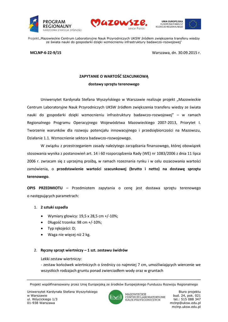 Projekt „Mazowieckie Centrum Laboratoryjne Nauk Przyrodniczych UKSW źródłem zwiększenia transferu wiedzy ze świata nauki do gospodarki dzięki wzmocnieniu infrastruktury badawczo-rozwojowej” MCLNP-6-22-9/15 Warszawa, dn. 30.09.2015 r. ZAPYTANIE O WARTOŚĆ SZACUNKOWĄ dostawy sprzętu terenowego Uniwersytet Kardynała Stefana Wyszyńskiego w Warszawie realizuje projekt „Mazowieckie Centrum Laboratoryjne Nauk Przyrodniczych UKSW źródłem zwiększenia transferu wiedzy ze świata nauki do gospodarki dzięki wzmocnieniu infrastruktury badawczo-rozwojowej” – w ramach Regionalnego Programu Operacyjnego Województwa Mazowieckiego 2007-2013, Priorytet I. Tworzenie warunków dla rozwoju potencjału innowacyjnego i przedsiębiorczości na Mazowszu, Działanie 1.1. Wzmocnienie sektora badawczo-rozwojowego. W związku z przestrzeganiem zasady należytego zarządzania finansowego, której obowiązek stosowania wynika z postanowień art. 14 i 60 rozporządzenia Rady (WE) nr 1083/2006 z dnia 11 lipca 2006 r. zwracam się z uprzejmą prośbą, w ramach rozeznania rynku i w celu oszacowania wartości zamówienia, o przedstawienie wartości szacunkowej (brutto i netto) na dostawę sprzętu terenowego. OPIS PRZEDMIOTU – Przedmiotem zapytania o cenę jest dostawa sprzętu terenowego o następujących parametrach: 1. 2 sztuki szpadla Wymiary głowicy: 19,5 x 28,5 cm +/-10%; Długość trzonka: 98 cm +/-10%; Typ rękojeści: D; Waga nie więcej niż 2 kg. 2. Ręczny sprzęt wiertniczy – 1 szt. zestawu świdrów Lekki zestaw wiertniczy: - zestaw końcówek wiertniczych o średnicy co najmniej 7 cm, umożliwiających wiercenie we wszystkich rodzajach gruntu ponad zwierciadłem wody oraz w gruntach Projekt współfinansowany przez Unię Europejską ze środków Europejskiego Funduszu Rozwoju Regionalnego Uniwersytet Kardynała Stefana Wyszyńskiego w Warszawie ul. Wóycickiego 1/3 01-938 Warszawa Biuro projektu bud. 24, pok. 021 tel.: 515 088 347 [email protected] mclnp.uksw.edu.pl Projekt „Mazowieckie Centrum Laboratoryjne Nauk Przyrodniczych UKSW źródłem zwiększenia transferu wiedzy ze świata nauki do gospodarki dzięki wzmocnieniu infrastruktury badawczo-rozwojowej” - zwięzłych (miękko plastycznych) pod zwierciadłem wód (w tym świder okienkowy, świder spiralny, świder rurowy), - zestaw żerdzi umożliwiający wiercenie do głębokości 5 m, łączenie żerdzi bagnetowe, - zestaw pokręteł. 3. 1 sztuka laski glebowej Wykonana ze stali nierdzewnej; Ze stopką; Uchwyty zakończone zaślepkami; Waga: 1,5 kg +/-5% Długość: 90 cm +/-5% 4. 2 sztuki świstawek hydrogeologicznych Wykonana ze stali nierdzewnej; Średnica: 20 mm +/-5%; Długość: 235 mm +/- 5%; Masa: 220g +/-5%. 5. 1 zestaw do pomiarów budowlanych łaty miernicze do niwelowania -2 szt. tyczki miernicze – 6 szt. węgielnica zwierciadłowa – 4 szt. Szpilki stalowe w tym jedna specjalnie znaczona dla tyczącego; taśma stalowa dł. 50 m miernicza – 1 szt. taśma stalowa dł. 20 m miernicza – 2 szt. taśma miernicza parciana dł. 20 m – 2 szt. kółek do nakładania szpilek – 2 szt. młotek mechaniczno-elektroniczny do badania wytrzymałości betonu – 1 szt. aparat cyfrowy – 1 szt. 1 szt. kamery oraz urządzeń towarzyszących takich jak nadajnik i odbiornik: o sterowane bezprzewodowo, o obraz kolorowy, o do zapisu w pamięci i możliwością pobrania danych na komputer, kartę SD, itp., o z możliwością rejestracji ciągłej i wykonywaniem pojedynczych zdjęć, o zasięg działania co najmniej 50 metrów, o sterowanie powinno być możliwe z poziomu laptopa. Projekt współfinansowany przez Unię Europejską ze środków Europejskiego Funduszu Rozwoju Regionalnego Uniwersytet Kardynała Stefana Wyszyńskiego w Warszawie ul. Wóycickiego 1/3 01-938 Warszawa Biuro projektu bud. 24, pok. 021 tel.: 515 088 347 [email protected] mclnp.uksw.edu.pl Projekt „Mazowieckie Centrum Laboratoryjne Nauk Przyrodniczych UKSW źródłem zwiększenia transferu wiedzy ze świata nauki do gospodarki dzięki wzmocnieniu infrastruktury badawczo-rozwojowej” 1 szt. teodolit elektroniczny ze statywem, wymagane parametry techniczne teodolitu co najmniej: o powiększenie: 30x, o pole widzenia: 1°30', o rozdzielczość: 3'' ”, o ogniskowanie od: 1 m, o dokładność 5''. 1 szt. niwelator optyczny, wymagane parametry co najmniej: o dokładność min.: 1,5 mm/km, o powiększenie lunety min.: 28x. 6. Sprzęt do montażu aparatury na dużej wysokości Butla na hel i reduktor o poj. co najmniej 5 l; Linki mocujące o udźwigu co najmniej 60 kg i masie własnej nieprzekraczającej 30 dkg, o długości łącznej min. 500 m; (3 pakiety) 15 balonów o pojemności co najmniej 1 metra sześciennego oraz 50 balonów małych; Dron z kamerą: o z podglądem na żywo, o ze zdolnością do uniesienia dodatkowego urządzenia o wadze 4 kilogramów, o niewymagający okablowania, sterowany zdalnie co najmniej do 50 m, o pozwalający na pracę w warunkach zimowych. 7. 1 sztuka lokalizatora GPS do badań terenowych Wyświetlanie danych w pionie; Waga nie większa niż 280g; Typ baterii: 2 baterie AA; Czas działania baterii: min. 18 godz.; Klasa wodoszczelności: co najmniej IPX7; Dokładność GPS: min. 10 m, dokładność DGPS: min. 5 m; Posiada elektroniczny kompas, wysokościomierz, wejście MCX, wejście mini USB, moduł ANT+; Bezpieczna wymiana danych - czytnik kart pamięci, pamięć wewnętrzna: min. 3,5 GB; Mapa bazowa - Fabrycznie załadowane mapy; Zgodnośc z CustomMaps; Wybór układu odniesienia, automatyczne wyznaczanie trasy. Projekt współfinansowany przez Unię Europejską ze środków Europejskiego Funduszu Rozwoju Regionalnego Uniwersytet Kardynała Stefana Wyszyńskiego w Warszawie ul. Wóycickiego 1/3 01-938 Warszawa Biuro projektu bud. 24, pok. 021 tel.: 515 088 347 [email protected] mclnp.uksw.edu.pl Projekt „Mazowieckie Centrum Laboratoryjne Nauk Przyrodniczych UKSW źródłem zwiększenia transferu wiedzy ze ś