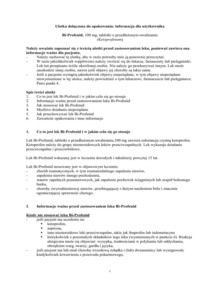 Ulotka dołączona do opakowania: informacja dla użytkownika Bi-Profenid, 100 mg, tabletki o przedłużonym uwalnianiu (Ketoprofenum) Należy uważnie zapoznać się z treścią ulotki przed zastosowaniem leku, ponieważ zawiera ona informacje ważne dla pacjenta. Należy zachować tę ulotkę, aby w razie potrzeby móc ją ponownie przeczytać. W razie jakichkolwiek wątpliwości należy zwrócić się do lekarza, farmaceuty lub pielęgniarki. Lek ten przepisano ściśle określonej osobie. Nie należy go przekazywać innym. Lek może zaszkodzić innej osobie, nawet jeśli objawy jej choroby są takie same. Jeśli u pacjenta wystąpią jakiekolwiek objawy niepożądane, w tym objawy niepożądane niewymienione w tej ulotce, należy powiedzieć o tym lekarzowi, farmaceucie lub pielęgniarce. Patrz punkt 4. Spis treści ulotki 1. Co to jest lek Bi-Profenid i w jakim celu się go stosuje 2. Informacje ważne przed zastosowaniem leku Bi-Profenid 3. Jak stosować lek Bi-Profenid 4. Możliwe działania niepożądane 5. Jak przechowywać lek Bi-Profenid 6. Zawartość opakowania i inne informacje 1. Co to jest lek Bi-Profenid i w jakim celu się go stosuje Lek Bi-Profenid, tabletki o przedłużonym uwalnianiu,100 mg zawiera substancję czynną ketoprofen. Ketoprofen należy do grupy niesteroidowych leków przeciwzapalnych. Lek wykazuje działanie przeciwzapalne i przeciwbólowe. Lek Bi-Profenid wskazany jest w leczeniu dorosłych i młodzieży powyżej 15 lat. Lek Bi-Profenid stosowany jest w objawowym leczeniu: chorób reumatycznych, w tym reumatoidalnego zapalenia stawów, zapalenia stawów innego pochodzenia, stanów zapalnych pozastawowych, jak zapalenie pochewek ścięgnistych lub zespół bolesnego barku, choroby zwyrodnieniowej stawów, przebiegającej z dużym nasileniem bólu i znacznie ograniczającej sprawność chorego. 2. Informacje ważne przed zastosowaniem leku Bi-Profenid Kiedy nie stosować leku Bi-Profenid jeśli pacjent ma uczulenie na: ketoprofen, aspirynę, inne niesteroidowe leki przeciwzapalne, takie jak ibuprofen lub indometacyna którykolwiek z pozostałych składników tego leku (wymienionych w punkcie 6). Reakcja alergiczna może się objawiać: wysypką, trudnościami w połykaniu lub oddychaniu, obrzękiem warg, twarzy, gardła i języka, jeśli pacjent ma lub miał chorobę wrzodową żołądka i (lub) dwunastnicy lub występowały kiedykolwiek krwawienia z przewodu pokarmowego, 1 - jeśli pacjent ma większą niż zwykle skłonność do powstawania siniaków i krwawienia, które jest długotrwałe (skaza krwotoczna), jeśli pacjent ma ciężką niewydolność nerek lub wątroby, jeśli pacjent ma ciężką niewydolność serca, jeśli pacjentka jest w trzecim trymestrze ciąży, jeśli pacjent ma rozpoznaną nadwrażliwość lub nietolerancję glutenu (tabletki zawierają w składzie skrobię pszeniczną), jeśli pacjent miał reakcje nadwrażliwości takie jak: skurcz oskrzeli, napady astmy, nieżyt nosa, pokrzywkę lub inne reakcje typu alergicznego na ketoprofen, kwas acetylosalicylowy lub inne NLPZ. Nie wolno przyjmować tego leku, jeśli u pacjenta występuje którykolwiek z powyższych stanów. W razie wątpliwości, należy skontaktować się z lekarzem lub farmaceutą przed rozpoczęciem stosowania leku Bi-Profenid. Ostrzeżenia i środki ostrożności Przed rozpoczęciem stosowania leku Bi-Profeind należy zwrócić się do lekarza lub farmaceuty, jeśli: pacjent ma astmę. pacjent ma chorobę Crohna w wywiadzie, ze względu na możliwość nasilenia choroby. pacjent ma chorobę skóry, stawów lub nerek zwaną toczeń rumieniowaty układowy. pacjent jest w wieku 65 lat lub starszy. pacjentka planuje ciążę lub ma problemy z zajściem w ciążę. Lek Bi-Profenid, tak jak inne leki NLPZ może utrudniać zajście w ciążę. u pacjenta występują choroby serca (niewydolność serca), pacjent miał udar lub podejrzewa, że występuje u niego podwyższone ryzyko tych zaburzeń (np. podwyższone ciśnienie krwi, cukrzyca, zwiększone stężenie cholesterolu lub palenie tytoniu). Pacjentów z chorobami serca, którzy zgłaszali obrzęki i zatrzymywanie płynów lekarz będzie odpowiednio kontrolować i dostosować leczenie indywidualnie. Stosowanie ketoprofenu, zwłaszcza w dużych dawkach, może być związane z wyższym ryzykiem wystąpienia ciężkiej toksyczności ze strony przewodu pokarmowego, w porównaniu do pozostałych NLPZ. Przyjmowanie takich leków jak Bi-Profenid może być związane z niewielkim zwiększeniem ryzyka ataku serca (zawał serca) lub udaru. Ryzyko to zwiększa długotrwałe przyjmowanie dużych dawek leku. Nie należy stosować większych dawek i dłuższego czasu leczenia niż zalecane. Lek, tak jak inne leki NLPZ może utrudniać zajście w ciążę, jeżeli pacjentka planuje zajście w ciążę lub ma problemy z zajściem w ciążę powinna poinformować o tym lekarza. Przyjmowanie takich leków, jak Bi-Profenid może być związane z niewielkim zwiększeniem ryzyka migotania przedsionków. W razie wątpliwości dotyczących występowania powyższych stanów, należy skontaktować się z lekarzem lub farmaceutą przed rozpoczęciem stosowania leku Bi-Profenid. Lekarz może wymagać ścisłego monitorowania pacjenta lub zalecić krótszy czas trwania leczenia, jeśli: pacjent ma zwiększone stężenie cholesterolu lub tłuszczów we krwi pacjent choruje na cukrzycę pacjent pali papierosy pacjent ma choroby wątroby (zaburzenia czynności wątroby) lub nerek (przewlekłe zaburzenia czynności nerek) oraz zaburzeń gospodarki wodnej (np. odwodnienie w wyniku stosowania leków moczopędnych lub po przebytym ostatnio zabiegu chirurgicznym). Stosowanie leku Bi-Profenid może 2 zmniejszyć przepływ nerkowy prowadząc do wystąpienia zaburzeń czynności nerek, zwłaszcza u pacjentów w podeszłym wieku. Na początku leczenia u tych pacjentów lekarz będzie dokładnie monitorować czynność nerek. U pacjentów z zaburzeniami czy
