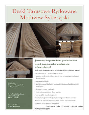 Deski Tarasowe Ryflowane Modrzew Syberyjski Jesteśmy bezpośrednim producentem desek tarasowych z modrzewia syberyjskiego! Dlaczego warto wybrać modrzew syberyjski na taras? • trwały, mocny i wytrzymały surowiec • deski z modrzewia syberyjskiego nie wymagają dodatkowej konserwacji • gwarancja jakości BIOIKOS Drewno i Domy z bali syebryjskich • profesjonalna i fachowa wiedza i obsługa na każdym etapie współpracy • krótkie terminy realizacji • duże, nieograniczone ilości towaru ! E-mail: [email protected] www.bioikos.pl +48 512 121 599 ! ! ! Sycowska 31 02-266 Warszawa • europejskie standardy jakości • certyfikaty potwierdzające jakość i pochodzenia towaru • towar do odbioru z magazynu w Polsce lub dowieziony do miejsca docelowego na świecie Dostępne wymiary: 27mm x 142mm x 4000m Film produkcyjny ! ! ! ! ! ! ! ! WWW.BIOIKOS.PL [email protected] +48 512 121 599 ! ! ! ! ! ! ! ! ! !