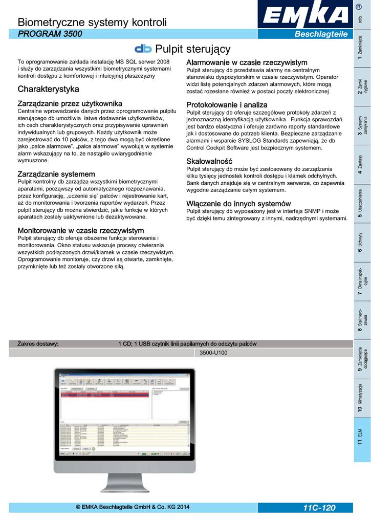 ® Zarządzanie przez użytkownika Protokołowanie i analiza Centralne wprowadzanie danych przez oprogramowanie pulpitu sterującego db umożliwia łatwe dodawanie użytkowników, ich cech charakterystycznych oraz przypisywanie uprawnień indywidualnych lub grupowych. Każdy użytkownik może zarejestrować do 10 palców, z tego dwa mogą być określone jako „palce alarmowe”. „palce alarmowe” wywołują w systemie alarm wskazujący na to, że nastąpiło uwiarygodnienie wymuszone. Zarządzanie systemem Pulpit kontrolny db zarządza wszystkimi biometrycznymi aparatami, począwszy od automatycznego rozpoznawania, przez konfigurację, „uczenie się” palców i rejestrowanie kart, aż do monitorowania i tworzenia raportów wydarzeń. Przez pulpit sterujący db można stwierdzić, jakie funkcje w których aparatach zostały uaktywnione lub dezaktywowane. Pulpit sterujący db oferuje szczegółowe protokoły zdarzeń z jednoznaczną identyfikacją użytkownika. Funkcja sprawozdań jest bardzo elastyczna i oferuje zarówno raporty standardowe jak i dostosowane do potrzeb klienta. Bezpieczne zarządzanie alarmami i wsparcie SYSLOG Standards zapewniają, że db Control Cockpit Software jest bezpiecznym systemem. Skalowalność Pulpit sterujący db może być zastosowany do zarządzania kilku tysięcy jednostek kontroli dostępu i klamek odchylnych. Bank danych znajduje się w centralnym serwerze, co zapewnia wygodne zarządzanie całym systemem. Włączenie do innych systemów Pulpit sterujący db wyposażony jest w interfejs SNMP i może być dzięki temu zintegrowany z innymi, nadrzędnymi systemami. 6 Uchwyty Monitorowanie w czasie rzeczywistym ryglowe Charakterystyka Pulpit sterujący db przedstawia alarmy na centralnym stanowisku dyspozytorskim w czasie rzeczywistym. Operator widzi listę potencjalnych zdarzeń alarmowych, które mogą zostać rozesłane również w postaci poczty elektronicznej 2 Zamki Alarmowanie w czasie rzeczywistym zamykania To oprogramowanie zakłada instalację MS SQL serwer 2008 i służy do zarządzania wszystkimi biometrycznymi systemami kontroli dostępu z komfortowej i intuicyjnej płaszczyzny 3 Systemy Pulpit sterujący 4 Zawiasy Beschlagteile 5 Uszczelnienia PROGRAM 3500 1 Zamknięcia Info Biometryczne systemy kontroli zewna 8 Stal nierd- cyjne 7 Okna inspek- Pulpit sterujący db oferuje obszerne funkcje sterowania i monitorowania. Okno statusu wskazuje procesy otwierania wszystkich podłączonych drzwi/klamek w czasie rzeczywistym. Oprogramowanie monitoruje, czy drzwi są otwarte, zamknięte, przymknięte lub też zostały otworzone siłą. 9 Zamknięcia 1 CD; 1 USB czytnik linii papilarnych do odczytu palców 10 Klimatyzacja dociągające 3500-U100 11 ELM Zakres dostawy: © EMKA Beschlagteile GmbH & Co. KG 2014 11C-120