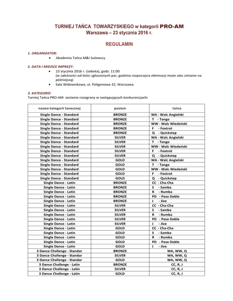 TURNIEJ TAŃCA TOWARZYSKIEGO w kategorii PRO-AM Warszawa – 23 stycznia 2016 r. REGULAMIN 1. ORGANIZATOR: • Akademia Tańca M&I Sulewscy 2. DATA I MIEJSCE IMPREZY: • 23 stycznia 2016 r. (sobota), godz. 11:00 (w zależności od ilości zgłoszonych par, godzina rozpoczęcia eliminacji może ulec zmianie na późniejszą) • Sala Widowiskowa, ul. Poligonowa 32, Warszawa 3. KATEGORIE: Turniej Tańca PRO-AM zostanie rozegrany w następujących konkurencjach: nazwa kategorii tanecznej poziom Single Dance - Standard Single Dance - Standard Single Dance - Standard Single Dance - Standard Single Dance - Standard Single Dance - Standard Single Dance - Standard Single Dance - Standard Single Dance - Standard Single Dance - Standard Single Dance - Standard Single Dance - Standard Single Dance - Standard Single Dance - Standard Single Dance - Standard Single Dance - Latin Single Dance - Latin Single Dance - Latin Single Dance - Latin Single Dance - Latin Single Dance - Latin Single Dance - Latin Single Dance - Latin Single Dance - Latin Single Dance - Latin Single Dance - Latin Single Dance - Latin Single Dance - Latin Single Dance - Latin Single Dance - Latin 3 Dance Challenge - Standar 3 Dance Challenge - Standar 3 Dance Challenge - Standar 3 Dance Challenge - Latin 3 Dance Challenge - Latin 3 Dance Challenge - Latin BRONZE BRONZE BRONZE BRONZE BRONZE SILVER SILVER SILVER SILVER SILVER GOLD GOLD GOLD GOLD GOLD BRONZE BRONZE BRONZE BRONZE BRONZE SILVER SILVER SILVER SILVER SILVER GOLD GOLD GOLD GOLD GOLD BRONZE SILVER GOLD BRONZE SILVER GOLD tańce WA - Walc Angielski T - Tango WW - Walc Wiedeński F - Foxtrot Q - Quickstep WA - Walc Angielski T - Tango WW - Walc Wiedeński F - Foxtrot Q - Quickstep WA - Walc Angielski T - Tango WW - Walc Wiedeński F - Foxtrot Q - Quickstep CC - Cha-Cha S - Samba R - Rumba PD - Paso Doble J - Jive CC - Cha-Cha S - Samba R - Rumba PD - Paso Doble J - Jive CC - Cha-Cha S - Samba R - Rumba PD - Paso Doble J - Jive WA, WW, Q WA, WW, Q WA, WW, Q CC, R, J CC, R, J CC, R, J 1. 2. 3. 4. W Turnieju PRO-AM nie ma ograniczeń wiekowych zarówno dla tancerza Pro jak i AMATORA. O przynależności do danego poziomu zaawansowania tancerz AMATORA decyduje instruktor. Dozwolone jest zatańczenie z jednym tancerzem AMATOREM dowolnej liczby tańców na dowolnym poziomie. Nie ma ograniczeń repertuaru. 4. WARUNKI UCZESTNICTWA: 1. W Turnieju PRO-AM w tańcu towarzyskim mogą startować pary w którym jeden z tancerzy jest PRO – tancerzem turniejowym zajmującym się tańcem amatorsko lub profesjonalnie, lub będący instruktorem. Tancerz PRO nie musi posiadać licencji jakiejkolwiek federacji tanecznej. oraz drugi będący AMATOREM (AM) – czyli osobą zajmująca się tańcem rekreacyjnie, która nie jest instruktorem tańca. 2. Zgłoszenie swojego udziału w Turnieju Tańca PRO-AM poprzez wypełnienie formularza zgłoszeniowego (zał. Nr 1B) i przesłanie go do dnia 18.01.2016r. na adres e-mail: [email protected] (skan wypełnionego formularza) 3. Wpłacenie wpisowego w wysokości: - 20 zł od pary za konkurencję taneczną Single Dance (pary startujące w Mistrzostwach Polski PRO-AM – 10 zł) - 50 zł od pary za konkurencję 3 Dance Challenge (pary startujące w Mistrzostwach Polski PRO-AM – 40 zł) Płatność przy odbiorze numeru startowego przed turniejem. 4. Zgłoszą się po odbiór numeru startowego do godziny 10:00. 5. NAGRANIA: Nazwa i kolejność tańców ilość taktów na minutę Czas trwania nagrań WALC ANGIELSKI 28-30 od 1 minuty do 1 minuty 30 sekund TANGO 31-33 od 1 minuty do 1 minuty 30 sekund WALC WIEDEŃSKI 58-60 od 1 minuty do 1 minuty 30 sekund FOKSTROT 28-30 od 1 minuty do 1 minuty 30 sekund QUICKSTEP 50-52 od 1 minuty do 1 minuty 30 sekund CHA-CHA-CHA 30-32 od 1 minuty do 1 minuty 30 sekund SAMBA 50-52 od 1 minuty do 1 minuty 30 sekund RUMBA 25-27 od 1 minuty do 1 minuty 30 sekund PASO DOBLE 60-62 od 1 minuty do 1 minuty 30 sekund JIVE 42-44 od 1 minuty do 1 minuty 30 sekund Uwagi Sędzia Główny może przedłużyć maksymalny czas trwania nagrań, jeżeli w jego opinii dłuższy czas trwania nagrań jest konieczny dla właściwej oceny konkretnego tańca w danej rundzie lub w całych zawodach 6. NUMERY STARTOWE: 1. Numer startowy musi być przypięty do stroju tancerza AMATORA. 2. W przypadku niezastosowania się do pkt 9.1 para zostanie zdyskwalifikowana. 3. Numery startowe przyznawane są w kolejności zgłoszeń. 7. STROJE I REKLAMA: 1. Stroje, w których tańczą tancerze muszą być zgodne z charakterem danego stylu tanecznego standardowego lub latynoamerykańskiego. 2. Stroje powinny być zgodne z przyjętymi normami dla kobiet i mężczyzn w konkurencji tańca towarzyskiego. 3. Reklama umieszczona na strojach nie może być większa niż 10 cm (długość) i 4 cm (szerokość). 4. Reklama umieszczona na numerach startowych przez organizatora nie może być w żaden sposób ukrywana przez zawodnika. 8. ZASADY SĘDZIOWANIA I TURNIEJU PRO-AM: 1. Na Turnieju PRO-AM obowiązuje tajne sędziowanie. 2. Ocenie sędziowskiej podlega zawodnik AMATOR. 3. Obowiązuje Skating System zliczania ocen sędziowskich. 4. We wszystkich rundach poprzedzających finał, co najmniej 50% uczestniczących par jest typowanych do następnej rundy. 5. W finale powinno być nie więcej niż sześć (6) par, ale jeśli zgodnie z systemem Skating, do finału kwalifikuje się więcej niż 6 par, wówczas decyzję o ilości uczestników w finale podejmuje sędzia komisarz. 6. Ogłoszenie par awansujących do następnej rundy odbywa się natychmiast po obliczeniu wyników; 9. FOTOGRAFOWANIE I FILMOWANIE TURNIEJU PRO-AM: 1. Filmowanie Turnieju PRO-AM jest dozwolone bez opłaty. 2. Tancerze startujący w turnieju mogą być filmowani i fotografowani przez osoby znajdujące się na sali. 3. Pary zgłaszające swój udział w Turnieju PRO-AM wyrażają bezwarunkową i bezterminową zgodę na filmowanie imprezy oraz na nieodpłatne wykorzystanie serwisu fotograficznego i filmo