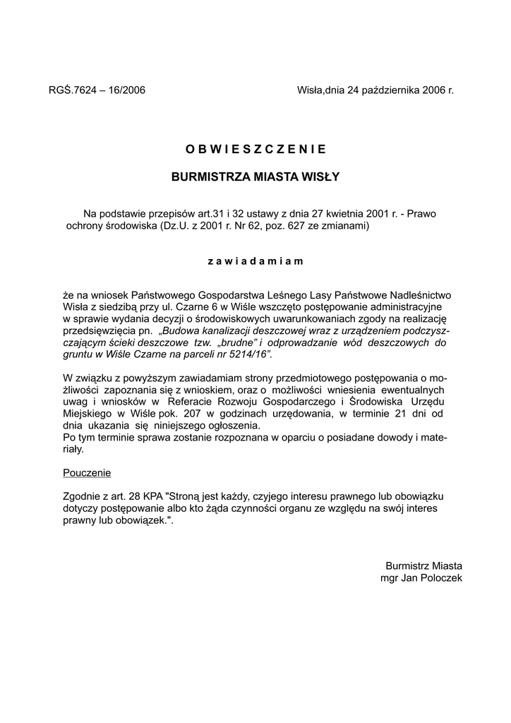 RGŚ.7624 – 16/2006 Wisła,dnia 24 października 2006 r. OBWIESZCZENIE BURMISTRZA MIASTA WISŁY Na podstawie przepisów art.31 i 32 ustawy z dnia 27 kwietnia 2001 r. - Prawo ochrony środowiska (Dz.U. z 2001 r. Nr 62, poz. 627 ze zmianami) zawiadamiam że na wniosek Państwowego Gospodarstwa Leśnego Lasy Państwowe Nadleśnictwo Wisła z siedzibą przy ul. Czarne 6 w Wiśle wszczęto postępowanie administracyjne w sprawie wydania decyzji o środowiskowych uwarunkowaniach zgody na realizację przedsięwzięcia pn. „Budowa kanalizacji deszczowej wraz z urządzeniem podczyszczającym ścieki deszczowe tzw. „brudne” i odprowadzanie wód deszczowych do gruntu w Wiśle Czarne na parceli nr 5214/16”. W związku z powyższym zawiadamiam strony przedmiotowego postępowania o możliwości zapoznania się z wnioskiem, oraz o możliwości wniesienia ewentualnych uwag i wniosków w Referacie Rozwoju Gospodarczego i Środowiska Urzędu Miejskiego w Wiśle pok. 207 w godzinach urzędowania, w terminie 21 dni od dnia ukazania się niniejszego ogłoszenia. Po tym terminie sprawa zostanie rozpoznana w oparciu o posiadane dowody i materiały. Pouczenie Zgodnie z art. 28 KPA "Stroną jest każdy, czyjego interesu prawnego lub obowiązku dotyczy postępowanie albo kto żąda czynności organu ze względu na swój interes prawny lub obowiązek.". Burmistrz Miasta mgr Jan Poloczek