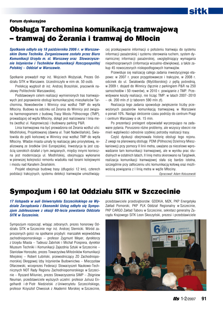 Forum dyskusyjne Obsługa Tarchomina komunikacją tramwajową – tramwaj do Żerania i tramwaj do Młocin Spotkanie odbyło się 18 października 2006 r. w Warszawskim Domu Technika. Zorganizowane zostało przez Biuro Komunikacji Urzędu m. st. Warszawy oraz Stowarzyszenie Inżynierów i Techników Komunikacji Rzeczpospolitej Polskiej – Oddział w Warszawie. Spotkanie prowadził mgr inż. Wojciech Wojtysiak, Prezes Oddziału SITK w Warszawie. Uczestniczyło w nim ok. 50 osób. Prelekcję wygłosił dr inż. Andrzej Brzeziński, pracownik naukowy Politechniki Warszawskiej. Podstawowym celem realizacji wymienionych tras tramwajowych jest poprawienie obsługi komunikacyjnej mieszkańców Tarchomina, Nowodworów i Winnicy oraz wzdłuż TMP do węzła Młociny. Budowa na odcinku od Żerania do Winnicy jest związana harmonogramem z budową Trasy Mostu Północnego (TMP), prowadzącej od węzła Młociny, dokąd jest realizowana I linia metra (wzdłuż ul. Kasprowicza) i budowany parking P&R. Linia tramwajowa ma być prowadzona od Żerania wzdłuż ulic: Modlińskiej, Projektowanej (dawna ul. Trakt Nadwiślański), Światowida do pętli końcowej w Winnicy oraz wzdłuż TMP do węzła Młociny. Władze miasta uznały tę realizację jako priorytetową, realizowaną ze środków Unii Europejskiej. Inwestycja ta jest częścią szerokich działań z tym związanych, między innymi konieczna jest modernizacja ul. Modlińskiej, obejmująca wykonanie w pierwszej kolejności remontu wiaduktu nad torami kolejowymi i mostu nad Kanałem Żerańskim. Projekt obejmuje budowę trasy (długości 12 km), czterech podstacji trakcyjnych, systemu detekcji tramwajów umożliwiają- cej przekazywanie informacji o położeniu tramwaju do systemu informacji pasażerskiej i systemu sterowania ruchem, system dynamicznej informacji pasażerskiej, uwzględniający wymagania niepełnosprawnych (informacja wizualno-dźwiękowa), a także zakup 45 nowoczesnych niskopodłogowych tramwajów. Przewiduje się realizację całego zadania inwestycyjnego etapowo: w 2007 r. prace przygotowawcze i trakcyjne, w 2008 r. odcinek do ul. Światowida (Myśliborskiej) z pętlą pośrednią, w 2009 r. dojazd do Winnicy (łącznie z parkingiem P&R na 250 samochodów i 50 rowerów), w 2010 r. powiązanie z TMP. Przewidywane koszty realizacji, nie licząc TMP: w latach 2007–2010 – ok. 200 mln zł (z taborem 590 mln zł). Realizacja tego zadania spowoduje zwiększenie liczby przewożonych pasażerów komunikacją tramwajową w Warszawie o ponad 10%. Nastąpi skrócenie czasu podróży do centrum Pragi i centrum Warszawy o ok. 15 min. Po prezentacji prelegent odpowiadał wyczerpująco na zadawane pytania. Poruszono różne problemy, ale wszyscy obecni nie mieli wątpliwości odnośnie szybkiej potrzeby realizacji trasy. Część dyskusji obejmowała historię obsługi tego rejonu. Z uwagi na planowaną obsługę PDM (Północnej Dzielnicy Mieszkaniowej) przy pomocy II linii metra, uważano za niecelowe wprowadzanie tam komunikacji tramwajowej, ale w wyniku prac studialnych w ostatnich latach, II linię metra skierowano na Targówek, realizacja komunikacji tramwajowej stała się bardzo istotna, szczególnie przy zatłoczeniu ulic komunikacją kołową oraz możliwością powiązania z I linią metra w węźle Młociny. Opracował: Adam Kotuszewski Sympozjum i 60 lat Oddziału SITK w Szczecinie 17 listopada w auli Uniwersytetu Szczecińskiego na Wydziale Zarządzania i Ekonomiki Usług odbyło się Sympozjum Jubileuszowe z okazji 60-lecia powstania Oddziału SITK w Szczecinie. przedstawiciele przedsiębiorstw: GDDKiA, MZK, PKP Energetyka Zakład Pomorski, PKP PLK Oddział Regionalny w Szczecinie, PKP CARGO Zakład Taboru w Szczecinie, sekretarz generalny Zarządu Krajowego SITK Leon Skoczyński, prezesi i przedstawiciele Sympozjum rozpoczął, witając zebranych, prezes honorowy Oddziału SITK w Szczecinie mgr inż. Andrzej Sternicki. Wśród zaproszonych gości na spotkanie przybyli: marszałek województwa zachodniopomorskiego – profesor Zygmunt Meyer, dyrektorzy z Urzędu Miasta – Tadeusz Żabiński i Michał Przepiera, dyrektor Muzeum Techniki i Komunikacji Zajezdnia Sztuki w Szczecinie – Stanisław Horoszko, prezes Towarzystwa Miłośników Komunikacji Miejskiej – Robert Łubiński, przewodniczący ZO Zachodniopomorskiej Okręgowej Izby Inżynierów Budownictwa – Mieczysław Ołtarzewski, wiceprezes Federacji Stowarzyszeń Naukowo-Technicznych NOT Rady Regionu Zachodniopomorskiego w Szczecinie – Ryszard Miluniec, prezes Stowarzyszenia SIMP – Zbigniew Neuman, przedstawiciele wyższych uczelni: profesor Juliusz Engelhardt i dr Piotr Niedzielski z Uniwersytetu Szczecińskiego, profesor Krzysztof Chwesiuk z Akademii Morskiej w Szczecinie, 1-2/2007 91 Oddziałów Stowarzyszenia Inżynierów i Techników Komunikacji RP z Bydgoszczy, Katowic, Ostrowa Wlkp., Koszalina, Poznania, Lublina oraz zaproszeni członkowie Szczecińskiego Oddziału SITK. Obrady prowadził prezes Oddziału SITK w Szczecinie mgr inż. Andrzej Kozłowski, który na wstępie wygłosił okolicznościowe przemówienie. Spośród gości zaproszonych jako pierwszy głos zabrał marszałek województwa zachodniopomorskiego profesor Zygmunt Meyer. Mówił on o zaangażowaniu inżynierów w prace dotyczące komunikacji na terenie miasta i województwa. Przedstawił perspektywy komunikacji miejskiej i regionalnej. Mówił o możliwości pozyskiwania środków unijnych na rozwój i modernizację dróg zarówno kołowych, jak i kolejowych, komunikacji miejskiej oraz o ważnej roli Stowarzyszenia w opiniowaniu projektów dotyczących rozwiązań komunikacyjnych. Następnie głos zabrał przedstawiciel Zarządu Krajowego SITK – sekretarz generalny Leon Skoczyński. Gratulował Oddziałowi Szczecińskiemu zaangażowania Oddziału w działalność na rzecz środowiska i rozwoju transportu w regionie, a także umiejętności tworzenia rodzinnej atmosfery wśród czło