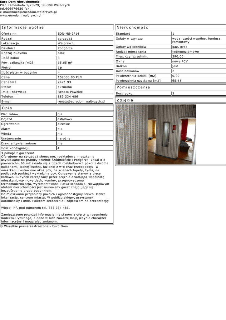 Euro Dom Nieruchomości Plac Zamenhofa 1/28-29, 58-309 Wałbrzych tel.606976630 fax. e-mail:[email protected] www.eurodom.walbrzych.pl Informacje ogólne Nieruchomość Oferta nr EDN-MS-2714 Standard 1 Rodzaj sprzedaż Opłaty w czynszu Lokalizacja Wałbrzych woda, części wspólne, fundusz remontowy Dzielnica Podgórze Opłaty wg liczników gaz, prąd blok Rodzaj mieszkania jednopoziomowe Ilość pokoi 3 Mies. czynsz admin. 390,00 Pow. całkowita [m2] 65.65 m² Okna nowe PCV 1p Balkon jest 4 Ilość balkonów 2 159000.00 PLN Powierzchnia działki [m2] 0.00 Cena/m2 2421.93 Powierzchnia użytkowa [m2] 65,65 Status aktualna Pomieszczenia Imię i nazwisko Renata Pawelec Telefon 883 334 486 E-mail [email protected] Rodzaj budynku Piętro Ilość pięter w budynku Cena Opis Plac zabaw nie Dojazd asfaltowy Ogrzewanie piecowe Alarm nie Winda nie Usytuowanie narożne Drzwi antywłamaniowe nie Ilość kondygnacji 4 3 pokoje z garażem! Oferujemy na sprzedaż słoneczne, rozkładowe mieszkanie usytuowane na granicy dzielnic Śródmieście i Podgórze. Lokal o o powierzchni 65 m2 składa się z trzech rozkładowych pokoi z dwoma balkonami, jasnej kuchni, łazienki z w-c oraz przedpokoju. W mieszkaniu wstawione okna pcv, na ścianach tapety, tynki, na podłogach parkiet i wykładzina pcv. Ogrzewanie stanowią piece kaflowe. Budynek zarządzany przez prężnie działającą wspólnotę mieszkaniową- nowy dach, kominy, przeprowadzona termomodernizacja, wyremontowana klatka schodowa. Niewątpliwym atutem nieruchomości jest murowany garaż znajdujący się bezpośrednio przed budynkiem. Do mieszkania przynależy piwnica i ogólnodostępny strych. Dobra lokalizacja, centrum miasta. W pobliżu sklepy, przystanek autobusowy i inne. Polecam serdecznie i zapraszam na prezentację! Więcej inf. pod numerem tel. 883 334 486. Zamieszczone powyżej informacje nie stanowią oferty w rozumieniu Kodeksu Cywilnego, a dane w nich zawarte mają jedynie charakter informacyjny i mogą ulec zmianom. © Wszelkie prawa zastrzeżone - Euro Dom Ilość pokoi Zdjęcia 3