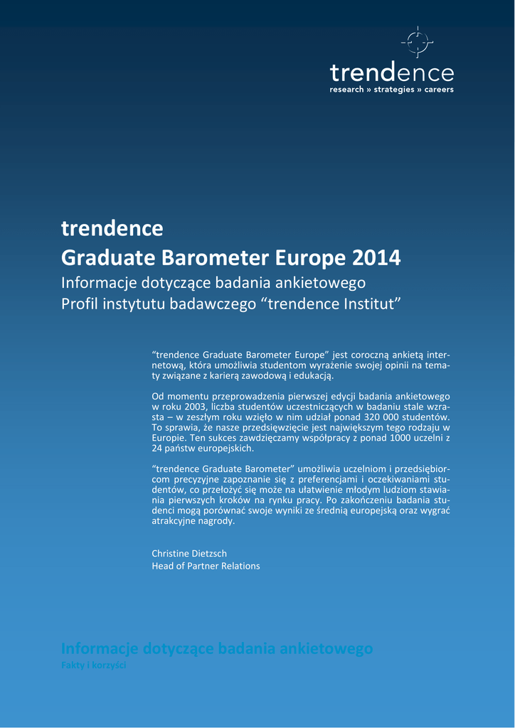 trendence Graduate Barometer Europe 2014 Informacje dotyczące badania ankietowego Profil instytutu badawczego “trendence Institut” “trendence Graduate Barometer Europe” jest coroczną ankietą inter‐ netową, która umożliwia studentom wyrażenie swojej opinii na tema‐ ty związane z karierą zawodową i edukacją. Od momentu przeprowadzenia pierwszej edycji badania ankietowego w roku 2003, liczba studentów uczestniczących w badaniu stale wzra‐ sta – w zeszłym roku wzięło w nim udział ponad 320 000 studentów. To sprawia, że nasze przedsięwzięcie jest największym tego rodzaju w Europie. Ten sukces zawdzięczamy współpracy z ponad 1000 uczelni z 24 państw europejskich. “trendence Graduate Barometer” umożliwia uczelniom i przedsiębior‐ com precyzyjne zapoznanie się z preferencjami i oczekiwaniami stu‐ dentów, co przełożyć się może na ułatwienie młodym ludziom stawia‐ nia pierwszych kroków na rynku pracy. Po zakończeniu badania stu‐ denci mogą porównać swoje wyniki ze średnią europejską oraz wygrać atrakcyjne nagrody. Christine Dietzsch Head of Partner Relations Informacje dotyczące badania ankietowego Fakty i korzyści trendence Graduate Barometer Europe 2014 W jaki sposób jest przeprowadzane badanie ankietowe? Badanie “trendence Graduate Barometer” jest przeprowadzane w formie ankiety internetowej. Za uczestnictwo w badaniu nie ponosi się żadnych kosztów, a wypełnie‐ nie ankiety nie jest skomplikowane ani czasochłonne. Najlepszą gwarancją dużego udziału studentów w badaniu jest bezpośrednie rozesła‐ nie do potencjalnych zainteresowanych e‐maila zawierającego link do ankiety. W tym celu prześlemy Państwu wzór listu do studentów, który mogą Państwo przesłać we własnym imieniu. Przedstawiony powyżej sposób kontaktowania się ze studentami pozwala uzyskać największy odsetek odpowiedzi, co z kolei przekłada się na precyzyjność wyników zaprezentowanych w Państwa Raporcie Partnerskim. Drugą opcją dotarcia do studentów z ankietą jest umieszczenie wspomnianego linku w newsletterze lub na stronie internetowej uczelni. Z przyjemnością służymy radą w wyborze najbardziej odpowiadającego Państwu spo‐ sobu uczestnictwa w badaniu ankietowym, jak również chętnie dostarczymy istotnych informacji oraz niezbędnych dokumentów. Partner Report Jakie korzyści wynikają dla uczelni uczestniczącach w badaniu? Jeżeli Państwa uczelnia zdecyduje się wziąć udział w badaniu ankietowym “trendence Graduate Barometer” oraz uzyska wymaganą liczbę odpowiedzi ze strony studentów, otrzymają Państwo od nas Raport Partnerski. Dzięki temu raportowi będą Państwo mogli zapoznać się z wynikami uczelni w porównaniu ze średnią europejską. Dodatkowo będą mieli Państwo możliwość dokonania wyboru wersji raportu najbar‐ dziej dopasowanej do Państwa potrzeb analitycznych. Przedmiotem raportu mogą być wyniki uzyskane od następujących grup studentów: • wszystkich studentów • studentów kierunków ekonomicznych • studentów kierunków inżynierskich/informatycznych Jakie pytania są zadawane w ankiecie? Do zagadnień poruszanych w ankiecie “trendence Graduate Barometer” należą m. in.: czynniki mające wpływ na wybór uczelni ogólna ocena uczelni przez studentów czas i liczba podań wysłanych podczas poszukiwania pierwszej pracy stopień mobilności zawodowej studentów oczekiwane wynagrodzenie, czas pracy i okres zatrudnienia u pierwszego pracodawcy dotychczasowe doświadczenie zawodowe i stopień znajomości języka angiel‐ skiego opinie studentów na tematy związane z edukacją i zatrudnieniem najbardziej atrakcyjni pracodawcy wśród studentów 2 trendence Graduate Barometer Europe 2014 Jakie korzyści wynikają dla studentów biorących udział w badaniu ankietowym? Za udział w badaniu ankietowym “trendence Graduate Barometer” studenci otrzymu‐ ją Raport Studencki. Zawiera on porównanie wyników pochodzących z “Graduate Barometer 2013” ze średnią europejską, jak również ranking “Najbardziej atrakcyj‐ nych pracodawców”. Ponadto na studentów czeka wiele nagród pieniężnych. Profil “trendence Institut” Dane i fakty ESOMAR Członkowie stowarzyszenia zobowiązują się do przestrzegania międzynarodowej normy badań marketingowych i spolecz‐ nyach ICO/ESOMAR, opracowanej wspól‐ nie przez ESOMAR i Międzynarodową Izbę Przemysłowo‐Handlową. Norma jest uznawana przez główne organy rządowe na całym świecie. “trendence Institut” jako instytut badawczy “trendence Institut” jest wiodącym instytutem badawczym w Europie specjalizującym się w budowaniu wizerunku pracodawcy (employer branding), marketingu personal‐ nym i rekrutacji. Każdego roku ponad 530 000 maturzystów, studentów i absolwen‐ tów z całego świata bierze udział w naszych badaniach koncentrujących się na takich zagadnieniach jak chociażby ambicje zawodowe czy wybór pracodawcy. Wyniki tych badań są cennym wsparciem dla działu HR: dostarczając wiarygodnych i reprezenta‐ tywnych informacji o potencjalnych pracownikach, staramy się ułatwiać podejmowa‐ nie kluczowych decyzji dotyczących rekrutacji i strategii marketingowych. W oparciu o nasze wyniki, szkoły średnie i uczelnie mają możliwość oceny swojej działalności i rozwoju strategicznych celów. Rankingi “Top 100” ‐ najbardziej pożądanych praco‐ dawców ‐ opracowane na podstawie naszych badań, stanowią cenne źródło informacji dla mediów, pracodawców i przyszłych pracowników. O naszym zaangażowaniu w uzyskaniu najwyższego standardu jakości wyników świad‐ czy fakt, że główni pracownicy naszego zespołu posiadają członkostwo ESOMAR. Na‐ szą pracę cechuje także bezwzględne przestrzeganie normy ISO 20252 i innych uzna‐ nych standardów w przeprowadzaniu badań rynkowych. ”trendence Institut” specjali‐ zuje się także w wy