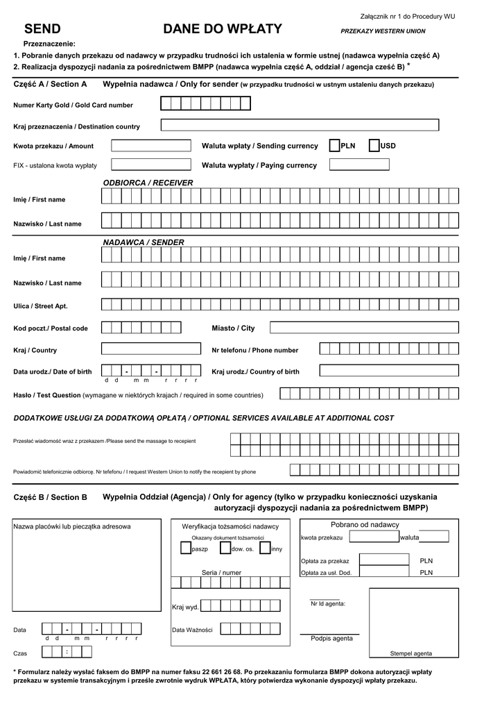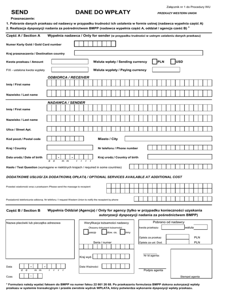 Załącznik nr 1 do Procedury WU SEND DANE DO WPŁATY PRZEKAZY WESTERN UNION Przeznaczenie: 1. Pobranie danych przekazu od nadawcy w przypadku trudności ich ustalenia w formie ustnej (nadawca wypełnia część A) 2. Realizacja dyspozycji nadania za pośrednictwem BMPP (nadawca wypełnia część A, oddział / agencja cześć B) * Wypełnia nadawca / Only for sender (w przypadku trudności w ustnym ustaleniu danych przekazu) Część A / Section A Numer Karty Gold / Gold Card number Kraj przeznaczenia / Destination country Kwota przekazu / Amount Waluta wpłaty / Sending currency FIX - ustalona kwota wypłaty Waluta wypłaty / Paying currency PLN USD ODBIORCA / RECEIVER Imię / First name Nazwisko / Last name NADAWCA / SENDER Imię / First name Nazwisko / Last name Ulica / Street Apt. Kod poczt./ Postal code Miasto / City Kraj / Country Nr telefonu / Phone number - Data urodz./ Date of birth d d m m Kraj urodz./ Country of birth r r r r Hasło / Test Question (wymagane w niektórych krajach / required in some countries) DODATKOWE USŁUGI ZA DODATKOWĄ OPŁATĄ / OPTIONAL SERVICES AVAILABLE AT ADDITIONAL COST Przesłać wiadomość wraz z przekazem /Please send the massage to recepient Powiadomić telefonicznie odbiorcę. Nr tefefonu / I request Western Union to notify the recepient by phone Wypełnia Oddział (Agencja) / Only for agency (tylko w przypadku konieczności uzyskania autoryzacji dyspozycji nadania za pośrednictwem BMPP) Część B / Section B Nazwa placówki lub pieczątka adresowa Weryfikacja tożsamości nadawcy paszp dow. os. Seria / numer Kraj wyd. - Data d Czas d m m : Pobrano od nadawcy kwota przekazu Okazany dokument tożsamości waluta inny Opłata za przekaz PLN Opłata za usł. Dod. PLN Nr Id agenta: Data Ważności r r r r Podpis agenta Stempel agenta * Formularz należy wysłać faksem do BMPP na numer faksu 22 661 26 68. Po przekazaniu formularza BMPP dokona autoryzacji wpłaty przekazu w systemie transakcyjnym i prześle zwrotnie wydruk WPŁATA, który potwierdza wykonanie dyspozycji wpłaty przekazu.