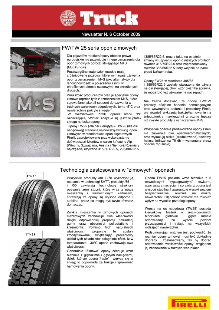 FW/TW 25 seria opon zimowych Dla pojazdów medium/heavy obecne prawo europejskie nie przewiduje innego oznaczenia dla opon zimowych oprócz istniejącego M+S (Mud+Snow). Poszczególne kraje czł onkowskie mają zróż nicowane przepisy, które wymagająuż ywania opon z oznaczeniem M+S jako alternatywy dla ł ańcuchów bądźw poł ączeniu z nimi w okreś lonych okresie czasowym i na określonych drogach. Większośćproducentów oferuje specjalne opony zimowe (oprócz tych z oznaczeniem M+S, które sąuważ ane jako all-season) do uż ywania w trudnych warunkach pogodowych, temp -5°C oraz nawierzchnie pokryte śniegiem. W rozmiarówce Pirelli, oprócz literki “W” oznaczającej “Winter” znajduje sięjeszcze pł atek śniegu na boku opony. Opony FW25 (dla osi kierują cej) i TW25 (dla osi napędowej) stanowiąnajnowsząewolucjęopon zimowych w rozmiarówce opon cięż arowych Pirelli, zaprojektowane przy wykorzystaniu doświadczeńklientów w cał ym ł ańcuchu Alp (Wł ochy, Szwajcaria, Austria i Niemcy). Rozmiary najczęściej uż ywane 315/80 R22.5, 295/80R22.5 i 385/65R22.5, oraz z faktu na ostatnie zmiany w uż ywaniu opon o niż szych profilach również315/70R22.5 oraz zaprezentowany rozmiar 385/55R22.5 który wejdzie na rynek przed końcem roku. Opony FW25 w rozmiarze 385/65 i 385/55R22.5 został y stworzone do użycia na osi sterującej, choćwzór bieżnika sprawia, ż e mogąbyćteżuż ywane na naczepach. Nie trzeba dodawać, ż e opony FW/TW przeszł y oficjalne badania homologacyjne oraz wewnątrzne badania i procedury Pirelli, ale równieżwykazujątrakcję/hamowanie na ś niegu/mokrej nawierzchni znacznie lepszą niżzwykł e produkty z oznaczeniem M+S. Wszystkie obecnie produkowane opony Pirelli nie zaiweraja olei wysokoaromatycznych, oraz wykazująniskie (zredukowane) poziomy hał asu (niższe niż78 db – wymagane przez obecne regulacje). Technologia zastosowana w “zimowych” oponach FW25 TW25 Wszystkie produkty /80 i /70 wykorzystują opasanie w technologi SATT, produkty /65 i /55 zawierają technologię struktury opasania zero stopni, które wraz z nową mieszanką i wzmocnionym karkasem, sprawiają ż e opony są wysoce odporne i stabilne, przez co mogą byćuż yte równiez do naczep. Zwykł a mieszanka w zimowych oponach cież arowych zachowuje swe wł aściwoś ci dzięki odpowiedniej proporcji naturalnej gumy oraz obecności polibutatienu i krzemionki. Pomimo tych naturalnych wł aściwości, proporcje te został y zmodyfikowane, zwiększając procentowy udziałtych skł adników osiagnieto efekt, iz w temparaturze –30°C opona zachowuje swe wł aściwości. Generalnie “Zimowe” opony cechuje wzór bieżnika z gł ębokimie i gę stymi nacięciami, dzieki którym opona “ł apie” i wgryza sięw śnieg; to odpowiada za trakcje i sprawnoś ć hamowania opony. Opona FW25 posiada wzór bieżnika z 5 obwodowymi “zygzagowatymi” rowkami, wzór wraz z nacięciami sprawia iżopona jest wysoce stabilna I gwarantuje wysoki poziom bezpieczeństwa, również na mokrej nawierzchni. Gł ębokoś ćrowków ma również wpł yw na wysokie przebiegi opony. Wersja na oś napędową (TW25) posiada kierunkowy bież nik o zróżnicowanych bloczkach, gł ebokie i gęste lamele odpowiadaja za wysoki poziom przyczepności i trakcji, na wszystkich rodzajach nawierzchni. Podsumowując, waż nym jest podkreślić, że rozmiar opony zimowej musi byćdokł adnie dobrany i zbalansowany, tak by dobrać odpowiednie wł aś ciwości opony, względem jej zachowania w róż nych warunkach.