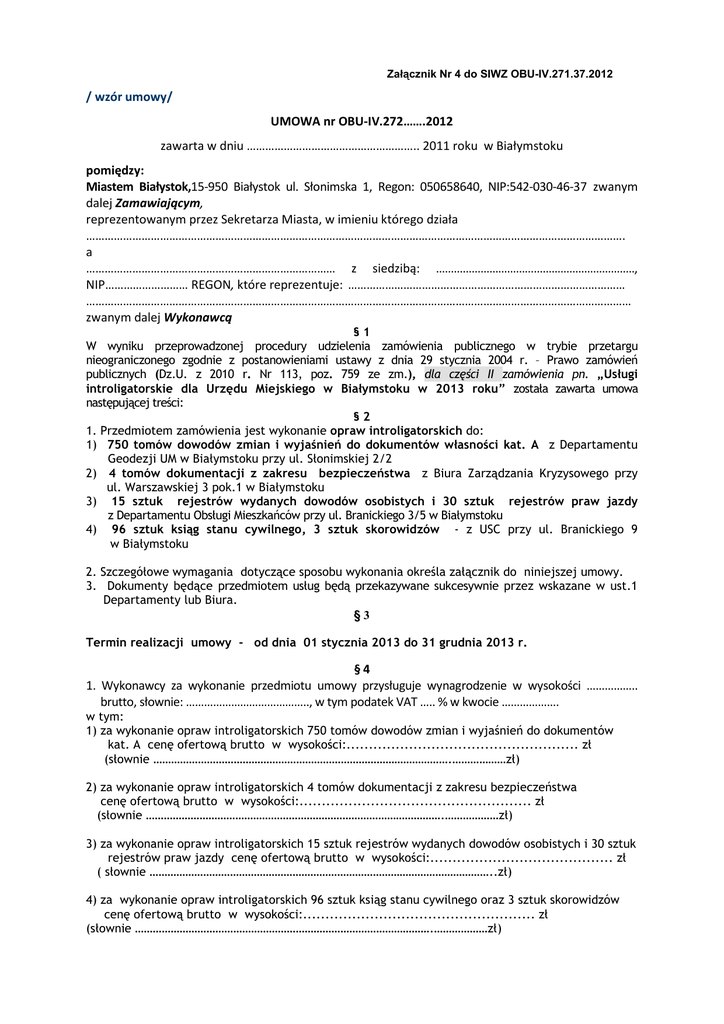 Załącznik Nr 4 do SIWZ OBU-IV.271.37.2012 / wzór umowy/ UMOWA nr OBU-IV.272…….2012 zawarta w dniu ……………………………………………….. 2011 roku w Białymstoku pomiędzy: Miastem Białystok,15-950 Białystok ul. Słonimska 1, Regon: 050658640, NIP:542-030-46-37 zwanym dalej Zamawiającym, reprezentowanym przez Sekretarza Miasta, w imieniu którego działa …………………………………………………………………………………………………………………………………………………………. a ……………………………………………………………………… z siedzibą: …………………………………..…………………….., NIP……………………… REGON, które reprezentuje: ……………………………………………………………………………… …………………………………………………………………………………………………………………………………………………………… zwanym dalej Wykonawcą §1 W wyniku przeprowadzonej procedury udzielenia zamówienia publicznego w trybie przetargu nieograniczonego zgodnie z postanowieniami ustawy z dnia 29 stycznia 2004 r. – Prawo zamówień publicznych (Dz.U. z 2010 r. Nr 113, poz. 759 ze zm.), dla części II zamówienia pn. „Usługi introligatorskie dla Urzędu Miejskiego w Białymstoku w 2013 roku” została zawarta umowa następującej treści: §2 1. Przedmiotem zamówienia jest wykonanie opraw introligatorskich do: 1) 750 tomów dowodów zmian i wyjaśnień do dokumentów własności kat. A z Departamentu Geodezji UM w Białymstoku przy ul. Słonimskiej 2/2 2) 4 tomów dokumentacji z zakresu bezpieczeństwa z Biura Zarządzania Kryzysowego przy ul. Warszawskiej 3 pok.1 w Białymstoku 3) 15 sztuk rejestrów wydanych dowodów osobistych i 30 sztuk rejestrów praw jazdy z Departamentu Obsługi Mieszkańców przy ul. Branickiego 3/5 w Białymstoku 4) 96 sztuk ksiąg stanu cywilnego, 3 sztuk skorowidzów - z USC przy ul. Branickiego 9 w Białymstoku 2. Szczegółowe wymagania dotyczące sposobu wykonania określa załącznik do niniejszej umowy. 3. Dokumenty będące przedmiotem usług będą przekazywane sukcesywnie przez wskazane w ust.1 Departamenty lub Biura. §3 Termin realizacji umowy - od dnia 01 stycznia 2013 do 31 grudnia 2013 r. §4 1. Wykonawcy za wykonanie przedmiotu umowy przysługuje wynagrodzenie w wysokości …………….. brutto, słownie: ………………………………….., w tym podatek VAT ….. % w kwocie ………………. w tym: 1) za wykonanie opraw introligatorskich 750 tomów dowodów zmian i wyjaśnień do dokumentów kat. A cenę ofertową brutto w wysokości:.................................................... zł (słownie ……………………………………………………………………………………….………………zł) 2) za wykonanie opraw introligatorskich 4 tomów dokumentacji z zakresu bezpieczeństwa cenę ofertową brutto w wysokości:.................................................... zł (słownie ……………………………………………………………………………………….………………zł) 3) za wykonanie opraw introligatorskich 15 sztuk rejestrów wydanych dowodów osobistych i 30 sztuk rejestrów praw jazdy cenę ofertową brutto w wysokości:......................................... zł ( słownie ……………………………………………………………………………………………………..zł) 4) za wykonanie opraw introligatorskich 96 sztuk ksiąg stanu cywilnego oraz 3 sztuk skorowidzów cenę ofertową brutto w wysokości:.................................................... zł (słownie ……………………………………………………………………………………….………………zł) 2. Zamawiający dopuszcza fakturowanie częściowe za wykonanie opraw introligatorskich poszczególnych asortymentów dokumentacji wymienionych w ust.1. 3. Płatność na rzecz Wykonawcy dokonywana będzie przelewem, na podane przez niego konto bankowe, w terminie 30 dni od dnia wystawienia faktury za faktycznie zrealizowany zakres usług. 4. Miasto Białystok - Urząd Miejski w Białymstoku jest płatnikiem podatku VAT i będzie adresatem wystawionej faktury. Numer NIP 542- 030-46-37, REGON 000 515 000. 5. Zamawiający wyraża zgodę na wystawienie faktury VAT bez jego podpisu. 6. Podstawę złożenia faktury stanowić będzie podpisany przez strony umowy protokół zdawczo-odbiorczy nie zawierający zastrzeżeń. §5 Na wykonane usługi Wykonawca udziela 2 letniej gwarancji licząc od protokolarnego odbioru przedmiotu umowy bez uwag. §6 Wykonawca wykona zamówienie bez udziału podwykonawców/ powierzy podwykonawcom następujący zakres ……………………………………………. /* 2. Zlecenie wykonania części prac podwykonawcom nie zmienia zobowiązań Wykonawcy wobec Zamawiającego za wykonanie tej części zamówienia. Wykonawca jest odpowiedzialny za działania, uchybienia i zaniedbania podwykonawców i ich pracowników w takim samym stopniu, jakby to były działania Wykonawcy. 3. Wykonawca ponosi odpowiedzialność za zapłatę wynagrodzenia za część zamówienia wykonaną przez podwykonawcę. §7 1. W przypadku odstąpienia od umowy przez którąkolwiek ze stron z przyczyn leżących po stronie Wykonawcy, Wykonawca zapłaci Zamawiającemu karę umowną w wysokości 10% wynagrodzenia (brutto), o którym mowa w § 4 ust.1 umowy. 2. W przypadku odstąpienia od umowy przez którąkolwiek ze stron z przyczyn leżących po stronie Zamawiającego, zapłaci on Wykonawcy karę umowną w wysokości 10% wynagrodzenia (brutto), o którym mowa w § 4 ust.1 umowy, za wyjątkiem sytuacji opisanej w § 8 ust.1 zgodnie z art.145 ust.1 ustawy Pzp. 3 . W przypadku wystąpienia opóźnień w wykonaniu zleconej usługi, Wykonawca zobowi