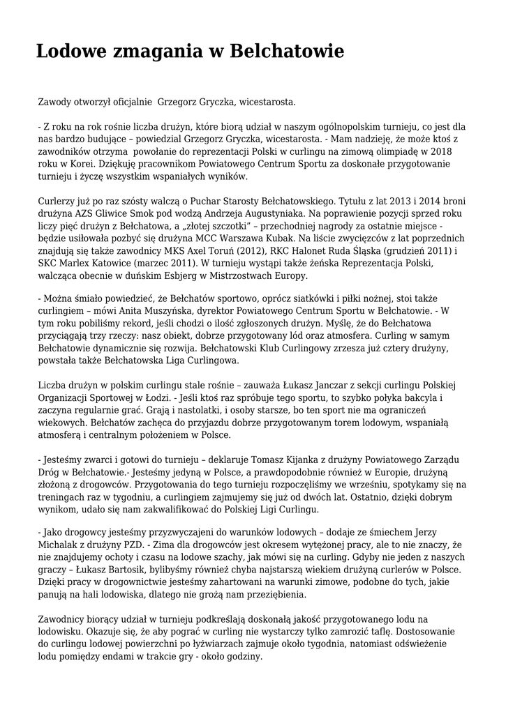 Lodowe zmagania w Belchatowie Zawody otworzył oficjalnie Grzegorz Gryczka, wicestarosta. - Z roku na rok rośnie liczba drużyn, które biorą udział w naszym ogólnopolskim turnieju, co jest dla nas bardzo budujące – powiedzial Grzegorz Gryczka, wicestarosta. - Mam nadzieję, że może ktoś z zawodników otrzyma powołanie do reprezentacji Polski w curlingu na zimową olimpiadę w 2018 roku w Korei. Dziękuję pracownikom Powiatowego Centrum Sportu za doskonałe przygotowanie turnieju i życzę wszystkim wspaniałych wyników. Curlerzy już po raz szósty walczą o Puchar Starosty Bełchatowskiego. Tytułu z lat 2013 i 2014 broni drużyna AZS Gliwice Smok pod wodzą Andrzeja Augustyniaka. Na poprawienie pozycji sprzed roku liczy pięć drużyn z Bełchatowa, a „złotej szczotki” – przechodniej nagrody za ostatnie miejsce będzie usiłowała pozbyć się drużyna MCC Warszawa Kubak. Na liście zwycięzców z lat poprzednich znajdują się także zawodnicy MKS Axel Toruń (2012), RKC Halonet Ruda Śląska (grudzień 2011) i SKC Marlex Katowice (marzec 2011). W turnieju wystąpi także żeńska Reprezentacja Polski, walcząca obecnie w duńskim Esbjerg w Mistrzostwach Europy. - Można śmiało powiedzieć, że Bełchatów sportowo, oprócz siatkówki i piłki nożnej, stoi także curlingiem – mówi Anita Muszyńska, dyrektor Powiatowego Centrum Sportu w Bełchatowie. - W tym roku pobiliśmy rekord, jeśli chodzi o ilość zgłoszonych drużyn. Myślę, że do Bełchatowa przyciągają trzy rzeczy: nasz obiekt, dobrze przygotowany lód oraz atmosfera. Curling w samym Bełchatowie dynamicznie się rozwija. Bełchatowski Klub Curlingowy zrzesza już cztery drużyny, powstała także Bełchatowska Liga Curlingowa. Liczba drużyn w polskim curlingu stale rośnie – zauważa Łukasz Janczar z sekcji curlingu Polskiej Organizacji Sportowej w Łodzi. - Jeśli ktoś raz spróbuje tego sportu, to szybko połyka bakcyla i zaczyna regularnie grać. Grają i nastolatki, i osoby starsze, bo ten sport nie ma ograniczeń wiekowych. Bełchatów zachęca do przyjazdu dobrze przygotowanym torem lodowym, wspaniałą atmosferą i centralnym położeniem w Polsce. - Jesteśmy zwarci i gotowi do turnieju – deklaruje Tomasz Kijanka z drużyny Powiatowego Zarządu Dróg w Bełchatowie.- Jesteśmy jedyną w Polsce, a prawdopodobnie również w Europie, drużyną złożoną z drogowców. Przygotowania do tego turnieju rozpoczęliśmy we wrześniu, spotykamy się na treningach raz w tygodniu, a curlingiem zajmujemy się już od dwóch lat. Ostatnio, dzięki dobrym wynikom, udało się nam zakwalifikować do Polskiej Ligi Curlingu. - Jako drogowcy jesteśmy przyzwyczajeni do warunków lodowych – dodaje ze śmiechem Jerzy Michalak z drużyny PZD. - Zima dla drogowców jest okresem wytężonej pracy, ale to nie znaczy, że nie znajdujemy ochoty i czasu na lodowe szachy, jak mówi się na curling. Gdyby nie jeden z naszych graczy – Łukasz Bartosik, bylibyśmy również chyba najstarszą wiekiem drużyną curlerów w Polsce. Dzięki pracy w drogownictwie jesteśmy zahartowani na warunki zimowe, podobne do tych, jakie panują na hali lodowiska, dlatego nie grożą nam przeziębienia. Zawodnicy biorący udział w turnieju podkreślają doskonałą jakość przygotowanego lodu na lodowisku. Okazuje się, że aby pograć w curling nie wystarczy tylko zamrozić taflę. Dostosowanie do curlingu lodowej powierzchni po łyżwiarzach zajmuje około tygodnia, natomiast odświeżenie lodu pomiędzy endami w trakcie gry - około godziny. - Oprócz wylania wody, zamrożenia jej i dobrego wypoziomowania, ważne jest dobre przygotowanie tzw. pebli, małych kropelek na powierzchni lodu, które powodują, że kamień puszczany po lodzie ma mniejszy styk z lodem, co z kolei powoduje, że jego posuwanie się po lodzie jest dłuższe – tłumaczy Michał Zakrzewski, icemaster, czyli osoba odpowiedzialna za perfekcyjne przygotowanie lodowej tafli. - Do przygotowania nawierzchni używamy specjalnej zraszarki, którą skraplamy lód, a potem maszyną ścinamy same czubeczki kropelek, żeby były krótkie, przez co lód jest bardziej przewidywalny dla graczy. Ja chyba w poprzednim życiu byłem Szkotem, ponieważ uwielbiam to robić i przygotowując taflę czuje się po prostu spełniony. Krzysztof Borowski Rzecznik prasowy Starostwo Powiatowe w Bełchatowie