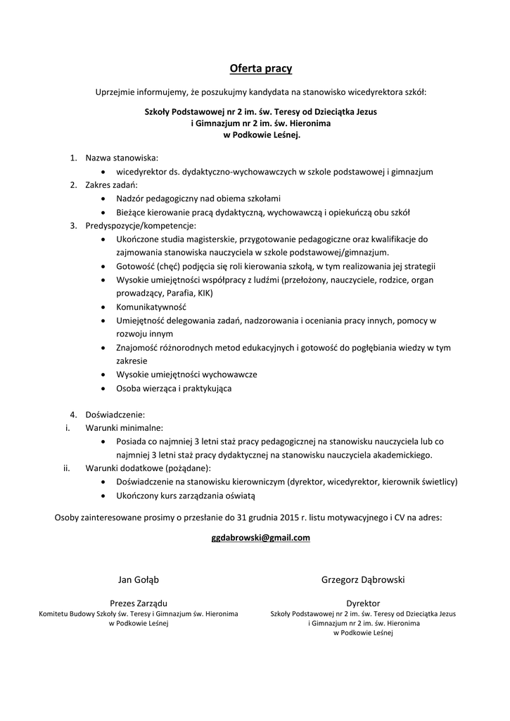 Oferta pracy Uprzejmie informujemy, że poszukujmy kandydata na stanowisko wicedyrektora szkół: Szkoły Podstawowej nr 2 im. św. Teresy od Dzieciątka Jezus i Gimnazjum nr 2 im. św. Hieronima w Podkowie Leśnej. 1. Nazwa stanowiska:  wicedyrektor ds. dydaktyczno-wychowawczych w szkole podstawowej i gimnazjum 2. Zakres zadań:  Nadzór pedagogiczny nad obiema szkołami  Bieżące kierowanie pracą dydaktyczną, wychowawczą i opiekuńczą obu szkół 3. Predyspozycje/kompetencje:  Ukończone studia magisterskie, przygotowanie pedagogiczne oraz kwalifikacje do zajmowania stanowiska nauczyciela w szkole podstawowej/gimnazjum.  Gotowość (chęć) podjęcia się roli kierowania szkołą, w tym realizowania jej strategii  Wysokie umiejętności współpracy z ludźmi (przełożony, nauczyciele, rodzice, organ prowadzący, Parafia, KIK)  Komunikatywność  Umiejętność delegowania zadań, nadzorowania i oceniania pracy innych, pomocy w rozwoju innym  Znajomość różnorodnych metod edukacyjnych i gotowość do pogłębiania wiedzy w tym zakresie  Wysokie umiejętności wychowawcze  Osoba wierząca i praktykująca 4. Doświadczenie: i. Warunki minimalne:  Posiada co najmniej 3 letni staż pracy pedagogicznej na stanowisku nauczyciela lub co najmniej 3 letni staż pracy dydaktycznej na stanowisku nauczyciela akademickiego. ii. Warunki dodatkowe (pożądane):  Doświadczenie na stanowisku kierowniczym (dyrektor, wicedyrektor, kierownik świetlicy)  Ukończony kurs zarządzania oświatą Osoby zainteresowane prosimy o przesłanie do 31 grudnia 2015 r. listu motywacyjnego i CV na adres: [email protected] Jan Gołąb Grzegorz Dąbrowski Prezes Zarządu Dyrektor Komitetu Budowy Szkoły św. Teresy i Gimnazjum św. Hieronima w Podkowie Leśnej Szkoły Podstawowej nr 2 im. św. Teresy od Dzieciątka Jezus i Gimnazjum nr 2 im. św. Hieronima w Podkowie Leśnej