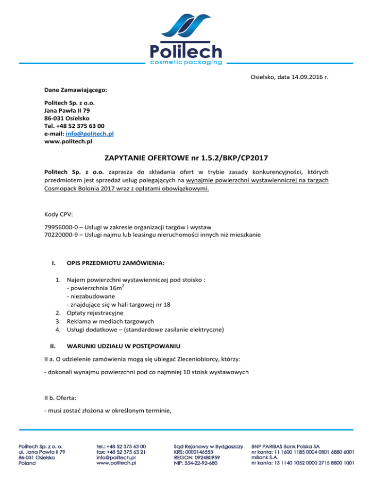 Osielsko data 14.09.2016 r. Osielsko, Dane Zamawiającego: Politech Sp. z o.o. Jana Pawła II 79 86-031 Osielsko Tel. +48 52 375 63 00 e-mail: [email protected] www.politech.pl ZAPYTANIE OFERTOWE nr 1.5.2/BKP/CP2017 Politech Sp. z o.o. zaprasza do składania ofert w trybie zasady konkurencyjności, których który przedmiotem jest sprzedaż usług polegających na wynajmie powierzchni wystawienniczej na targach Cosmopack Bolonia 2017 wraz z opłatami obowiązkowymi. Kody CPV: 79956000-0 – Usługi w zakresie organizacji targów i wystaw 70220000-9 – Usługi najmu lub leasingu nieruchomości innych niż mieszkanie I. OPIS PRZEDMIOTU ZAMÓWIENIA: 1. Najem powierzchni wystawienniczej pod stoisko : - powierzchnia 16m2 - niezabudowane - znajdujące się w hali targowej nr 18 2. Opłaty rejestracyjne 3. Reklama w mediach targowych 4. Usługi dodatkowe – (standardowe standardowe zasilanie elektryczne) II. WARUNKI UDZIAŁU W POSTĘPOWANIU POSTĘPOWA II a. O udzielenie zamówienia mogą się ubiegać Zleceniobiorcy, którzy: - dokonali wynajmu powierzchni pod co najmniej 10 stoisk wystawowych II b. Oferta: - musi zostać złożona w określonym terminie, - musi obejmować wszystkie wyszczególnione podpunkty określone w punkcie I, - każdy Zleceniobiorca może złożyć tylko jedną ofertę, - cena musi być wyrażona w walucie EURO. EURO III. KRYTERIA OCENY OFERTY: OFERTY 1. Zastosowane wagi dla kryteriów: a) Kryterium 1 – cena usługi – waga 50%; b) Kryterium 2 – warunki zapłaty – waga 50%. 2. Zastosowane kryteria do oceny punktowej ofert: Kryterium 1: Cena usługi – C - ilość punktów będzie wyliczana dla tego kryterium wg poniższego wzoru: C (ilość pkt. w ramach kryterium cena) ł ł ó ó ! #$ ! " " " " % ż' %( x # % waga kryterium x 100 pkt Kryterium 2: warunki zapłaty – T - ilość punktów za to kryterium będzie wyliczana wg następujących założeń: → odroczenie terminu płatności połowy ceny zamówienia (licząc od daty umowy, umowy zawartej niezwłocznie po przeprowadzeniu postępowania z wyłonionym wykonawcą) wykonawcą o: - 0 miesięcy (płatność całkowitej ceny zamówienia w terminie 7 dni) – 0 pkt - 1 miesiąc – 10 pkt - 2 miesiące – 20 pkt - 3 miesiące – 30 pkt - 4 miesiące – 40 pkt - 5 miesięcy – 50 pkt np. odroczona płatność połowy ceny zamówienia o 3 m-ce to : T = 30 pkt 3. Punkty każdego z kryteriów będą liczone z dokładnością do dwóch miejsc po przecinku. Łączna suma punktów dla oferty badanej będzie liczona wg poniższego wzoru: S=C+T 4. Zleceniobiorca, który uzyska najwyższą liczbę punktów i jego oferta będzie spełniała wszystkie w kryteria zamówienia, określone w punkcie I Zapytania ofertowego zostanie wybrany do realizacji zamówienia. IV. TERMIN, MIEJSCE I FORMA SKŁADANIA OFERT 1. Termin złożenia oferty upływa z dniem 21 września 2016 roku. 2. Oferty należy składać: -w formie elektronicznej, przesyłając je na adres e-mail: e [email protected] lub - w formie drukowanej osobiście w siedzibie Politech Sp. z o.o.,, ul Jana Pawła II 79, 86-031 86 Osielsko. 3. Oferty złożone ne po terminie nie będą rozpatrywane. Liczy się data wpływu oferty do siedziby POLITECH Sp. z o.o. 4. Osobą upoważnioną do kontaktu ze Zleceniobiorcami jest Mariusz Sieczkowski (tel. +48 887 600 367, e-mail: mail: [email protected]). 5. Miejsce ogłoszenia zapytania ofertowego: www.politech.pl. V. INFORMACJE ORMACJE NT. ZAKRESU WYKLUCZENIA W celu uniknięcia konfliktu interesów interesó zamówienie nie może być udzielone ne podmiotom powiązanym z firmą Politech Sp. z o.o. osobowo lub kapitałowo. Przez powiązania kapitałowe lub osobowe rozumie się wzajemne powiązania między Politech Sp. z o.o. lub osobami upoważnionymi do zaciągania zobowiązań w imieniu Politech Sp. z o.o. lub osobami wykonującymi w umieniu Politech Sp. z o.o. czynności związane z przygotowaniem i przeprowadzeniem procedury wybory wykonawcy a wykonawcą, polegające w szczególności na: a) uczestniczeniu w spółce jako wspólnik spółki spółki cywilnej lub spółki osobowej, b) posiadaniu co najmniej 10% udziałów lub akcji, c) pełnieniu funkcji członka organu nadzorczego lub zarządzającego, prokurenta, pełnomocnika, d) pozostawaniu w związku małżeńskim w stosunku pokrewieństwa lub powinowactwa w linii prostej, pokrewieństwa drugiego stopnia lub powinowactwa drugiego stopnia w linii bocznej lub w stosunku przysposobienia, opieki lub kurateli. Zleceniobiorca dokumentuje ten fakt stosownym oświadczeniem. VI. ZAMÓWIENIA UZUPEŁNIAJĄCE Zamawiający przewiduje możliwość udzielenia Wykonawcy wyłonionemu w trybie zasady konkurencyjności zamówień publicznych uzupełniających, w wysokości nieprzekraczającej 50% wartości zamówienia publicznego określonej w umowie zawartej z wykonawcą, o ile te zamówienia amówienia publiczne są zgodne z przedmiotem zamówienia publicznego podstawowego. VII. POZOSTAŁE INFORMACJE 1. Termin ermin związania ofertą wynosi 7 dni roboczych od daty wskazanej jako termin złożenia oferty. 2. Zamawiający zastrzega sobie prawo do unieważnienia postępowania postępowania o udzielenie zamówienia i odstąpienia od podpisania umowy bez podania przyczyny, 3. Zamawiający zastrzega sobie prawo do pozostawienia postępowania bez wyboru oferty. 4. Warunki i termin płatności za usługę: a. przelew 50% wartości zamówienia w terminie 7 dni od momentu podpisania umowy a kolejne 50% zgodnie z warunkami przedłożonymi w Ofercie, która wygra postępowanie; na podstawie faktur Proforma. Proforma 5. Zleceniobiorca nie może powierzyć wykonania przedmiotu oferty w całości lub części cz osobie trzeciej bez zgody Zamawiającego. amawiającego. 6. Zamawiający dopuszcza możliwość składania uzupełnień do oferty, po wcześniejszym wezwaniu przez Zamawiającego. W przypadku wątpliwości w zakresie interpretacji zapisów oferty Zamawiający dopuszcza możliwość zwróc