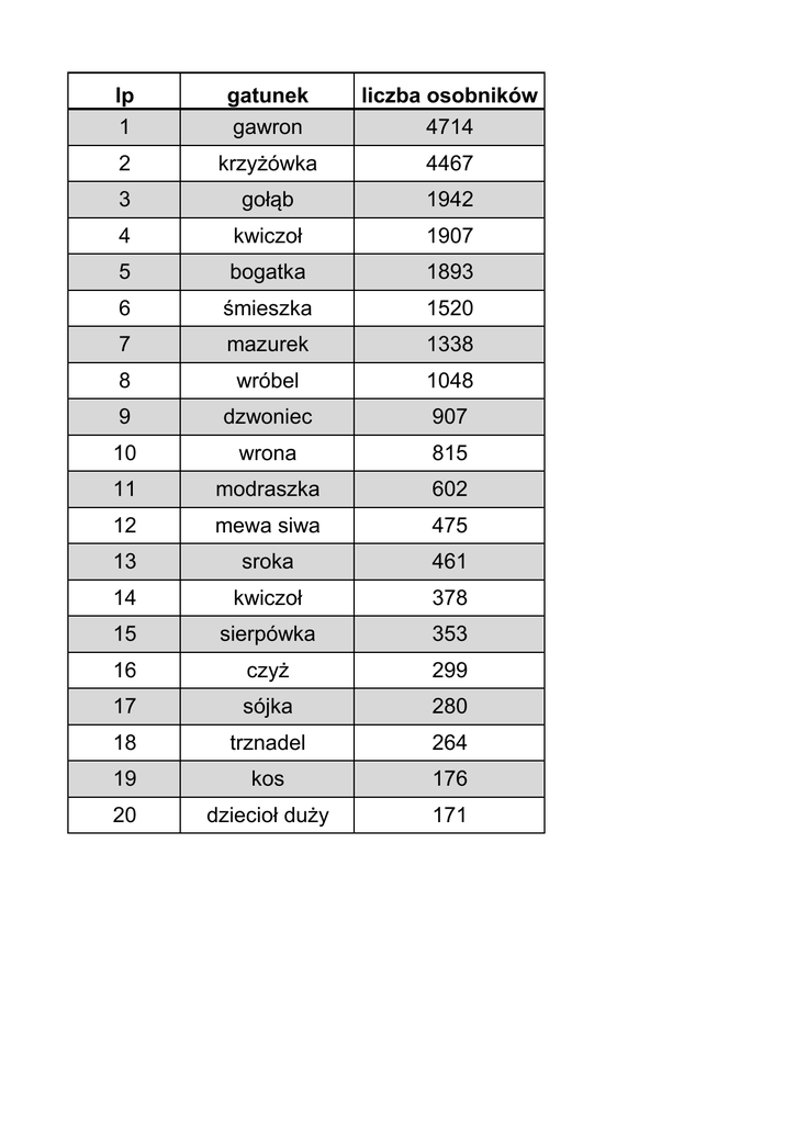 lp 1 gatunek gawron liczba osobników 4714 2 krzyżówka 4467 3 gołąb 1942 4 kwiczoł 1907 5 bogatka 1893 6 śmieszka 1520 7 mazurek 1338 8 wróbel 1048 9 dzwoniec 907 10 wrona 815 11 modraszka 602 12 mewa siwa 475 13 sroka 461 14 kwiczoł 378 15 sierpówka 353 16 czyż 299 17 sójka 280 18 trznadel 264 19 kos 176 20 dziecioł duży 171