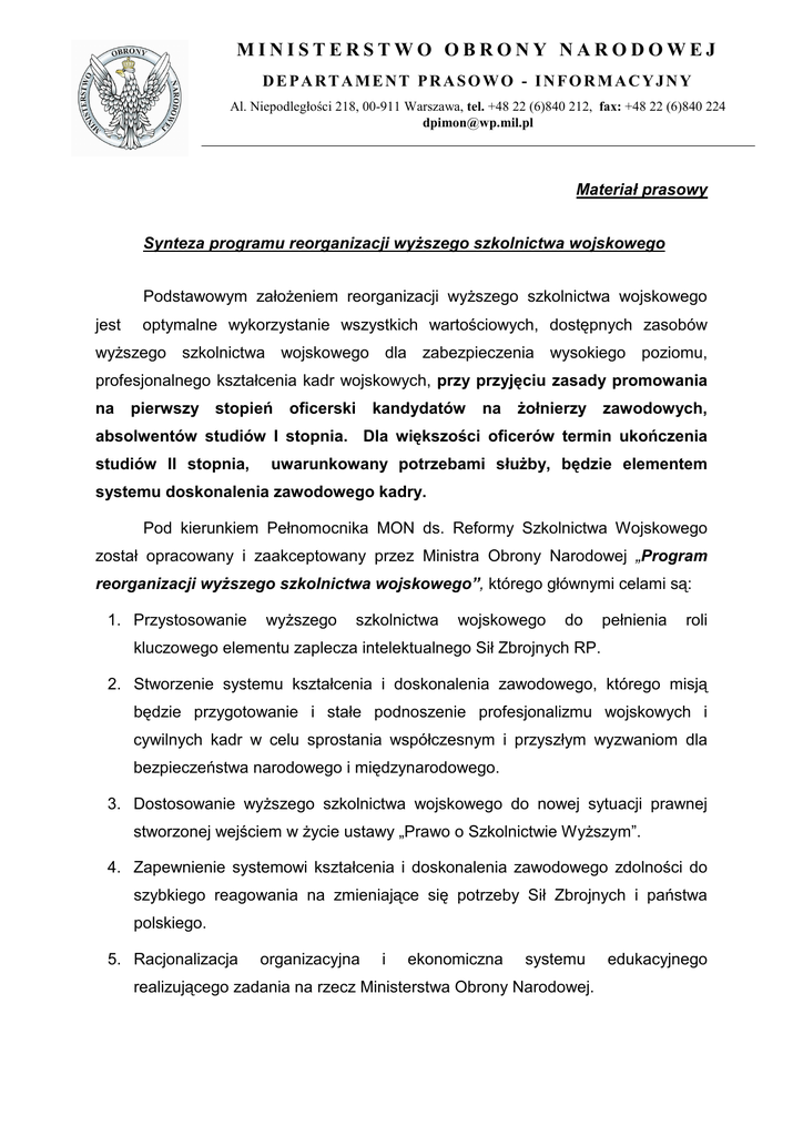 Synteza programu reorganizacji wyższego szkolnictwa wojskowego