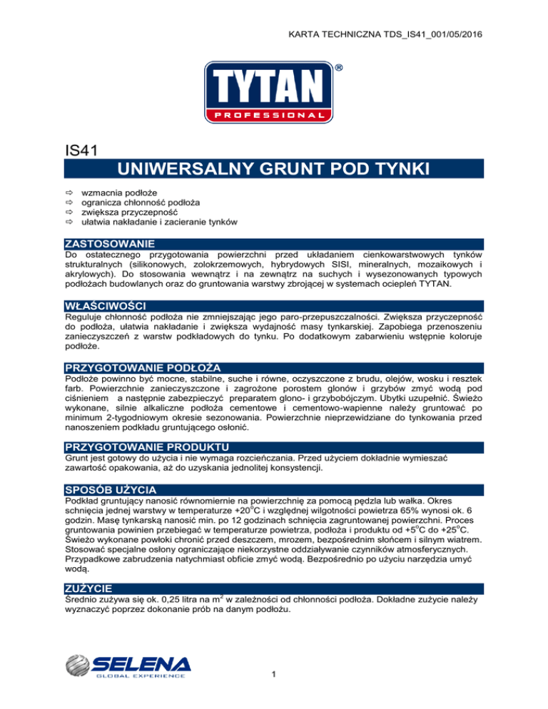 KARTA TECHNICZNA TDS_IS41_001/05/2016 IS41 UNIWERSALNY GRUNT POD TYNKI wzmacnia podłoże ogranicza chłonność podłoża zwiększa przyczepność ułatwia nakładanie i zacieranie tynków ZASTOSOWANIE Do ostatecznego przygotowania powierzchni przed układaniem cienkowarstwowych tynków strukturalnych (silikonowych, zolokrzemowych, hybrydowych SISI, mineralnych, mozaikowych i akrylowych). Do stosowania wewnątrz i na zewnątrz na suchych i wysezonowanych typowych podłożach budowlanych oraz do gruntowania warstwy zbrojącej w systemach ociepleń TYTAN. WŁAŚCIWOŚCI Reguluje chłonność podłoża nie zmniejszając jego paro-przepuszczalności. Zwiększa przyczepność do podłoża, ułatwia nakładanie i zwiększa wydajność masy tynkarskiej. Zapobiega przenoszeniu zanieczyszczeń z warstw podkładowych do tynku. Po dodatkowym zabarwieniu wstępnie koloruje podłoże. PRZYGOTOWANIE PODŁOŻA Podłoże powinno być mocne, stabilne, suche i równe, oczyszczone z brudu, olejów, wosku i resztek farb. Powierzchnie zanieczyszczone i zagrożone porostem glonów i grzybów zmyć wodą pod ciśnieniem a następnie zabezpieczyć preparatem glono- i grzybobójczym. Ubytki uzupełnić. Świeżo wykonane, silnie alkaliczne podłoża cementowe i cementowo-wapienne należy gruntować po minimum 2-tygodniowym okresie sezonowania. Powierzchnie nieprzewidziane do tynkowania przed nanoszeniem podkładu gruntującego osłonić. PRZYGOTOWANIE PRODUKTU Grunt jest gotowy do użycia i nie wymaga rozcieńczania. Przed użyciem dokładnie wymieszać zawartość opakowania, aż do uzyskania jednolitej konsystencji. SPOSÓB UŻYCIA Podkład gruntujący nanosić równomiernie na powierzchnię za pomocą pędzla lub wałka. Okres o schnięcia jednej warstwy w temperaturze +20 C i względnej wilgotności powietrza 65% wynosi ok. 6 godzin. Masę tynkarską nanosić min. po 12 godzinach schnięcia zagruntowanej powierzchni. Proces o o gruntowania powinien przebiegać w temperaturze powietrza, podłoża i produktu od +5 C do +25 C. Świeżo wykonane powłoki chronić przed deszczem, mrozem, bezpośrednim słońcem i silnym wiatrem. Stosować specjalne osłony ograniczające niekorzystne oddziaływanie czynników atmosferycznych. Przypadkowe zabrudzenia natychmiast obficie zmyć wodą. Bezpośrednio po użyciu narzędzia umyć wodą. ZUŻYCIE 2 Średnio zużywa się ok. 0,25 litra na m w zależności od chłonności podłoża. Dokładne zużycie należy wyznaczyć poprzez dokonanie prób na danym podłożu. 1 KARTA TECHNICZNA TDS_IS41_001/05/2016 DANE TECHNICZNE temperatura stosowania (podłoża, powietrza, materiałów) +5 C - +25 C Zużycie ok. 0,25 l/m czas schnięcia ok. 6 h możliwość tynkowania po 12 h kolor wydajność z opakowania 10 litrów biały lub inny żądany 2 ok. 40 m o o 2 SKŁADOWANIE I TRANSPORT Grunt należy przewozić i przechowywać w suchych warunkach i w oryginalnych, nie uszkodzonych o o opakowaniach w temperaturze od +5 C do +25 C. Chronić przed mrozem i bezpośrednim działaniem słońca. Tak przechowywany produkt posiada okres przydatności do użycia 12 miesiące. Opakowanie po otwarciu szczelnie zamknąć i pozostałą zawartość jak najszybciej zużyć. ZGODNOŚĆ Z NORMAMI I WYMAGANIAMI JAKOŚCIOWYMI Produkt (jako składnik systemu) zgodny z Europejską Oceną Techniczną ETA-16/0161, ETA-16/0166, Aprobatą Techniczną ITB AT-15-7286/2013, posiada Deklarację Właściwości Użytkowych oraz Krajową Deklarację Zgodności. Aktualizacja 20.05.2016 Powyższe dane, zalecenia i wskazówki opierają się na naszej najlepszej wiedzy, badaniach oraz doświadczeniach i zostały udzielone w dobrej wierze zgodnie z zasadami obowiązującymi w naszej firmie i u naszych dostawców. Zaproponowane sposoby postępowania uznane są za powszechne, jednak każdy z użytkowników tego materiału powinien upewnić się na wszelkie możliwe sposoby, włącznie ze sprawdzeniem produktu końcowego w odpowiednich warunkach, o przydatności dostarczanych materiałów dla osiągnięcia celów przez niego zamierzonych. Ani Spółka, ani jej upoważnieni przedstawiciele nie mogą ponosić odpowiedzialności za jakiekolwiek straty poniesione na skutek nieprawidłowego, bądź błędnego użycia jej materiałów. 2