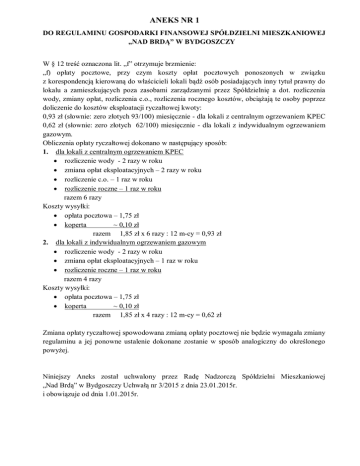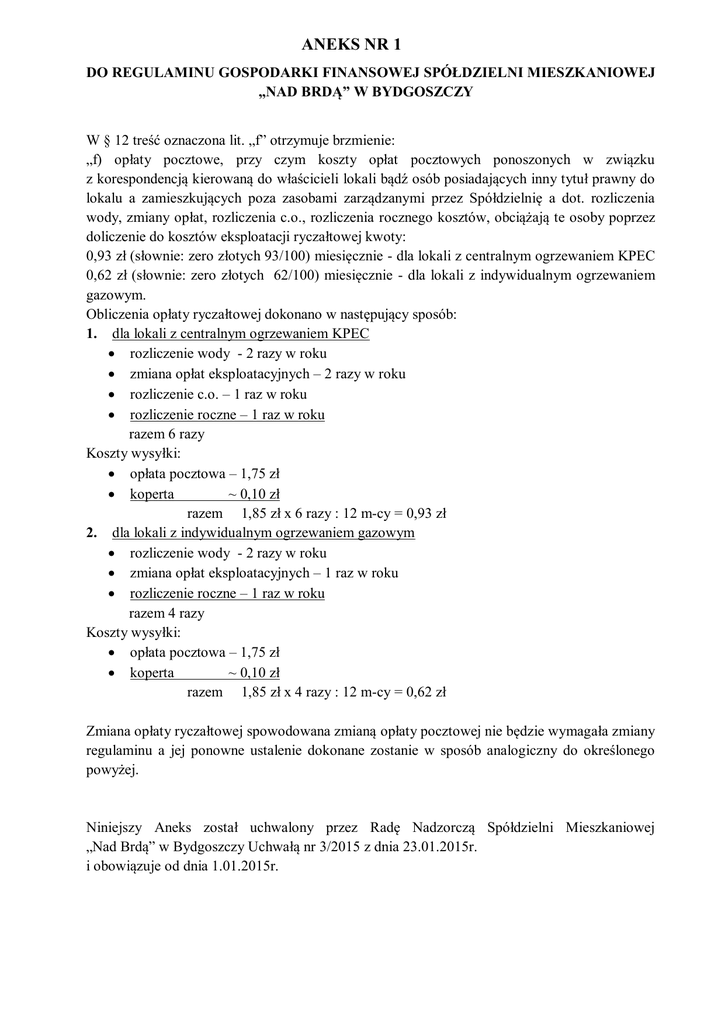 ANEKS NR 1 DO REGULAMINU GOSPODARKI FINANSOWEJ SPÓŁDZIELNI MIESZKANIOWEJ „NAD BRDĄ” W BYDGOSZCZY W § 12 treść oznaczona lit. „f” otrzymuje brzmienie: „f) opłaty pocztowe, przy czym koszty opłat pocztowych ponoszonych w związku z korespondencją kierowaną do właścicieli lokali bądź osób posiadających inny tytuł prawny do lokalu a zamieszkujących poza zasobami zarządzanymi przez Spółdzielnię a dot. rozliczenia wody, zmiany opłat, rozliczenia c.o., rozliczenia rocznego kosztów, obciążają te osoby poprzez doliczenie do kosztów eksploatacji ryczałtowej kwoty: 0,93 zł (słownie: zero złotych 93/100) miesięcznie - dla lokali z centralnym ogrzewaniem KPEC 0,62 zł (słownie: zero złotych 62/100) miesięcznie - dla lokali z indywidualnym ogrzewaniem gazowym. Obliczenia opłaty ryczałtowej dokonano w następujący sposób: 1. dla lokali z centralnym ogrzewaniem KPEC rozliczenie wody - 2 razy w roku zmiana opłat eksploatacyjnych – 2 razy w roku rozliczenie c.o. – 1 raz w roku rozliczenie roczne – 1 raz w roku razem 6 razy Koszty wysyłki: opłata pocztowa – 1,75 zł koperta ~ 0,10 zł razem 1,85 zł x 6 razy : 12 m-cy = 0,93 zł 2. dla lokali z indywidualnym ogrzewaniem gazowym rozliczenie wody - 2 razy w roku zmiana opłat eksploatacyjnych – 1 raz w roku rozliczenie roczne – 1 raz w roku razem 4 razy Koszty wysyłki: opłata pocztowa – 1,75 zł koperta ~ 0,10 zł razem 1,85 zł x 4 razy : 12 m-cy = 0,62 zł Zmiana opłaty ryczałtowej spowodowana zmianą opłaty pocztowej nie będzie wymagała zmiany regulaminu a jej ponowne ustalenie dokonane zostanie w sposób analogiczny do określonego powyżej. Niniejszy Aneks został uchwalony przez Radę Nadzorczą Spółdzielni Mieszkaniowej „Nad Brdą” w Bydgoszczy Uchwałą nr 3/2015 z dnia 23.01.2015r. i obowiązuje od dnia 1.01.2015r.