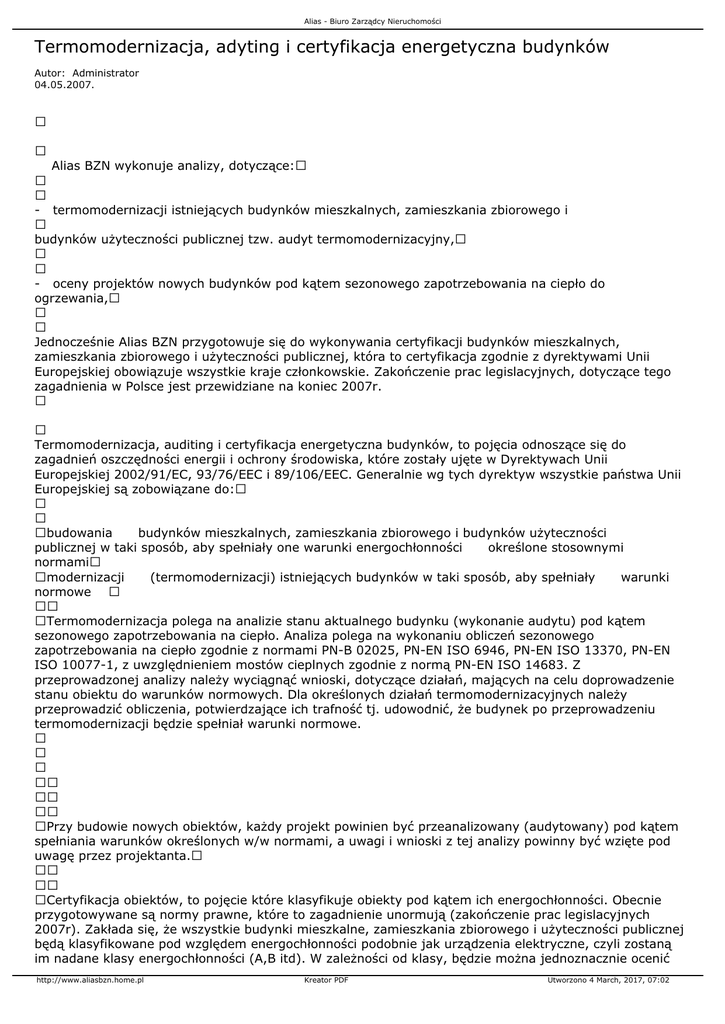Alias - Biuro Zarządcy Nieruchomości Termomodernizacja, adyting i certyfikacja energetyczna budynków Autor: Administrator 04.05.2007. Alias BZN wykonuje analizy, dotyczące: - termomodernizacji istniejących budynków mieszkalnych, zamieszkania zbiorowego i budynków użyteczności publicznej tzw. audyt termomodernizacyjny, - oceny projektów nowych budynków pod kątem sezonowego zapotrzebowania na ciepło do ogrzewania, Jednocześnie Alias BZN przygotowuje się do wykonywania certyfikacji budynków mieszkalnych, zamieszkania zbiorowego i użyteczności publicznej, która to certyfikacja zgodnie z dyrektywami Unii Europejskiej obowiązuje wszystkie kraje członkowskie. Zakończenie prac legislacyjnych, dotyczące tego zagadnienia w Polsce jest przewidziane na koniec 2007r. Termomodernizacja, auditing i certyfikacja energetyczna budynków, to pojęcia odnoszące się do zagadnień oszczędności energii i ochrony środowiska, które zostały ujęte w Dyrektywach Unii Europejskiej 2002/91/EC, 93/76/EEC i 89/106/EEC. Generalnie wg tych dyrektyw wszystkie państwa Unii Europejskiej są zobowiązane do: budowania budynków mieszkalnych, zamieszkania zbiorowego i budynków użyteczności publicznej w taki sposób, aby spełniały one warunki energochłonności określone stosownymi normami modernizacji (termomodernizacji) istniejących budynków w taki sposób, aby spełniały warunki normowe Termomodernizacja polega na analizie stanu aktualnego budynku (wykonanie audytu) pod kątem sezonowego zapotrzebowania na ciepło. Analiza polega na wykonaniu obliczeń sezonowego zapotrzebowania na ciepło zgodnie z normami PN-B 02025, PN-EN ISO 6946, PN-EN ISO 13370, PN-EN ISO 10077-1, z uwzględnieniem mostów cieplnych zgodnie z normą PN-EN ISO 14683. Z przeprowadzonej analizy należy wyciągnąć wnioski, dotyczące działań, mających na celu doprowadzenie stanu obiektu do warunków normowych. Dla określonych działań termomodernizacyjnych należy przeprowadzić obliczenia, potwierdzające ich trafność tj. udowodnić, że budynek po przeprowadzeniu termomodernizacji będzie spełniał warunki normowe. Przy budowie nowych obiektów, każdy projekt powinien być przeanalizowany (audytowany) pod kątem spełniania warunków określonych w/w normami, a uwagi i wnioski z tej analizy powinny być wzięte pod uwagę przez projektanta. Certyfikacja obiektów, to pojęcie które klasyfikuje obiekty pod kątem ich energochłonności. Obecnie przygotowywane są normy prawne, które to zagadnienie unormują (zakończenie prac legislacyjnych 2007r). Zakłada się, że wszystkie budynki mieszkalne, zamieszkania zbiorowego i użyteczności publicznej będą klasyfikowane pod względem energochłonności podobnie jak urządzenia elektryczne, czyli zostaną im nadane klasy energochłonności (A,B itd). W zależności od klasy, będzie można jednoznacznie ocenić http://www.aliasbzn.home.pl Kreator PDF Utworzono 4 March, 2017, 07:02 Alias - Biuro Zarządcy Nieruchomości energochłonność danego obiektu. Wszystkie te zagadnienia wiążą się z kosztami eksploatacji obiektów, w których to kosztach jak wiadomo koszty ogrzewania są największe. Certyfikacja obiektów będzie miała duże znaczenie przy sprzedaży nieruchomości. Dwie nieruchomości różniące się tylko klasą energochłonności, będą miały różną wartość rynkową, ponieważ nikt nie kupi budynku energochłonnego (koszty ogrzewania), gdy może kupić taki sam obiekt energooszczędny. Będzie tak jak przy zakupie urządzeń elektrycznych, kupujemy urządzenia energooszczędne czyli najlepiej klasy A. http://www.aliasbzn.home.pl Kreator PDF Utworzono 4 March, 2017, 07:02