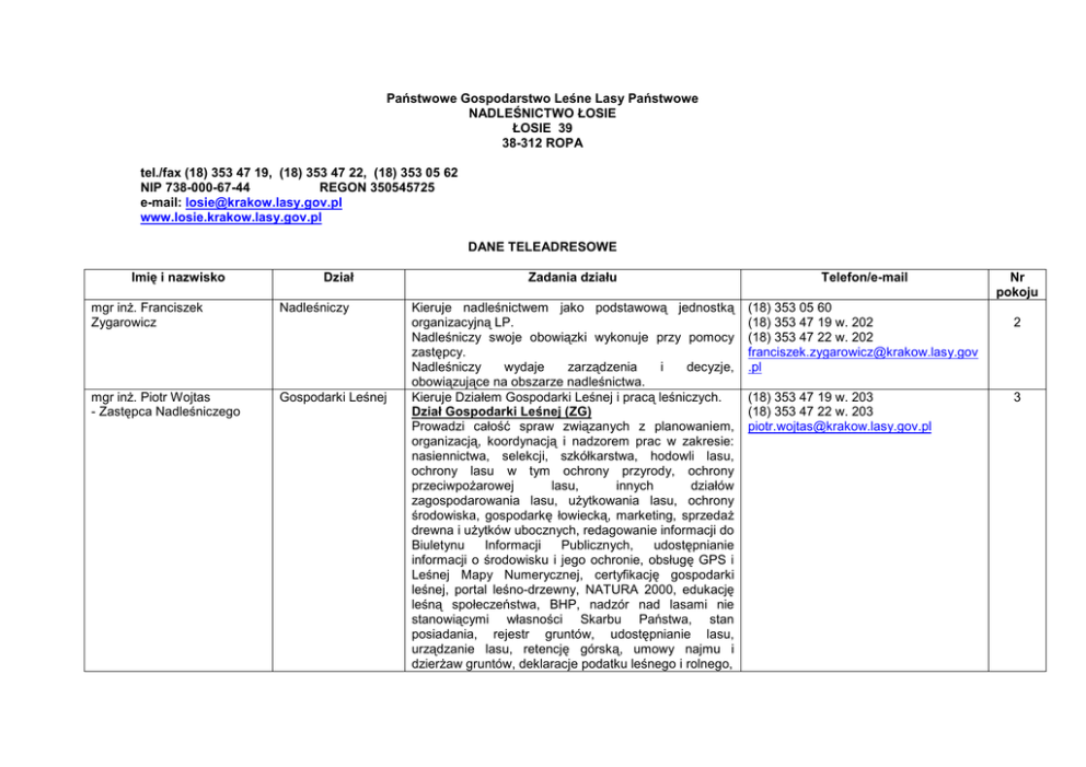 Państwowe Gospodarstwo Leśne Lasy Państwowe NADLEŚNICTWO ŁOSIE ŁOSIE 39 38-312 ROPA tel./fax (18) 353 47 19, (18) 353 47 22, (18) 353 05 62 NIP 738-000-67-44 REGON 350545725 e-mail: [email protected] www.losie.krakow.lasy.gov.pl DANE TELEADRESOWE Imię i nazwisko Dział mgr inŜ. Franciszek Zygarowicz Nadleśniczy mgr inŜ. Piotr Wojtas - Zastępca Nadleśniczego Gospodarki Leśnej Zadania działu Telefon/e-mail Kieruje nadleśnictwem jako podstawową jednostką organizacyjną LP. Nadleśniczy swoje obowiązki wykonuje przy pomocy zastępcy. Nadleśniczy wydaje zarządzenia i decyzje, obowiązujące na obszarze nadleśnictwa. Kieruje Działem Gospodarki Leśnej i pracą leśniczych. Dział Gospodarki Leśnej (ZG) Prowadzi całość spraw związanych z planowaniem, organizacją, koordynacją i nadzorem prac w zakresie: nasiennictwa, selekcji, szkółkarstwa, hodowli lasu, ochrony lasu w tym ochrony przyrody, ochrony przeciwpoŜarowej lasu, innych działów zagospodarowania lasu, uŜytkowania lasu, ochrony środowiska, gospodarkę łowiecką, marketing, sprzedaŜ drewna i uŜytków ubocznych, redagowanie informacji do Biuletynu Informacji Publicznych, udostępnianie informacji o środowisku i jego ochronie, obsługę GPS i Leśnej Mapy Numerycznej, certyfikację gospodarki leśnej, portal leśno-drzewny, NATURA 2000, edukację leśną społeczeństwa, BHP, nadzór nad lasami nie stanowiącymi własności Skarbu Państwa, stan posiadania, rejestr gruntów, udostępnianie lasu, urządzanie lasu, retencję górską, umowy najmu i dzierŜaw gruntów, deklaracje podatku leśnego i rolnego, (18) 353 05 60 (18) 353 47 19 w. 202 (18) 353 47 22 w. 202 [email protected] .pl (18) 353 47 19 w. 203 (18) 353 47 22 w. 203 [email protected] Nr pokoju 2 3 Renata Jędrzejczyk - Główny Księgowy FinansowoKsięgowy inŜ. Marcin Walczyk - Sekretarz AdministracyjnoGospodarczy Krzysztof Dyląg - starszy straŜnik Komendant PSL leśny Posterunek Leśnej StraŜy Aleksandra Bryndza - specjalista ds. pracowniczych Stanowisko ds. pracowniczych mgr inŜ. Adam Bryndza InŜynier Nadzoru Kieruje Działem Finansowo-Księgowym. Dział Finansowo-Księgowy (KF) Prowadzi ewidencję i formalno-rachunkową kontrolę dokumentów, rozliczenia naleŜności i zobowiązań, podatki PIT, VAT, deklaracje rozliczeniowe z ZUS, PFRON itp., plany finansowe, analizy i sprawozdawczość, naliczanie płac, kasa, obsługa bankowa, windykacje wszystkich naleŜności Kieruje Działem Administracyjno-Gospodarczym Dział Administracyjno-Gospodarczy (SA) Prowadzi sprawy związane z pełną obsługą administracyjną nadleśnictwa – ewidencja środków trwałych i wyposaŜenia, amortyzacja, rozliczanie inwentaryzacji składników majątkowych, magazyn i zaopatrzenie, gospodarka transportowa, gospodarka mieszkaniowa, gospodarka remontowo-inwestycja, archiwum, zamówienia publiczne, ubezpieczenia majątkowe, deklaracje podatku od nieruchomości, pozostała sprzedaŜ, ewidencja przychodów i rozchodów magazynowych, BIP NDL, administracja SILP, rozliczenia mandatowe, rejestr pieczęci Zapobieganie i zwalczanie przestępstw i wykroczeń w zakresie szkodnictwa leśnego oraz wykonywanie innych zadań związanych z ochroną mienia pozostającego w zarządzie Lasów Państwowych w zasięgu terytorialnym nadleśnictwa. Prowadzi kancelarię niejawną, zadania z zakresu obronności, magazyn broni. Prowadzi sprawy z zakresu kadr i płac, organizacji, spraw socjalnych, szkoleń, świadczeń pracowniczych (umundurowanie, odzieŜ robocza, deputat opałowy), PKZP, ubezpieczenia społeczne, emerytury i renty, badania okresowe, obsługa sekretariatu Sprawuje kontrolę funkcjonalną w nadleśnictwie prawidłowość wykonywania czynności gospodarczych. Prowadzi skargi i wnioski. (18) 353 47 19 w. 210 (18) 353 47 22 w. 210 [email protected] 10 (18) 353 47 19 w. 206 (18) 353 47 22 w. 206 [email protected] 107 (18) 353 47 19 w. 104 (18) 353 47 22 w. 104 [email protected] 104 (18) 353 47 19 w. 201 (18) 353 47 22 w. 201 [email protected] (18) 353 47 19 w. 209 (18) 353 47 22 w. 209 [email protected] 9