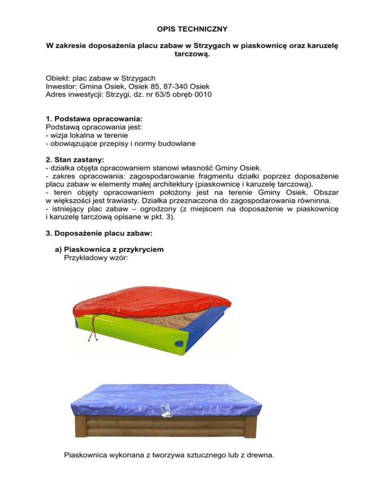 OPIS TECHNICZNY W zakresie doposażenia placu zabaw w Strzygach w piaskownicę oraz karuzelę tarczową. Obiekt: plac zabaw w Strzygach Inwestor: Gmina Osiek, Osiek 85, 87-340 Osiek Adres inwestycji: Strzygi, dz. nr 63/5 obręb 0010 1. Podstawa opracowania: Podstawą opracowania jest: - wizja lokalna w terenie - obowiązujące przepisy i normy budowlane 2. Stan zastany: - działka objęta opracowaniem stanowi własność Gminy Osiek. - zakres opracowania: zagospodarowanie fragmentu działki poprzez doposażenie placu zabaw w elementy małej architektury (piaskownicę i karuzelę tarczową). - teren objęty opracowaniem położony jest na terenie Gminy Osiek. Obszar w większości jest trawiasty. Działka przeznaczona do zagospodarowania równinna. - istniejący plac zabaw – ogrodzony (z miejscem na doposażenie w piaskownicę i karuzelę tarczową opisane w pkt. 3). 3. Doposażenie placu zabaw: a) Piaskownica z przykryciem Przykładowy wzór: Piaskownica wykonana z tworzywa sztucznego lub z drewna. Elementy z tworzywa sztucznego - wykonane z rozdmuchiwanego tworzywa LLDPE barwionego w masie lub równoważne. Wszystkie elementy muszą posiadać certyfikat zgodności z normami EN 71-3, -9, -10, -11 dotyczącymi bezpieczeństwa zabawek. Wszystkie płyty odporne na odbarwienia i promieniowanie UV. Elementy zakończone zaślepkami z tworzywa sztucznego. Elementy z drewna - drewno o przekroju okrągłym, z drewna sosnowego rdzeniowego, toczonego cylindrycznie o średnicy min. 9 cm, impregnowane próżniowo- ciśnieniowo. Specjalistyczne środki ochronne minimalizujące efekt powstawania pęknięć w elementach drewnianych. Farby posiadają atesty higieny wydane przez Państwowy Zakład Higieny. Wymiary piaskownicy co najmniej 300 cm x 300 cm i wysokości co najmniej 30 cm. Przykrycie posiadające odpowiednią wytrzymałość. Wymagania dla piaskownicy: - możliwość pełnego demontażu pokrywy/przykrycia - kształt piaskownicy nieokreślony - brzeg piaskownicy wykończony ławeczkami (miejscem do siedzenia dla dzieci) - wypełnienie piaskownicy piaskiem drobnoziarnistym b) Karuzela tarczowa Przykładowy wzór: Karuzela tarczowa, wymagania: - konstrukcja – stalowa, zabezpieczona antykorozyjnie, malowana lakierem akrylowym/proszkowo - podstawa urządzenia (podest) – blacha aluminiowa, ryflowana (podstawa musi zapewniać zabezpieczenie antypoślizgowe) - wszelkie śruby i mocowania wystawione na działanie warunków zewnętrznych nierdzewne - kotwienie – zgodnie z pkt. 4 opracowania - mechanizm łożyskowy (dla ruchu obrotowego) - średnica karuzeli min. 140 cm, wysokość min. 65 cm - certyfikat zgodności z normą PN-EN 1176 4. Montaż urządzeń Wszystkie urządzenia należy zamocować w fundamencie betonowym (zgodnie z instrukcją montażu urządzeń opracowaną przez producenta). Urządzenia zabawowe na plac zabaw związane z gruntem na stałe, wykonane zgodnie z normą PN - EN 1176 – 1 : 2009 r. oraz 1176 - 3 : 2009 r, przeznaczone dla użytkowników od 3 do 12 roku życia. Urządzenia powinny być wyposażone w kotwy stalowe, które wraz z wszelkimi dolnymi partiami urządzeń powinny być dodatkowo zaimpregnowane ochronnie. Elementy należy zamocować około 60 cm w warstwie betonu B-20 (chyba, że producent określił inną głębokość). Fundamenty betonowe wykonać w postaci stóp fundamentowych o szerokości 30 cm, długości 30 cm oraz głębokości 60 cm (chyba, że producent określił inne wymagania w tym zakresie). 5. Zastosowanie rozwiązań równoważnych. Wyżej wymienione i przedstawione urządzenia zostały zaczerpnięte z oferty różnych firm znajdujących się na rynku. Dopuszcza się wykorzystanie produktów innego producenta pod warunkiem, że będą one równoważne z wyżej wymienionymi. Wyżej wymienione wyposażenie dobrano tak, aby spełniało wymagania norm bezpieczeństwa i posiadało stosowne certyfikaty. Zaleca się, aby montaż urządzeń wykonała firma produkująca lub posiadająca zezwolenie producenta na montaż danych urządzeń. Ilustracje oraz określone nazwy przedstawione w powyższym opisie mają charakter poglądowy i obrazują elementy placów zabaw, jakie spodziewa się uzyskać Zamawiający. Akceptowane będą również elementy placów zabaw, które spełniać będą takie same funkcje i parametry.